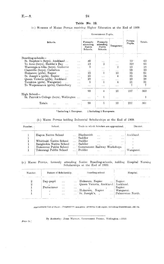 Table No. 12. (a.) Number of Maori Pupils receiving Higher Education at the End of 1909.