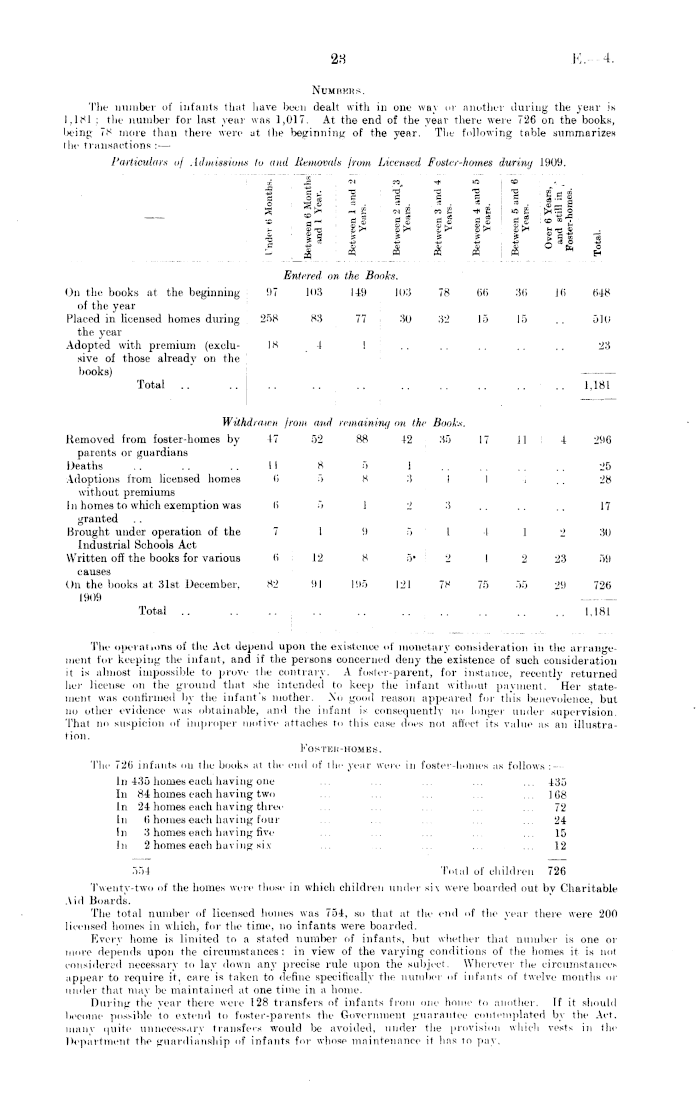 Numbers. The uuinber of infante thai have been dealt with in oik: w a \ or another (lining the year is 1,181 : the number for last year was 1,017. At the end of the year there were 726 on the books, being 78 more than there were Lit the beginning of the year. The Following tnble summarizes the transactions : Particulars oj Admissions to and Removals iron/ Licensed Foster-homes duriny 1909. ,; J: -M », -t ir. . cc ! |i 1. 1. i. I. I. if I I 1 I* I* J* I* I* Hi * Enteral Oti the Books. On the books at the beginning 97 LO3 149 103 IX 66 36 I<> 648 of the year Placed in licensed homes during 258 83 77 30 32 15 15 .. 510 the year Adopted with premium (exclu- 18 4 ! .. .. .. .. .. 23 sive of those already on the books) Total .. .. .. .. .. 1,181 Withdrawn from and remaining on the Books. Removed from foster-homes by 17 r>2 88 42 35 17 II 4 296 patents or guardians Deaths .. .. .. II 8 5 1 25 Adoptions from licensed homes 6 5 8 .'! I I t .. 28 without premiums In homes to which exemption was l> 5 I 2 '■'< .. .. .. 17 granted Brought under operation of the 7 1 '.I 5 1112 30 Industrial Schools Act Written off the books for various l> 12 8 5 1 2 I 2 23 59 causes On the hooks at 31st December, 82 91 195 121 78 75 55 29 726 1909 Total .. .. .. .. .. 1.181 The operations of the Ait depend upon the existence of monetary consideration in the arrange inent for keeping the infant, and if the persons concerned deny the existence of such consideration it is almost impossible to prove the contrary. A foster-parent, for instance, recently returned her license on the ground thai she intended to keep the infant without payment. Her statement was confirmed by the infant's mother. No good reason appeared for this benevolence, but no other evidence was obtainable, and the infant is consequently m> longer under supervision. That mi suspicion of improper motive attaches to this case dors noi affect its value as an illustral ion. Foster-homes. The 72(i infants on the books at the end of the year were in foster-homes as follows : In 436 homes each having one ... ... ... ... ... 435 In 84 homes each having two ..: ... ... ... ... 168 In 24 homes each having three ... ... ... ... ... 72 In 6 homes each having four ... ... ... ... ... 24 In 3 homes each having five ... ... ... ... ... 15 In 2 homes each having sis ... .. ... 12 554 Total of children 726 Twenty-two of the homes were those in which children under si\ were boarded out by Charitable Aid Boards. The total number of licensed homes was 754. so that at the end of the year there were 200 licensed homes in which, for the time, no infants were boarded. Every home is limited to a stated number of infants, but whether that Dumber is one or more depends upon the circumstances: in view of the varying conditions of the homes it is not considered necessary to lay down any precise rule upon the subject. Wherever the circumstances appear to require it, care is taken to define specifically the number of infants of twelve months or under that may be maintained at one time in a home. During the year there were 128 transfers of infants from one home to another. If it should become possible to extend to foster-parents the Government guarantee contemplated by the Act, many quite unnecessary transfers would be avoided, under the provision which vests in the Department the guardianship of infants for whose maintenance it has to pay,