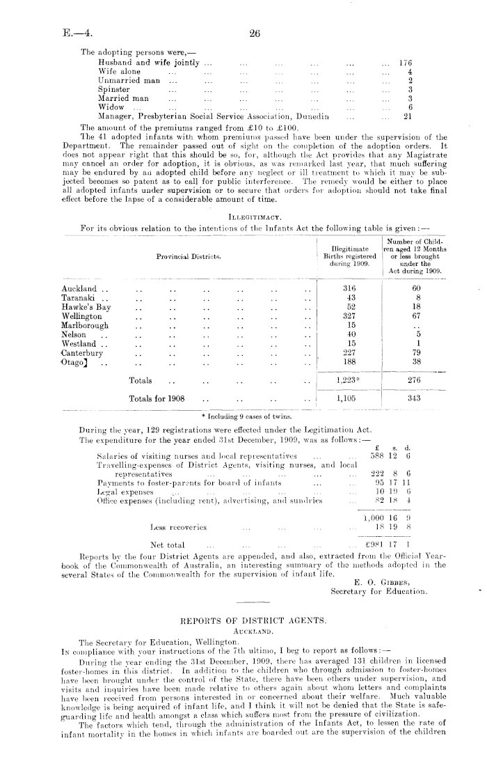 During the year, 129 registrations were effected under the Legitimation Act. The expenditure for the year ended 31st December, 1909, was as follows: — £ s. d. Salaries of visiting nurses and local representatives ... ... 588 12 6 Travelling-expenses of District .Agents, visiting nurses, and local representatives ... ... ... ... ... 222 8 6 Payments to foster-parents for board of infants ... ... 95 17 11 Legal expenses ... ... ... ... ... ... 10 19 ti Office expenses (including rent), advertising, and sundries ... 82 18 4 1,000 16 9 Less recoveries ... ... ... ... 1S 19 8 Net total ... ... ... £981 17 1 Reports by the four District Agents are appended, and also, extracted from the Official Yearbook of the Commonwealth of Australia, an interesting summary of the methods adopted in the several States of the Commonwealth for the supervision of infant life. E. O. Gibbes, Secretary for Education. REPORTS OF DISTRICT AGENTS. Auckland. The Secretary for Education, Wellington. In compliance with your instructions of the 7th ultimo, I beg to report as follows: — During the year ending the 31st December, 1909, there has averaged 131 children in licensed foster-homes in this district. In addition to the children who through admission to foster-homes have been brought under the control of the State, there have been others under supervision, and visits and inquiries have been made relative to others again about whom letters and complaints have been received front persons interested in or concerned about their welfare. Much valuable knowledge is being acquired of infant life, and I think it will not be denied that the_ State is safeguarding life and health amongst a class which suffers most from the pressure of civilization. The factors which tend, through the administration of the Infants Act, to lessen the rate of infant mortality in the homes in which infants are boarded out are the supervision of the children