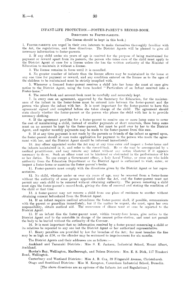 INFANT-LIFE PROTECTION.—FOSTER-PARENT'S RECORD-BOOK. Directions to Foster-parents. (The license should be kept in this book.) 1. Foster-parents are urged in their own interests to make themselves thoroughly familiar with the Act, the regulations, and these directions. The District Agents will be pleased to give all necessary information to foster-parents. 2. If any child under six years of age is received for the purpose of being maintained for payment or reward apart from its parents, the person who takes care of the child must apply to the District Agent at once for a license unless she has the written authority of the Minister of Education to maintain it without a license. 3. The license remains in force until it is cancelled. 4. No greater number of infants than the license allows may be maintained in the home at any one time for payment or reward, and any condition entered on the license as to the ages of the children to be maintained must be strictly complied with. 5. Whenever a licensed foster-parent receives a child into her home she must at once give notice to the District Agent, using the form headed " Particulars of an Infant received into a Foster-home." 6. The record-book and account-book must be carefully and accurately kept. 7. In every case an agreement, approved by the Secretary for Education, for the maintenance of the infant in the foster-home must be entered into between the foster-parent and the person who places the infant with her. It is most important for the foster-parent to have this agreement signed and completed before she takes charge of the child. The agreement should state clearly whether the foster-parent or the person who places the child with her is to provide necessary clothing. 8. If the agreement provides for a foster-parent to receive one or more lump sums to cover the cost of maintaining a child, instead of smaller payments at short intervals, these lump sums must on no account be kept by the foster-parent, but must be paid over by her to the District Agent, and regular monthly payments may be made to the foster-parent from this sum. 9. If at any time payment is not made by the parents or friends of the infant as agreed upon, the foster-parent should at once make application for payment to the person who made the agreement with her, and the District Agent should be informed immediately. 10. Any officer appointed under the Act may at any time enter and inspect a foster-home and the infants maintained in it, and refer to the record-book. He or ehe may lie accompanied by i medical practitioner, and may remove any infant wit limit any notice whatever if it appears necessary to do so. Such an officer must not lie hindered or obstructed in the performance of his or her duties. No one except a Government officer, a lady Local Visitor, or some one who holds authority from the Education Department or the District Agent is authorized to visit, enter, or inspect a foster-home or examine the foster-parent's hooks. 11. Foster-parents must comply with the directions given by the District Agent or her representative. 12. No child, whether under or over six years of age. may lie removed from a foster-home without the authority of some person appointed under the Act, and the foster-parent must not permit any such child to be removed without obtaining authority. The person removing a child must sign the foster-parent's record-book, giving the date of removal and stating the condition of the child at that time. 13. A foster-parent may not remove a child from one place of residence to another without obtaining consent beforehand from the District Agent. 14. If an infant require medical attendance the foster-parent shall, if possible, communicate with the parent or guardian immediately, but if the matter l>e urgent, she must, upon her own responsibility, obtain medical aid. The occurrence of illness must at once he reported to the District Agent. 10. If an infant dies the foster-parent must, within twenty-four hours, give notice to the District Agent and to the constable in charge 'if the nearest police-station, ami must not permit the body to be buried without the authority of the Coroner. 16. It is most important that no information received by a foster-parent concerning a child or its relatives be repeated to any one but the District Agent or her authorized representative. 17. Heavy penalties are provided by law for breaches of the Act: for most breaches the tine may be as high as £50, or the offender may be sentenced to imprisonment for six months. The District Agents and their addresses are as follows :— Auckland and Taranaki Districts : Miss S. E. Jackson, Industrial School, Mount Albert, Auckland. Hawke's Bay, Wellington, Marlborough, and Nelson Districts: Mrs. E. S. Dick, 117 Tinakori Road, Wellington. Canterbury and Westland Districts: Miss A. B. Cox, 39 Fitzgerald Avenue, Christchurch. Otago and Southland Districts : Miss M. Kempton, Caversham Industrial School, Dunedin. [The above directions are an epitome of the Infants Act and Regulations.]