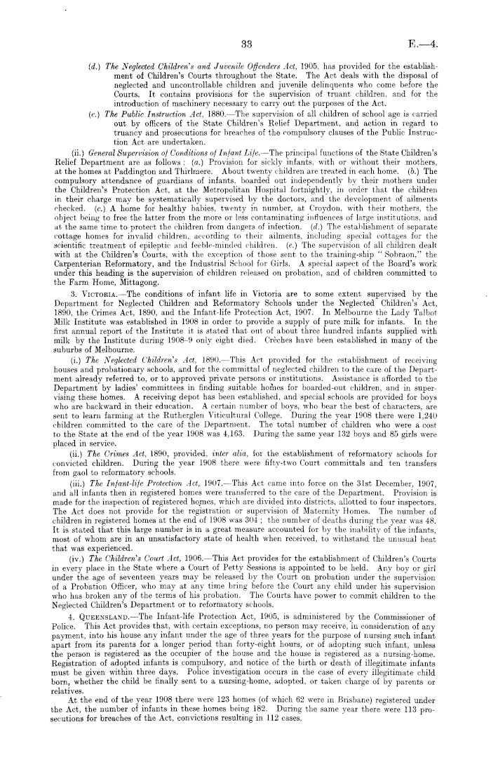(d.) The Neglected Children's and Juvenile Offenders Act, 1905, has provided for the establishment of Children's Courts throughout the State. The Act deals with the disposal of neglected and uncontrollable children and juvenile delinquents who come before the Courts. It contains provisions for the supervision of truant children, and for the introduction of machinery necessary to carry out the purposes of the Act. (p.) The Public Instruction Act, 1880. —The supervision of all children of school age is carried out by officers of the State Children's Relief Department, and action in regard to truancy and prosecutions for breaches of the compulsory clauses of the Public Instruction Act are undertaken. (ii.) General Supervision of Conditions of Infant Life. —The principal functions of the State Children's Relief Department are as follows : (a.) Provision for sickly infants, with or without their mothers, at the homes at Paddington and Thirlmere. About twenty children are treated in each home, (b.) The compulsory attendance of guardians of infants, boarded out independently by their mothers under the Children's Protection Act, at the Metropolitan Hospital fortnightly, in order that the children in their charge may be systematically supervised by the doctors, and the development of ailments checked, (c.) A home for healthy babies, twenty in number, at Croydon, with their mothers, the object being to free the latter from the more or less contaminating influences of large institutions, and at the same time to protect the children from dangers of infection. (</.) The establishment of separate cottage homes for invalid children, according to their ailments, including special cottages for the scientific treatment of epileptic and feeble-minded children, (c.) The supervision of all children dealt with at the Children's Courts, with the exception of those sent to the training-ship " Sobraon," the Carpenterian Reformatory, and the Industrial School for Girls. A special aspect of the Board's work under this heading is the supervision of children released on probation, and of children committed to the Farm Home, Mittagong. 3. Victoria. —The conditions of infant life in Victoria are to some extent supervised by the Department for Neglected Children and Reformatory Schools under the Neglected Children's Act, 1890, the Crimes Act, 1890, and the Infant-life Protection Act, 1907. In Melbourne the Lady Talbot Milk Institute was established in 1908 in order to provide a supply of pure milk for infants. In the first annual report of the Institute it is stated that out of about three hundred infants supplied with milk by the Institute during 1908-9 only eight died. Creches have been established in many of the suburbs of Melbourne. (i.) The Neglected Children's Act, 1890.—This Act provided for the establishment of receiving houses and probationary schools, and for the committal of neglected children to the care of the Department already referred to, or to approved private persons or institutions. Assistance is afforded to the Department by ladies' committees in finding suitable homes for boarded-out children, and in supervising these homes. A receiving depot has been established, and special schools are provided for boys who are backward in their education. A certain number of boys, who bear the best of characters, are sent to learn farming at the Rutherglen Viticultural College. During the year 1908 there were 1,240 children committed to the care of the Department. The total number of children who were a cost to the State at the end of the year 1908 was 4,163. During the same year 132 boys and 85 girls were placed in service. (ii.) The Crimes Act, 1890, provided, inter alia, for the establishment of reformatory schools for convicted children. During the year 1908 there were fifty-two Court committals and ten transfers from gaol to reformatory schools. (iii.) The Infant-life Protection Act, 1907.—This Act came into force on the 31st December, 1907, and all infants then in registered homes were transferred to the care of the Department. Provision is made for the inspection of registered hojnes, which are divided into districts, allotted to four inspectors. The Act does not provide for the registration or supervision of Maternity Homes. The number of children in registered homes at the end of 1908 was 304 ; the number of deaths during the year was 48. It is stated that this large number is in a great measure accounted for by the inability of the infants, most of whom are in an unsatisfactory state of health when received, to withstand the unusual heat that was experienced. (iv.) The Children's Court Act, 1906.—This Act provides for the establishment of Children's Courts in every place in the State where a Court of Petty Sessions is appointed to be held. Any boy or girl under the age of seventeen years may be released by the Court on probation under the supervision of a Probation Officer, who may at any time bring before the Court any child under his supervision who has broken any of the terms of his probation. The Courts have power to commit children to the Neglected Children's Department or to reformatory schools. 4. Queensland. —The Infant-life Protection Act, 1905, is administered by the Commissioner of Police. This Act provides that, with certain exceptions, no person may receive, in consideration of any payment, into his house any infant under the age of three years for the purpose of nursing such infant apart from its parents for a longer period than forty-eight hours, or of adopting such infant, unless the person is registered as the occupier of the house and the house is registered as a nursing-home. Registration of adopted infants is compulsory, and notice of the birth or death of illegitimate infants must be given within three days. Police investigation occurs in the case of every illegitimate child born, whether the child be finally sent to a nursing-home, adopted, or taken charge of by pare
