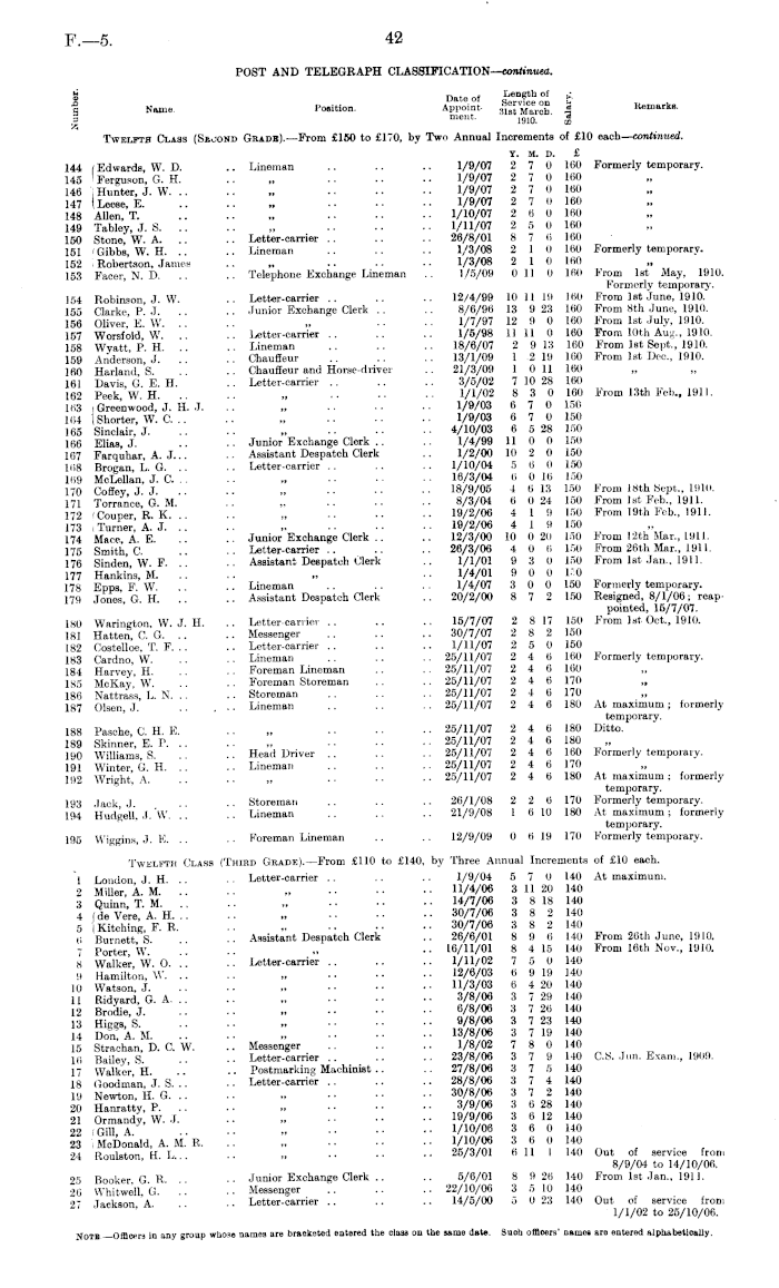 POST AND TELEGRAPH CLASSIFICATION— continued. % Date of Length of £ I Name Position. Appoint- 2 Remarks, a ment. w • a Twelfth Class (Thied Grade). —From £110 to £140, by Three Annual Increments of £10 each. ■Sorters. y. m. i>. £ 1 Carter, T. R. .. .. Sorter .. .. .. 1/1/06 4 3 0 130 2 Treacy, J. P. .. „ .. .. .. 2/4/03 6 1129 130 Prom 11th Mar., 1911. 3 Graham, W. L. .. .. „ .. .. .. 1/9/04 5 7 0 120 From 27th May, 1910. 4 Gannaway, C. H. .. „ .. .. .. 4/2/10 0 12") 120 From 4th Feb., 1911. Twelfth Class (Fourth Grade). —From £50 to £100, by Five Annual Increments of £10 each. Sorters. 1 Sullivan, C. .. .. Sorter .. .. .. 21/2/05 5 1 8 100 2 Pain, H. R. .. „ .. .. .. 1/3/07 3 1 0 100 From let Mar., 1911. 3 McLeod, H. D. .. ~ .. .. .. 1/7/07 2 9 0 90 From Ist July, 1910. 4 Brown, G. O. .. .. .. .. •• 14/12/07 2 318 90 From 14th Dei-., 1910. Twelfth Class (Second Grade). —From £150 to £170, by Two Annual Increments of £10 each. 1 Rae, J. .. .. Letter-oarrier .. .. .. 17/6/93 16 10 15 170 2 Rowe, R. J. .. .. Lineman .. .. .. 1/1/75 35 3 0 170 3 Louiason, W. W. .. „ .. .. .. 1/5/77 32 11 0 170 4 Clarkson, G. H... .. Letter-carrier .. .. .. 15/5/77 32 10 17 L7O 5 O'Brien, P. F. .. .. Lineman .. .. .. 18/6/77 32 913 17<» 6 McKenzie, J. A. .. „ .. .. .. 23/12/77 32 3 9 170 7 Seward, W. H. .. .. Nightwatehinan .. .. 1/5/78 31 11 0 170 8 Anthony, T. .1... .. Letter-carrier .. .. .. 13/11/78 31 418 170 9 Thomas, H. .. .. Messenger .. .. .. 1/1/79 31 3 0 170 10 Jackson, R. .. .. Lineman .. .. .. 1/2/80 30 2 0 170 II Batkin, L. R. .. .. „ .. .. .. 1/2/86 24 2 0 170 12 Paterson, G. S. .. .. Letter-carrier .. .. .. 1/9/81 28 7 0 170 13 Rosie, S. B. .. .. Lineman .. .. .. 1/2/95 15 2 0 170 14 Findlay, J. A. .. .. „ .. .. .. 1/2/95 15 2 0 170 15 McGrath, Jamee .. „ .. .. .. 1/2/95 15 2 0 170 16 Bagshaw, D. S. .. .. „ .. .. .. 1/2/95 15 2 0 170 17 Wait, J. .. .. „ .. .. .. 1/8/95 14 8 0 170 18 Bellingham, VV. .. .. Letter-carrier .. .. .. 26/10/82 27 ."> 8 L7O 19 Brown, W. W. .. .. Lineman .. .. .. 1/2/95 15 2 0 170 20 Mulrooney, W. J. .. Letter-carrier .. .. .. 1/11/83 26 5 0 170 21 Shoard, E. H. .. .. „ .. .. .. 1/7/84 25 9 0 170 22 Evans, William Edward .. „ .. .. .. 1/9/82 27 7 0 170 23 Newton, W. R. .. .. Lineman .. .. .. 1/9/83 26 7 0 17" 24 Webber, H. G. .. .. „ .. .. .. 1/2/84 26 2 0 170 25 Stewart, J. .. .. „ .. .. .. 1/2/95 15 2 0 170 26 Fletcher, W. R... .. Senior Messenger .. .. 1/1/87 23 3 0 170 27 Carrick, P. H. .. .. Mail-bag Maker .. .. 21/1/87 23 211 170 28 Wootton, J. W... .. Messenger .. .. .. 14/3/87 23 018 170 29 Wilson, S. N. B. .. Lineman .. .. .. 1/2/95 15 2 0 170 30 Fyson, A. J. .. .. Letter-carrier .. .. .. 1/5/79 22 1 1 170 Out of service from 31/10/82 to 1/6/83, • and from 14/12/84 to 13/2/93. 31 Childerhouse, J. R. .. „ .. .. .. 1/7/87 22 9 0 170 32 McArthur, H. .. .. „ .. .. .. 23/7/88 218 9 170 33 McGill, H. H. .. .. Messenger .. .. .. 1/6/89 20 10 0 170 34 Finch, T. W. .. .. Lineman .. .. .. 1/8/96 13 8 0 170 35 Hume, J. A. .. „ .. .. .. 18/10/96 13 514 170 36 Hawthorn, M. W. .. „ .. .. .. 1/2/00 10 2 0 170 37 Parmenter, G. H. .. „ .. .. .. 1/4/00 10 0 0 170 38 Brock, H. G. o. .. „ .. .. .. 1/10/00 B 8 0 170 39 Millar, W. M. .. .. Letter-carrier .. .. .. 1/3/91 19 1 0 170 , 40 Jordan, T. A. .. .. Junior Exchange Clerk .. .. 1/3/92 18 1 0 170 41 Hodgen, A. .. .. Lineman .". .. .. 1/8/00 9 8 0 170 42 Fitzsimmons, J. N .. .. .. 1/7/03 6 9 0 170 43 Clare, C , 25/9/91 18 0 6 170 44 Bowley, B. J. .. .. „ .. .. .. 1/2/95 15 2 0 170 45 DeCourcy, J. .. .. „ .. .. .. 1/2/95 15 2 0 170 46 Burrell, W „ 21/8/95 14 7 11 170 47 Stephenson, W. H. .. „ .. .. .. 1/5/99 10 11 0 170 48 Newson, H. H. .. .. „ .. .. .. 1/2/00 10 2 0 170 49 Colvin, D. .. .. „ .. .. .. 1/7/03 « 9 0 170 50 Fleming, P. P. .. .. Letter-carrier .. .. .. 12/12/91 18 320 170 51 Dabinett, A. E. H. .. Lineman .. .. .. 1/7/05 4 9 0 170 52 Sargeant, C 1/7/03 6 9 0 170 53 O'Sullivan, D. .. .. „ .. .. .. 1/7/03 6 9 0 170 54 Storov, F. R. .. .. Letter-earner .. .. .. 10/1/93 17 222 170 55 Coad, A „ 12/1/93 17 220 170 56 Cassells, B. J „ 20/12/92 17 3 5 170 57 McQueen, G. E. .. „ .. .. .. 1/6/93 10 10 0 170 58 Connell, VV. .. .. Messenger .. .. .. 1/1/95 15 3 0 170 59 Mclntosh, P. W. .. Letter-carrier .. .. .. 17/4/95 14 11 15 170 60 Dickson, W „ 13/2/95 15 1 14 170 61 Aldridge, G. b .. .. Lineman (Postmaster) .. .. 1/4/02 8 0 0 170 62 Rush, F. B. .. .. „ .. .. 1/7/03 6 9 0 170 Note. —Wfflcers in any group whose names are bracketed entered the class on the same date. Such officers' names are entered alphabetically.