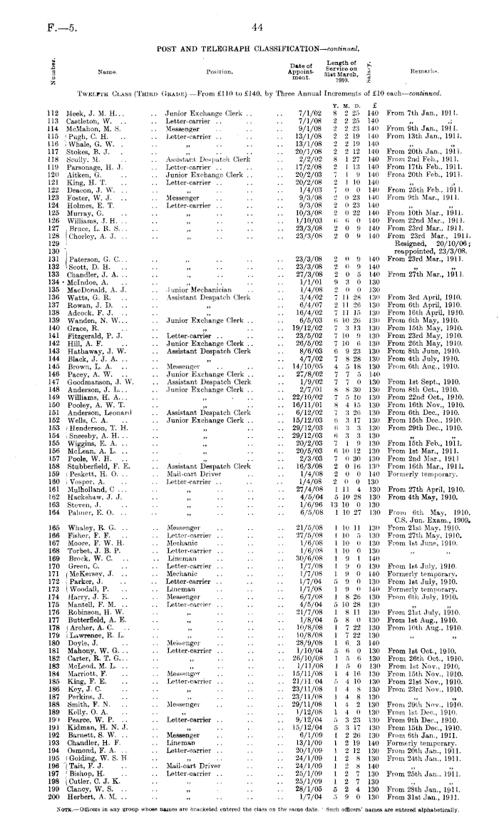 POST AND TELEGRAPH CLASSIFICATION— continued. j> D»teof Length of £ I Nriuh. Position. Appoint- mftMMoh $ Remarks. a ment. ' 1910 ' * I w ki.fi h Class (Third Qradb). —From £110 to £140. by Three Annual Increments of £10 each— continued. Y. M. D. £ 112 Meek, J. M. H... .. Junior Exchange Clerk .. .. 7/1/02 S 2 2fi 140 From 7th Jan., 1911. 113 Castletoh, W. .. .. Letter-carrier .. .. .. 7/1/08 2 225 140 114 McMahon, M. S. .. Messenger .. .. .. 9/1/08 2 223 140 From 9th Jan., 1911. 115 iPugh, C. H. .. .. Letter-oarrier .. .. .. 13/1/08 2 219 140 From 13th Jan., 1911. 116 (Whale, G. W. . .. „ ~ .. .. 13/1/08 2 219 140 117 Stokes, B. J. . .. „ .. .. .. 20/1/08 2 212 140 From 20th Jan., 1911. 118 Scully, M. .. .. Assistant Deepatoh Clerk .. 2/2/02 8 127 140 From 2nd Fob., 1911. 119 Parsonage, H. J. .. Letter-carrier .. .. .. 17/2/08 2 113 140 From 17th Feb.. 1911. 120 Aitken, G. .. .. Junior Exchange Clerk .. .. 20/2/03 7 1 9 140 From 20th Feb., 1911. 121 King, H. T. .. .. Letter-carrier .. .. .. 20/2/08 21 10 140 122 Deacon, J. W. .. .. „ .. .. .. 1/4/03 7 II 0 140 From 25th Feb.. 1911. 123 Foster, W. J. .. .. Messenger .. .. .. 9/3/08 2 023 140 From 9th Mar., J 9ll. 124 Holmes, E. T. .. Letter-carrier .. .. .. 9/3/08 2 023 140 „ „ 125 Murray, G. .. .. „ .. .. .. 10/3/0R 2 022 140 From 10th Mar., 1911. 126 Williams, J. H. .. .. „ .. .. .. 1/10/03 6 6 0 140 From 22nd Mar., 1911. 127 Bruce. L. R. 5... .. „ .. .. .. 23/3/08 2 0 i) 140 From 23rd Mar.. 1911. 128 I Chorlcy, A. J. .. .. „ .. .. .. 23/3/08 2 0 H 140 From 23rd Mar., 1911. 129 i Resigned, 20/10/06; 130 reappointed, 23/3/08. 131 Paterson, G. C... .. „ .. .. .. 23/3/08 2 0 9 140 From 23rd M»r., 1911. 132 Scott, D. H. .. .. „ .. .. .. 23/3/08 2 0 9 140 133 Chandler, J. A. .. .. ~ .. .. .. 27/3/08 2 0 5 140 From 27th Mar., 1911. 134 • Mclndoe, A. .. „ .. .. .. 1/1/01 9 3 0 130 135 Mac Donald, A. .1. .. 1 unior Mechanician .. .. 1/4/08 2 0 0 130 136 Watts, G. R. .. .. Assistant Despatch Clerk .. 3/4/02 7 1128 130 From 3rd April, 1910. 137 Rowan, J. D. .... „ .. 6/4/07 211 26 130 From 6th April, 1910. 138 Adcock, F. J. .... „ .. 16/4/02 711 16 130 From 16th April, 1910. 139 Wanden, N. Vi... .. Junior Exchange Clerk .. .. 6/5/03 II 10 20 130 From 6th May, 1910. 140 Grace, R. .. .. „ .. .. 19/12/02 7 :? 13 130 From 15th May, 1910. 141 Fitzgerald, P. J. .. Letter-carrier .. .. .. 23/5/02 710 •> 130 From 23rd May, 1910. 142 Hill, A. F. .. .. Junior Exchange Clerk .. .. 26/5/02 710 6 130 From 26th May, 1910. 143 Hathaway, J. W. .. Assistant Despatch Clerk .. 8/6/03 (i !) 23 130 From Bth June, 1910. 144 Black, J. J. A. .. .. „ .. 4/7/02 7 828 130 From 4th July, 1910. 145 Brown, L. A. .. .. Messenger .. .. .. 14/10/05 4 ."> is 130 From Oth Aug., 1910. 146 Pacey, A. W. .. .. Junior Exchange Clerk .. .. 27/8/02 7 7 f> 140 147 Goodmanson, J. W. .. Assistant Despatch Clerk .. 1/9/02 7 7 0 130 From Ist Sept., 1910. 148 Anderson, J. L... .. Junior Exchange Clerk .. .. 2/7/01 8 830 130 From Bth Oct., 1910. 149 Williams, H. A... .. „ ... .. 22/10/02 7 510 L3O From 22nd Oct., 1910. 150 Pooley, A. W. T. .. „ .. .. 16/11/01 8 415 130 From 16th Nov., 1910. 151 Anderson, Leonon I .. Assistant Despatch Clerk .. 6/12/02 7 320 130 From Oth Dec, 1910. 152 Wells, C. A. .. .. Junior Exchange Clerk .. .. 15/12/03 (> 317 130 From 15th Dec. 1910. 153 i Henderson, T. H. .. „ .. .. 29/12/03 (i :! 3 130 From 29th Dec, 1910. 154 , Sneesby, A. H. .. .. „ .. .. 29/12/03 t> :! :\ 130 155 Wiggins, E. A. .. .. „ .. .. 20/2/03 7 1 9 130 From 15th Feb., 1911. 156 McLean. A. L. .. .. . „ .. .. 20/5/03 RlO 12 130 From Ist Mar., 1911. 157 Poole, W. H. .. .. „ .. .. 2/3/03 7 030 180 From 2nd Mar., 1911 158 Stubberfield, F. E. .. Assistant Despatch Clerk .. 16/3/08 2 0 ll> 130 From 16th Mar., 1911. 159 i Peskett, H. O. .. .. Mail-cart Driver .. .. 1/4/08 2 0 0 140 Formerly temporary. 160 i Vospcr. A. .. .. Letter-oarrier .. .. .. 1/4/08 2 0 0 130 161 }[ u lholland, C ... .. „ .. .. .. 27/4/08 111 4 130 From 27th April, 1910. 162 Hackshaw, J. J. .. „ .. .. .. 4/5/04 510 28 130 From 4th May, 1910. 163 Steven. .I. .. .. „ .. .. .. 1/6/96 13 10 0 130 164 Palmer, K. O. .. .. „ .. .. .. 6/5/08 110 27 130 From 6th May, 1910. C.S. Jun. Exam., 1909. 165 Whaloy, R. G. .. .. Messenger .. .. .. 21/5/08 110 11 130 From 21st May. 1910. 166 Fieher, P. P. .. .. Letter-carrier .. .. .. 27/5/08 110 5 130 From 27th May, 1910. 167 Moore. F. W. H. .. Mechanic .. .. .. 1/6/08 I )0 o 130 From let June, 1910. 168 Torbot. J. B. P. .. Letter-oarrier .. .. .. 1/6/08 110 0 130 169 Brook. W. C. .. .. Lineman .. .. .. 30/6/08 1 9 1 140 170 Green, C. .. .. Letter-carrier .. .. .. 1/7/08 1 9 0 130 From Ist July, 1910. 171 ( McKersey, J. .. .. Mechanic .. .. .. 1/7/08 1 9 0 140 Formerly temporary. 172 i Parker, j. .. .. Letter-carrier .. .. .. 1/7/04 59 0 130 From Ist July, 1910. 173 I Woodall, P. .. .. Lineman .. .. .. 1/7/08 1 <l 0 140 Formerly temporary. 174 Harry, J. E. .. .. Messenger .. .. .. 6/7/08 1 826 130 From 6th July, 1910. 175 Mantell, F. M. .. .. Utter-carrier .. .. .. 4/5/04 510 28 130 „ „ 176 Robinson, H. W. .. ~ .. .. .. 21/7/08 1 811 130 From 21st July, 1910. 177 Butterfield, A. E. .. „ .. .. .. 1/8/04 5 8 0 130 From Ist Aug., 1910. 178 (Archer, A. C. .. .. „ .. .. .. 10/8/08 I 722 130 From 10th Aug., 1910. 179 I Lawrence, R. L. .. „ .. .. .. 10/8/08 1 722 130 180 Doyte, J. .. .. Mei*enger .. .. .. 28/9/08 1 6. 3 140 181 Mahony. W. G. .. .. Letter-carrier .. .. .. 1/10/04 5 6 0 130 From Ist Oct., 1910. 182 Carter,"R. T. G... .. „ .. .. .. 26/10/08 1 r> 6 130 From 26th Oct., 1910. 183 VlcLeod, M. L. .. .. „ .. .. .. 1/11/08 I r> 0 130 From let Nov., 1910, 184 Marriott, P. .. .. Messenger .. .. .. 15/11/08 I 4Hi 130 From 15th Nov., 1910. 185 King, F. E. .. .. Letter-carrier .. .. .. 21/11/04 5 410 130 From 21st Nov., 1910. 186 Key, J. C. .. .. „ .. .. .. 23/11/08 I 4 8 130 From 23rd Nov., 1910. 187 Perkins, J. .. ..