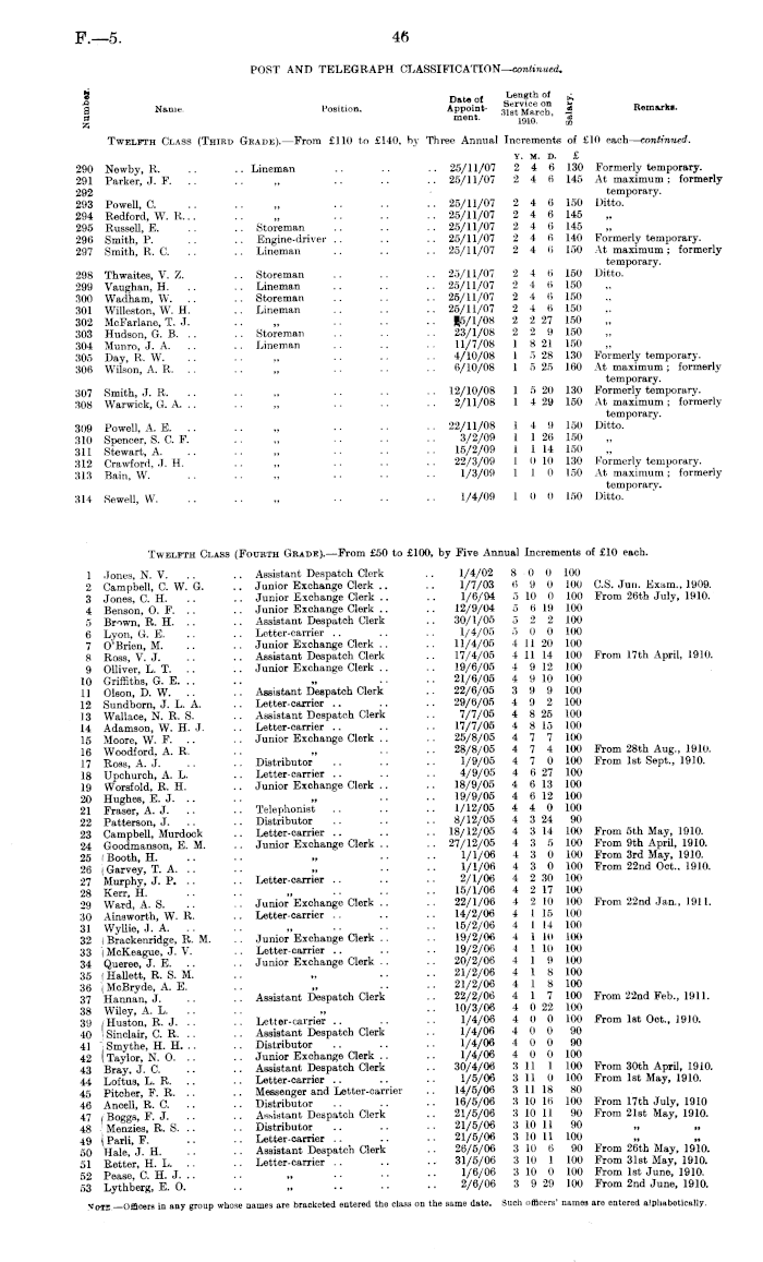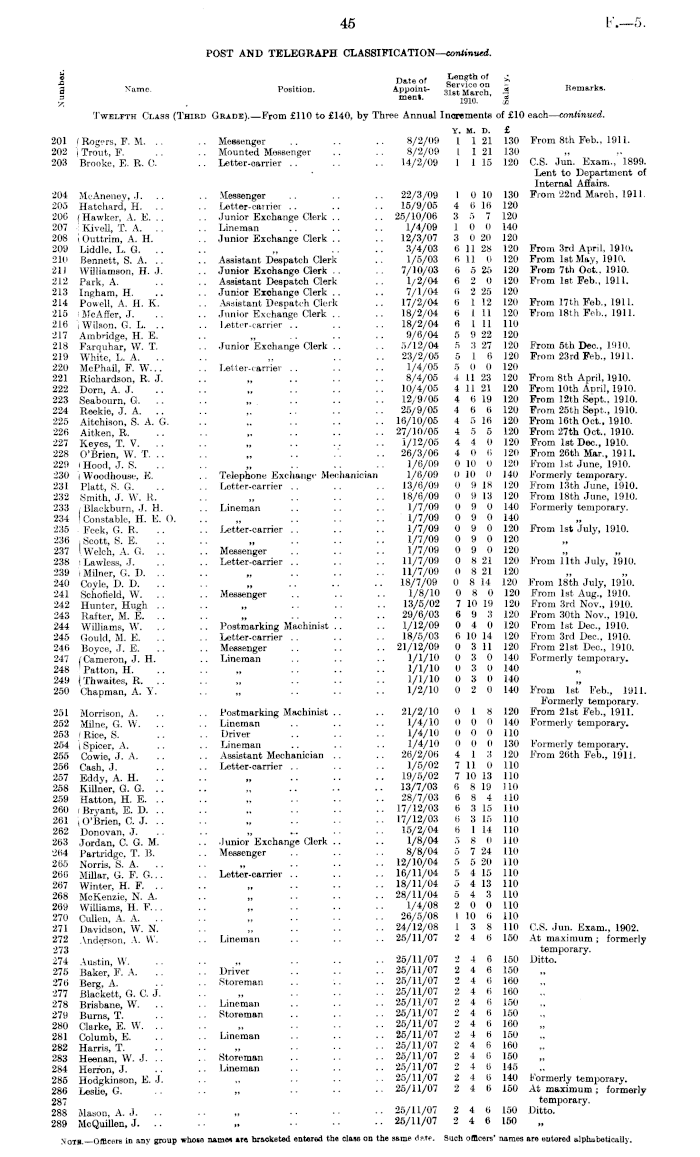 POST AND TELEGRAPH CLASSIFICATION— continued. $ Date of Length of £ N«ne. Pcition. Appoint- "Sfeg, 5 ■»»*. o nient. 19]0 j< Twelfth Class (Second Grade). —From £150 to £171), by Two Annual Increments of £10 each— continued. r. M. d. £ 63 Bush, F.H. .. .. Letter-oarrier .. .. .. 4/9/99 10 628 160 64 Davey, W. H. .. .. Head Messenger .. .. 2/10/04 5 530 170 65 Watson, J. W. .. .. Letter-carrier .. .. .. 1/5/96 13 II 0 170 From Ist May, 1910. 66 .Banner, C. A. .. .. Lineman .. .. .. 1/9/07 2 7 0 170 Formerly tenv>;,rary. 67 Condon, T. .. .. ~ .. .. .. 1/9/07 2 7 0 170 08 Hopkins, H. J. .. .. „ .. .. .. 1/9/07 2 7 0 170 From Ist Sept., 1910. Formerly temporary. 69 McKenzie. R. J. .. ~ .. .. .. 1/9/07 2 7 0 170 Formerly temporary. 70 O'Brien, E. A. .. .. „ .. .. .. l/U/07 2 7 0 170 71 Quin, J. 1/9/07 2 7 0 170 72 Wylie, J 1/9/07 2 7 0 170 73 'Campbell, B. .. .. .. .. .. .. 1/11/07 2 B 0 170 74 I McKenzie, J. H. .. Lineman «,:id Mechanician .. 1/11/07 2 8 0 170 From Ist Nov., I'JIO. Formerly temporary. 75 Hathaw.iy, L. L. .. Assistant Exohange Clerk .. 8/2/95 14 121 170 Prom Bth Feb., 1911. 76 Mclntosh, J. .. .. Lineman .. ..' .. 1/3/08 2 I 0 170 From Ist Mar.. 1911 Formerly temporary. 77 Bevoridge, P. I). .. Mechanician .. .. .. 1/4/08 2 0 0 170 78 Henry, D. .. .. Lineman .. .. .. 1/5/08 111 (> 170 Formerly temporary. 79 Stewart, John .. .. Senior Lineman .. .. 30/6/08 I 9 I 170 80 /Flaunty, C. A. .. .. Mechanician .. .. .. 1/7/08 1 9 () 170 Formerly temporary. 81 I Leonhardt, E. A. . . „ 1/7/08 1 <J 0 170 82 -' List, S. J. .. .. Mechanician and Linoman .. 1/7/08 19 0 170 „ 83 JRyalls, R. A. .. .. Mechanician .. .. .. 1/7/08 1i) 0 170 84 Ishennan. R. ('... .. „ .. .. .. 1/7/08 1 '.) 0 170 85 Claridge, Q. C. .. .. „ .. .. • • 1/9/08 1 7 0 170 From Ist Sept., 1910. Forme rl y tern | iorary. 86 Blandford, It D. .. Lineman .. .. .. 1/11/08 1 5 0 170 From Ist Nov., 1910.' 87 Gower. \V. .. .. „ .. .. •• 11/1/09 1 221 170 From 11th Jan.. 1911. 88 Crawford, A. .. .. .. .. .. -. 21/9/01 8 610 160 Formerly temporary. 89 Malcon, P. J 1/10/02 7 6 0 L6O l>o Sidford, A. H 1/6/97 12 10 (I 160 91 Obery, R. .. .. ~ .. .. .. 19/6/03 0 !• 12 160 Formerly temporary. 92 Townsend, W. R. J .. .. •• 1/7/03 6 0 0 160 93 Ingrain, E. .... .. .. . - • ■ 23/9/03 6 9 8 160 94 Kirk, J. G ~ .. .. .. 17/5/04 510 18 160 95 Holdsworth, G. X 1/6/04 510 0 160 96 Wainhouse, W. H .. .. .. 15/10/04 5 017 L6O 97 Yon Stnrmer, F. M .. .. .. 1/4/05 5 0 0 1(50 98 Winter, D. H 16/8/05 4 7 Iβ 160 99 /Lambly, P. W „ 1/9/05 4 7 0 160 100 I Mason," W. H. .. .. ~ .. .. .. 1/9/05 47 0 160 101 -iNorreU, P 1/9/05 4 7 0 160 102 j Parker, T. C „ 1/9/05 4 7 0 160 103 I Scott, C. H 1/9/05 4 7 0 160 104 Guinness, L. F. .. .. .. .. .. .. 1/12/05 4 4 0 160 105 Harvey, J. J , 1/3/06 4 1 0 L6O 106 Ewbank, F. .. .. Letter-carrier .. .. .. 1/4/01 9 0 0 L6O 107 Gestro, J. L „ 23/4/01 811 S 160 108 Heiford, W , 17/10/01 8 516 160 109 Aitken, W. S „ 28/12/01 8 3 4 160 110 Curtis, C. W . 1/4/02 8 0 0 160 111 Sullivan, L. M. J. .. .. .. .. .. 1/4/02 8 0 0 160 112 Healev, E. A. .. . .. .. .. 3/5/00 !) 10 28 160 113 CapiliJ. L „ 11/5/96 13 10 21 160 114 Black, T. M „ .. •■ ■• 5/4/00 9 1126 160 115 Lyon, W. F „ 9/8/98 II 723 160 116 Taylor, E. H „ 1/2/01 9 2 0 160 117 Newick, H. A „ 27/2/01 it I 2 160 118 O'Brien, E „ 10/9/00 9 621 L6O 119 Campbell, D „ 1/4/01 9 0 0 160 120 Loose, A. E „ 18/5/01 810 14 160 121 Warner, C „ 17/9/01 8 014 160 122 Pearce, H. A. .. .. „ .. .. .. 5/10/01 8 526 160 123 Lookhart, J „ 1/11/01 S 5 0 160 124 Plirnmer, G. H. W. .. „ 21/2/98 12 1 8 160 125 Breeze J. J .. .. „ .. .. •■ 17/5/98 1110 18 160 126 Bull, H. C 19/12/01 8 313 160 127 Blewett, H. A 5/5/02 710 27 160 128 Walsh, W. D „ 26/5/02 7Hi 6 160 l'» 9 Keymer W.J. . ~ •■ •• •• 1/3/95 12 9 ."> 101) Out of service from 10/2/04 to 3/6/06. 130 Cox, A. H. F „ 1/11/00 9 6 0 L6O 131 Harding, C. W , 1/4/01 9 0 0 160 132 Baynes, W. F „ 30/9/01 8 6 1 160 133 Nankervis, A. C .. „ 1/6/02 710 0 160 134 Craig, J. F „ 24/6/02 7 9 7 160 135 Barclay, J. C „ 23/5/02 710 9 160 136 Webster, D „ 8/3/02 8 024 160 137 Derbie, A. D „ 22/11/01 8 310 160 138 Cotter, F. P. .. .. Batteryman .. .. .. 1/8/07 2 8 0 160 139 lO'Hagan, M Lineman 1/8/07 2 8 0 160 140 Pellett, A. A 23/4/06 311 8 160 141 Wilton, H. M. .. .. .. . • •• •• 1/5/06 311 0 160 142 Ingram. E ■■ •• •■ 30/5/06 310 :.' L6O 143 Burke, A. H „ 1/8/06 3 8 0 160 Note. Officers in any group whose names are bracketed entered the; class on the same date. Such officers , name* are entered alphabetically.