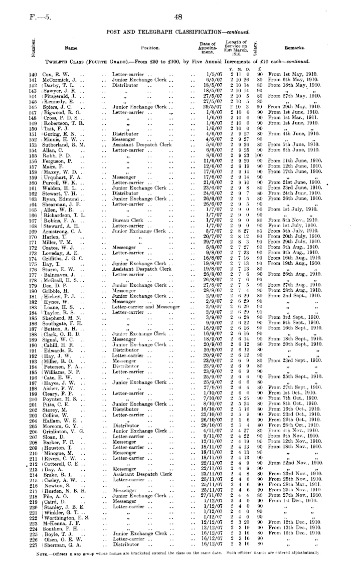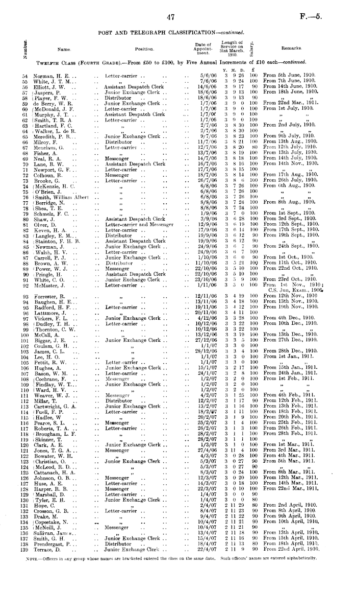 POST AND TELEGRAPH CLASSIFICATION— continued. jj Date of Length of £ g Name. Poeition. Appoint- J5 Remarks. a ment. lg]o ' s Twelfth Class (Fourth Gkadb).—From £60 to £100, by Five Annual Increments of £10 eaoh— continued. y. M. D. £ 54 Norman, H. E. .. .. Letter-carrier .. .. .. 5/6/06 3 926 100 From sth June, 1910. 55 White, J. T. M... .. „ .. .. .. 7/6/06 3 024 100 From 7th June, 1910. 56 Elliott, J. W. .. . Assistant Despatch Clerk .. 14/6/06 3 !> 17 90 From 14th June, 1910. 57 l Jaspers, P. .. .. Junior Exohango Clerk .. .. 18/6/06 3 i) 13 100 From 18th June, 1910. 58 I Player, F. W. .. .. Distributor ".. .. .. 18/6/06 3 () 13 90 59 de Berry, W. R. .. Junior Exchange Clerk .. .. 1/7/06 3 9 0 100 From 22nd Mar., 1911. 60 (McDonald, J. F. .. Letter-carrier .. .. .. 1/7/06 3 it 0 100 From Ist July, 1910. 61 'Murphy, J. T. .. .. Assistant Despatch Clerk ... 1/7/0 C 3 9 0 100 62 I Smith, T. R. A. .. Letter-carrier .. .. .. 1/7/06 :) !) 0 100 63 I Hartland, F. C. .. „ .. .. • • 2/7/06 3 830 100 From 2nd July, 1910. 64 i Walker, L. de R. .. „ .. .. .. 2/7/06 3 830 100 65 Meredith, P. 8... .. Junior Exchange Clerk .. .. 9/7/06 3 823 100 From 9th July, 1910. 66 Milroy, F. .. .. Distributor .. .. .. 11/7/06 3 821 100 From 13th Aug., 1910. 67 Menelane,G. .. .. Lettor-carrier .. .. .. 12/7/00 3 820 80 From 12th July, 1910. 68 Fisher, A. .. .. „ .. .. .. 13/7/06 3 819 100 From 13th July, 1910. 69 Neal, R. A. .. .. Messenger .. .. .. 14/7/06 3 818 100 From 14th July, 1910. 70 Lane, B. W. .. .. Assistant Despatch Clerk .. 16/7/06 3 816 100 From 14th Nov., 1910. 71 Newport, G. F. .. .. Letter-carrier .. .. .. 17/7/06 :S Sl6 100 72 Colhoun. R. .. .. Messenger .. .. .. 18/7/06 3 814 100 From 17th Aug., 1910. 73 Brooke, G. .. .. Letter-carrier .. .. .. 26/7/06 3 8 8 100 From 26th July, 1910. 74 (McKenzie, H. f. .. „ .. .. .. 6/8/06 3 726 100 From (ith Aug., 1910. 75 - O'Brien, J. .. „ .. .. .. 6/8/06 :i 726 100 76 I Smith, William Albert .. „ .. .. .. 6/8/06 3 726 100 77 'Berridge, N. .. .. „ .. .. .. 8/8/06 3 724 100 From Bth Aug., 1910. 78 (Shea, T. E 8/8/06 3 724 100 79 Schmelz, F. C. .. .. „ .. .. .. 1/9/06 3 7 0 100 From Ist Sept., 1910. 80 Shaw, J. .. .. Assistant Despatch Clerk .. 3/9/06 3 628 100 From 3rd Sept., 1910. 81 Olver, D. .. .. Letter-carrier and Messenger .. 12/9/06 3 H 1!» 100 From 12th Sept., 1910. 82 Keven, H. A. .. .. Letter-carrier .. .. .. 17/9/06 3 814 100 From 17th Sept., 1910. 83 (Langley, E. M... .. Distributor .. .. .. 19/9/06 :S ti 12 90 From 19th Sept., 1910. 84 (Stainton, F. H. B. .. Assistant Despatch Clerk .. 19/9/06 3 612 90 „ „ 85 i Newman, J. .. .. Junior Exchange Clerk .. .. 24/9/06 3 8 7 90 From 24th Sept., 1910. 86 I Walsh, H. V. .. .. Letter-carrier .. .. .. 24/9/06 :( 8 7 100 87 Carroll, P. J. .. .. Junior Exchange Clerk .. .. 1/10/06 :i ti 0 90 From Ist Oct., 1910. 88 Brown, A. W. .. .. Distributor .. .. .. 11/10/06 :t 521 100 From 11th Oct., 1910. 89 i Power, W. J. .. .. Messenger .. .. .. 22/10/06 3 510 100 From 22nd Oct., 1910. 90 I Pringle, H. .. .. Assistant Despatch Clerk .. 22/10/06 :t 510 100 „ „ 91 White, CO. .. .. Junior Exchange Clerk .. .. 23/10/06 3 5 9 100 From 23rd Oct., 1910. 92 McMaster, J. .. .. Letter-carrier .. .. .. 1/11/06 3 5 0 100 From Ist Nov., 1910; C.S. .lun, Exam., 1906. 93 Forrester, R. .. .. „ .. .. .. 12/11/06 3 419 100 From 12th Nov., 1910 94 Baughen, H. E... .. „ .. .. .. 13/11/06 3 418 100 From 13th Nov., 1910. 95 Radford, H. F. .. .. Letter-carrier .. .. .. 19/11/06 3 412 100 From llrth Nov., 1910. 96 Lattimore, J „ 20/11/06 3 411 100 97 Vickers, F. L. .. .. Junior Exchange Clerk .. .. 4/12/06 3 328 100 From 4th Dec, 1910. 98 I Dudley, T. H. .. .. Letter-carrier .. .. •. 10/12/06 3 322 100 From 10th Dec, 1910. 99 I Thornton, C. W. .. „ 10/12/06 3 322 100 100 McCall, A. .. .. „ .. .. .. 13/12/06 3 319 100 From 13th Dec, 1910. 101 Biggar, J. E. .. .. Junior Exchange Clerk .. .. 27/12/06 :i 3 6 100 From 27th Dec, 1910. 102 Coulam, G. H „ .. .. 1/1/07 3 3 0 100 103 James, C. L. .. „ .. .. 28/12/06 I) 3 4 100 From 28th Dec, 1910. 104 Lee, H. O. .. .. „ .. .. 1/1/07 3 3 0 100 From Ist Jan., 1911. 105 Pettit, R. W. .. .. Letter-carrier.. .. .. 1/1/07 3 3 0 100 106 Hughes, A. .. .. Junior Exchange Clerk .. .. 15/1/07 3 217 100 From 15th Jan., 1911. 107 Bason, W. M. .. .. Letter-carrier .. .. .. 24/1/07 3 2 8 100 From 24th Jan., 1911. 108 (Cochrane, F. .. .. Messenger .. .. .. 1/2/07 32 0 100 From Ist Feb., 1911. 109 ■ Findlay, W. T... .. Junior Exchange Clerk .. .. 1/2/07 3 2 0 100 „ 110 iWard, H. V. .. .. „ .. .. 1/2/07 3 2 0 100 111 Weaver, W. J. .. .. Messenger .. .. .. 4/2/07 3 125 100 From 4th Feb., 1911. 112 Millar, T. .. .. Distributor .. .. .. 12/2/07 3 117 90 From 12th Feb., 1911. 113 Cartwright, G. A. .. Junior Exchange Clerk .. .. 13/2/07 3 116 100 From 13th Feb., 1911. 114 iFuell, F. P. .. .. Letter-carrier .. .. .. 18/2/07 3 111 100 From 18th Feb., 1911. 115 iHadlee, W .. .. „ .. .. .. 20/2/07 3 1 9 100 From 20th Feb., 1911. 116 Pearce, S. L. .. .. Messenger .. .. .. 25/2/07 3 1 4 100 From 25th Feb., 1911. 117 Roberts, T. A. .. .. Letter-carrier .. .. .. 26/2/07 3 1 3 100 From 26th Feb., 1911. 118 I Brougham, L. F. .. „ .. .. .. 28/2/07 3 I 1 100 From 28th Feb., 1911. 119 i Skinner, T. .. .. „ .. .. .. 28/2/07 3 I 1 100 120 Clark, A. E. .. .. Junior Exchange Clerk .. .. 1/3/07 3 1 0 100 From Ist Mar., 1911. 121 Jones, T. G. A. .. .. Messenger .. .. .. 27/4/06 311 4 100 From 3rd Mar., 1911. 122 Bowater, W. H. .. „ .. .. .. 4/3/07 3 028 100 From 4th Mar., 1911. 123 (Christian, O. .. .. Junior Exchange Clerk .. .. 5/3/07 3 027 90 From sth Mar., 1911. 124 I McLeod, R. D. .. .. „ .. .. 5/3/07 3 027 90 125 Cattanach, H. A. .. „ .. .. 8/3/07 3 024 100 From Bth Mar., 1911. 126 Johnson, O. B. .. .. Messenger .. .. .. 12/3/07 3 020 100 From 12th Mar., 1911. 127 Huse, A. E. .. .. Letter-carrier .. .. .. 14/3/07 3 018 100 From 14th Mar., 1911. 128 Harper.