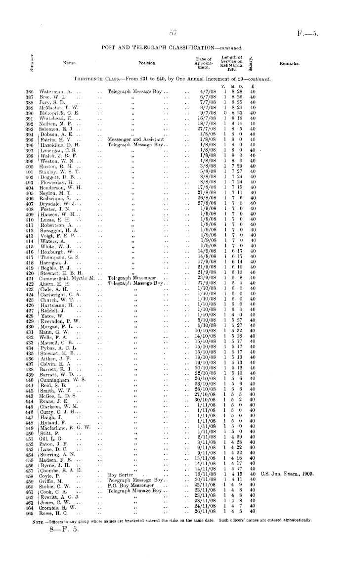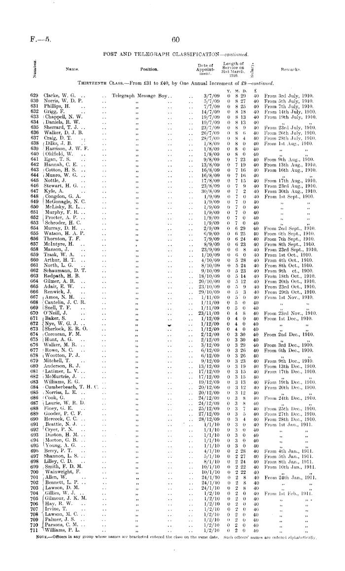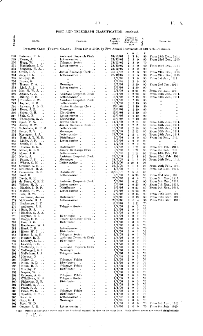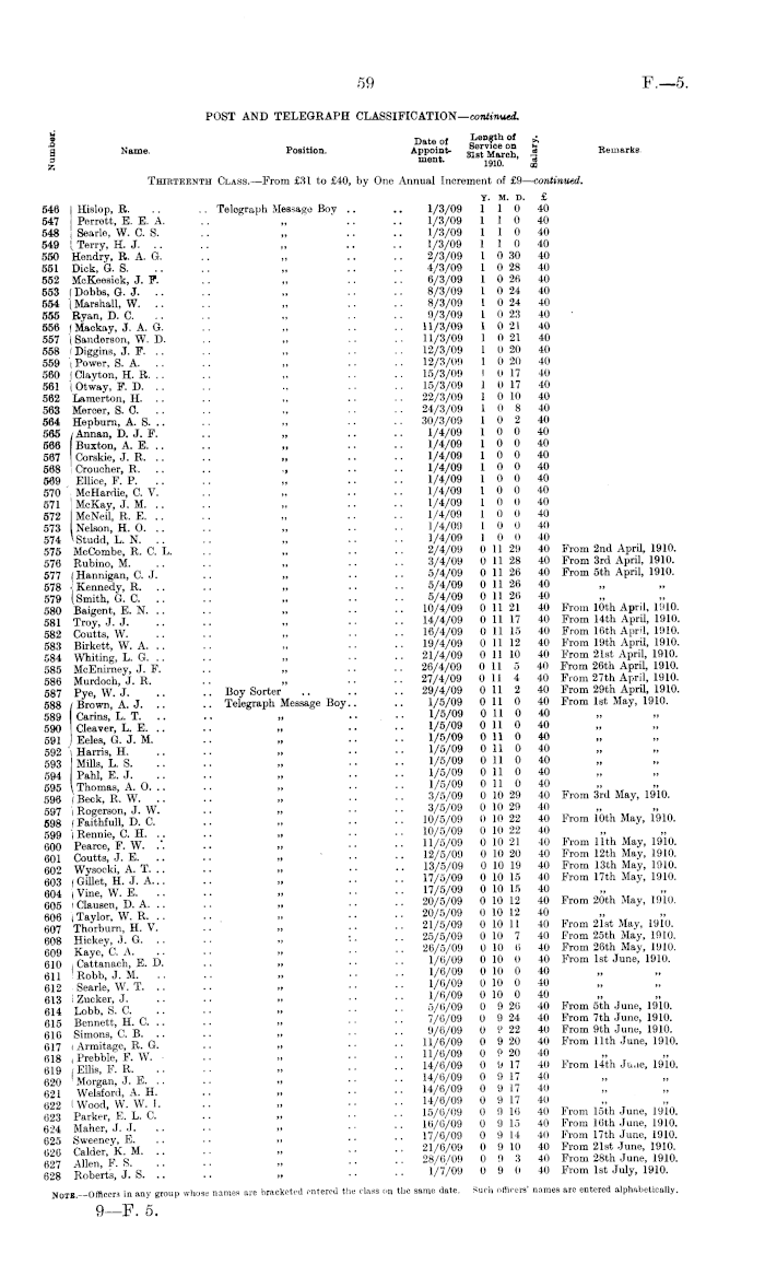 POST AND TELEGRAPH CLASSIFICATION— comimird. 1 Dntnof Leiißthof A Name. Position. Appoint- Petnarke. 3 lllBll!. ■ m 0 Thjrteexth Class.—From £31 to £40, by One Annual Increment of £9— contin Y. m. d. t 629 Clarke, W. G. .. .. Telegraph Message Boy.. .. 3/7/09 0 829 40 Prom 3rd July, 1910. 630 Norris, W. D. P. .. „ .. .. 5/7/09 0 827 40 Prom 6th July, 1910. 631 Phillips, H. .. .. „ .. .. 7/7/09 0 825 40 From 7th July, 1910. 632 Grigg, F. .. .. „ .. .. 14/7/09 0 818 40 From 14th July, ill 10. 633 i Chappell, N. W. .. „ .. .. 19/7/09 0 813 40 From 10th July, 1910. 634 , Daniels, R. W. .. „ .. .. 19/7/09 0 813 40 635 Sherrard, T. J. .. .. „ .. .. 23/7/09 0 8 9 40 From 23rd July, 1910. 636 Walker, D. J. B. .. „ .. .. 26/7/09 0 8 8 40 From 26th July, 1910. 637 Craig, D. T. .. .. „ .. .. 28/7/09 0 8 4 to From 28th July, 1910. 638 |Dilks, J. B. .'. .. „ .. .. 1/8/09 08 0 40 From Ist Aug., 1910. 639 I Harrison, J. W. F. .. „ .. .. 1/8/09 08 0 40 640 ( Oldfield, W. .. .. „ .. .. 1/8/09 0 8 0 40 641 Egan, T. S. .. .. „ .. .. 9/8/09 0 723 40 From 9th Aug., 1910. 642 Hannah, C. E. .. .. „ .. .. 13/8/09 0 719 40 From 13th Aug., 1910. 643 i Cotton, H. S. .. .. „ .. .. 16/8/09 0 716 40 From 16th ivg., 1910. 644 jMunro, W. C. .. .. „ .. .. 16/8/09 0 7lβ 10 „ 645 Nottle, J. .. .. „ .. .. 17/8/09 0 715 40 From 17th Aug., 1910. 646 Stewart, H. G. .. .. „ .. .. 23/8/09 0 7 9 40 From 23rd lug., 1910. 647 Kyle, A. .. .. „ .. .. 30/8/09 0 7 2 40 From 30th Aug., L9lO. 648 , Congdon, G. A. .. „ .. .. 1/9/09 0 7 0 40 From Let Sept.. 1910. 649 I McGonagle, N. C. .. „ .. .. 1/9/09 0 7 0 40 650 McLisky, R. L... .. „ .. .. 1/9/09 0 7 0 40 „ „ 651 Murphy, F. K. .. .. „ .. .. 1/9/09 0 7 0 40 652 { Procter, A. P. .. .. „ .. .. 1/9/09 0 7 0 40 653 * Schroder, H. C. .. „ .. .. 1/9/09 0 7 0 40 654 Murray, D. H. .. .. „ .. .. 2/9/09 0 629 40 From 2nd Sept., 1910. 055 Watson. H. A. 1 , . .. „ .. .. 0/9/09 0 626 t0 From 6th Sept., 1910. 656 Thornton, T. F. .. „ .. .. 7/9/09 v t>24 40 From 7th Sept., 1910. 657 Mclntyre, H. .. .. , .. .. 8/9/09 0 623 40 From Bth Sept., 1910. 058 Manson, J. .. .. „ .. .. 23/9/011 0 6 S 40 From 23rd Sept., 1910. 659 Trask, W. A. .. .. „ .. .. 1/10/09 0 6 0 40 From Ist Oct., 1910. 660 Arthur, H. T. .. .. „ .. .. 4/10/09 0 528 40 From 4th Oct., 1910. 661 North, L. G. .. .. „ .. .. 8/10/09 0 524 40 From Bth Oct., lit 10. 662 Sehaumann, D. T. .. „ .. .. 9/10/09 0 523 40 From 9th ct., 1910. 663 Redpath, H. B. .. „ .. .. 18/10/09 0 514 40 From 18th Oct., 1910. 664 Gilmer, A. R. .. .. „ .. .. 20/10/09 0 512 40 From 20th Oot., 1910. 665 Adair, E. W. .. .. „ .. .. 23/10/09 0 5 9 40 From 23rd Oct., 1910. 666 Renwick, J. .. .. „ .. .. 29/10/09 0 5 3 40 From 29th Oct., 1910. 667 i Amos, N. H. .. .. „ .. .. 1/11/09 0 50 40 From Ist Not., 1910. 668 Cantelin, J. C. R. .. „ .. .. 1/11/09 0 5 0 40 „ „ 669 iSnell, T. F. .. .. „ .. .. 1/11/09 0 5 0 40 670 O'Neill, J. .. .. „ .. .. 23/11/09 0 4 8 40 From 23rd Nov., 1910. 671 Baker, S. .. .. „ .. .. 1/12/09 0 4 0 40 From Ist Dec, 1910. 672 Nye, W. G. J. .. .. „ .. .. 1/12/09 0 4 0 40 673 Sherlock, E. R. O. .. „ .. .. 1/12/09 0 4 0 40 674 i Corcoran, F. M. .. „ .. .. 2/12/09 0 330 40 From 2nd Dec, 1910. 675 I Hunt, A. G. .. .. „ .. .. 2/12/09 0 330 40 676 Walker, M. R. .. .. „ .. .. 3/12/09 0 329 40 From 3rd Dec, 1910. 677 i Rowe, N. C. .. .. „ .. .. 0/12/09 0 326 40 From 6th Dec, 1910. 678 i Wootton, P. J. .. „ .. .. 6/12/09 0 326 40 679 Mitchell, T. .. „ .. .. 9/12/09 0 323 40 From 9th Dec, 1910. 680 Anderson, R. J. .. „ .. .. 13/12/09 0 319 40 From Kith Dec, 1910. 681 i Latimer, L. V. .. .. „ .. .. 17/12/09 0 315 40 From 17th Dec, 1910. 682 iMcMurtrie, J. .. .. „ .. .. 17/12/09 0 315 40 083 Williams, E. G. .. „ .. .. 19/12/09 0 313 40 From 19th Deo., 1910. 084 i Cumberbeaoh, T. H. C. .. „ .. .. 20/12/09 0 312 40 From 20th Dec., 1910. iiB. r ) Norriss, L. E. .. .. „ .. .. 20/12/09 0 312 40 080 Cook. G. .. .. „ .. .. 24/12/09 0 3 8 40 From 24th Dec., 1910. 687 i Laurie. \V. R. I). .. „ .. .. 24/12/09 0 3 8 40 „ „ 688 Finey, G. E. .. .. „ .. .. 25/12/09 0 3 7 40 From 26th Deo., 1910. 089 Gooder, P. C. F. .. ~ .. .. 27/12/09 0 3 6 40 From 27th Deo., 1910. 690 Hercock, C. C. .. .. „ .. .. 28/12/09 0 3 4 40 From 28th Dec, 1910. 091 Beattie, N. J. .. .. „ .. ' .. 1/1/10 0 3 0 40 From Ist Jan., 1911. 092 [Cryer, 1 , . X. .. .. „ .. .. 1/1/10 03 o 40 693 Duston, H. M. .. .. „ .. .. 1/1/10 0 3 0 40 „ 894 Morton, G. B. .. .. „ .. .. 1/1/10 0 3 0 40 095 'Young, A. G. .. .. „ .. .. 1/1/10 0 3 0 40 69fi Berry, P. T. .. .. „ .. .. 4/1/10 0 228 40 From 4th Jan., 1911. 097 Shannon, L. 8. .. .. „ .. .. 5/1/10 0 227 40 From sth Jan., 1911. 698 Lflley, C. D. .. .. „ .. .. 8/1/10 0 224 40 From Bth Jan., 1911. 899 Smith, F. D. M. .. „ .. .. 10/1/10 0 222 40 From 10th Jan., 1911. 700 i Wainwright, F. .. „ .. .. 10/1/10 0 222 40 „ 701 , Allen, W. .. .. „ .. .. 24/1/10 0 2 8 40 From 24th Jan., 1911. 702 Bennett, L. P. .. .. „ .. .. 24/1/10 0 2 8 40 703 |Lawson, D. M. .. „ .. .. 24/1/10 0 2 8 40 704 .Gillies, W. J. .. .. „ .. .. 1/2/10 0 2 0 40 From Ist Feb., 1911. 705 [Gilmour, J. K. M. .. „ .. .. 1/2/10 02 0 40 706 Hay, R. \V. .. .. „ .. .. 1/2/10 02 0 io 707 I Irvine, T. .. .. „ .. .. 1/2/10 02 0 40 708 ' Lawson, M. C. .. .. „ .. .. 1/2/10 0 2 0 40 „ 709 Palmer, J. S. .. .. „ .. .. 1/2/10 0 2 0 40 710 Parsons, C. M. .. .. „ .. .. 1/2/10 0 2 0 40 711 Williams. P. L. .. „ .. .. 1/2/10 0 2 0 40 Note.—Officers in any group whose munea bracketed entered <ho class cm the nme date. Such officers' names are entered alphal