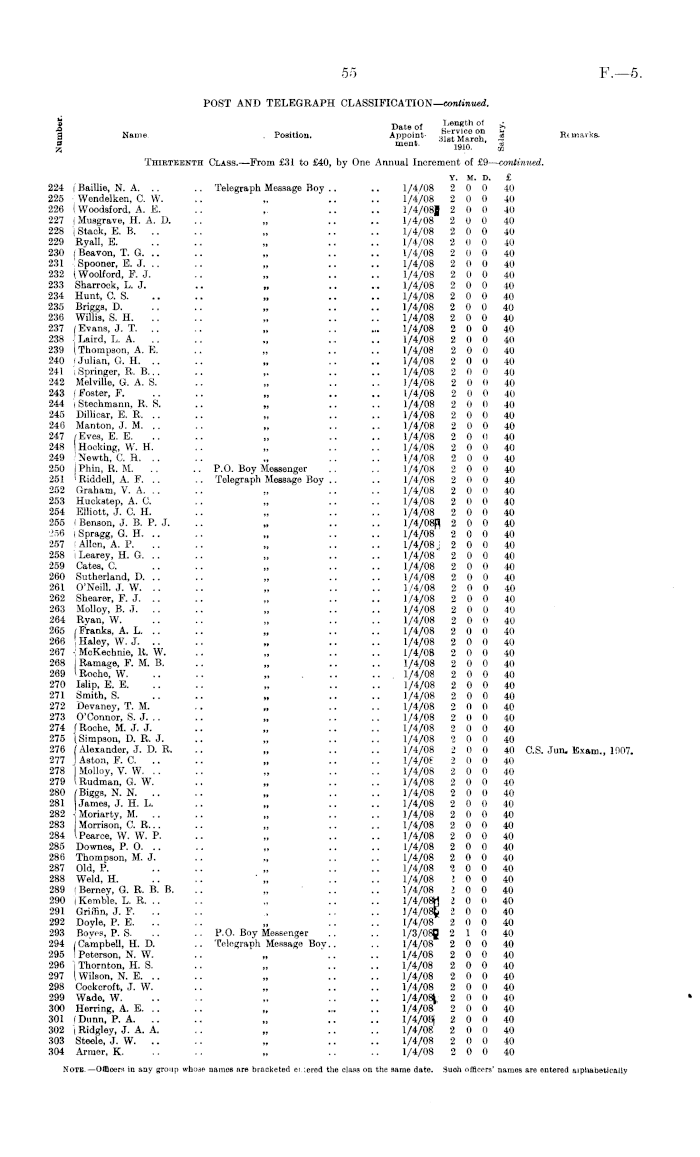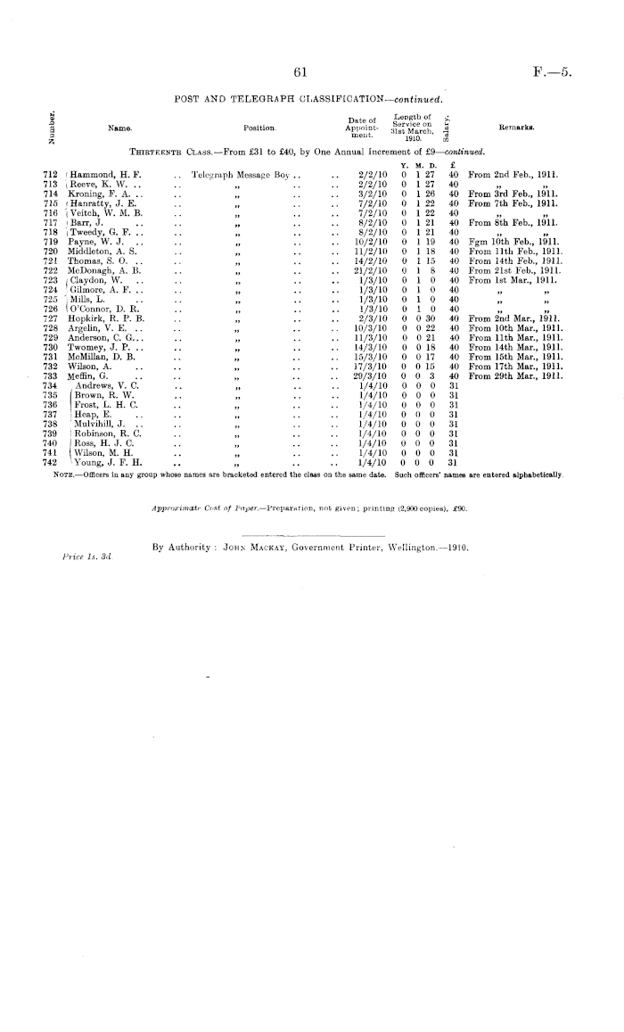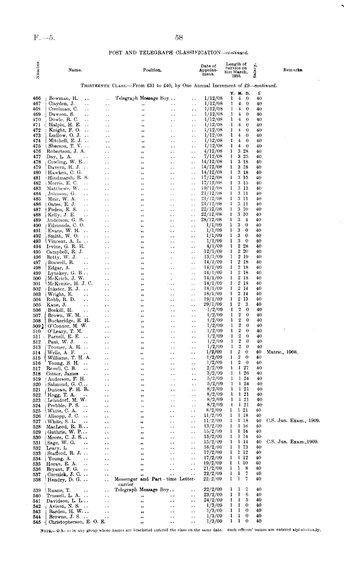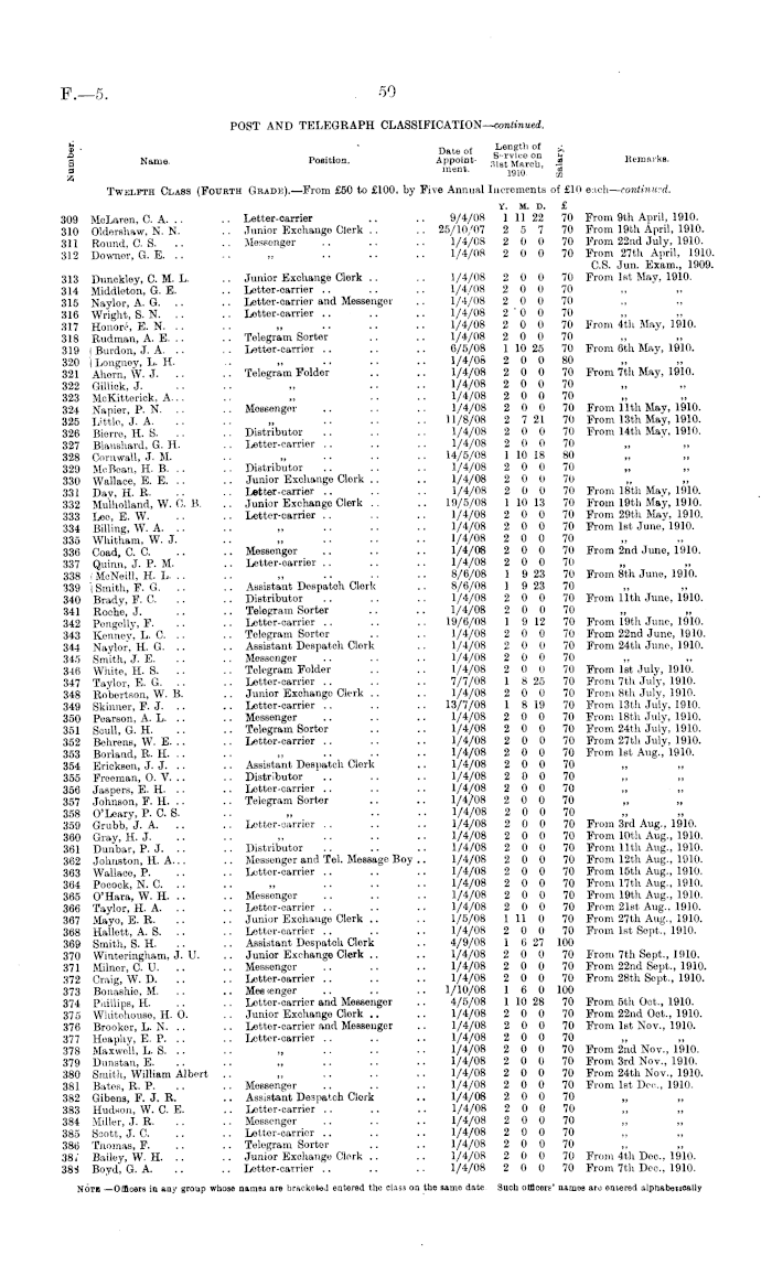 POST AND TELEGRAPH CLASSIFICATION— comimird. 1 Dntnof Leiißthof A Name. Position. Appoint- Petnarke. 3 lllBll!. ■ m 0 Thjrteexth Class.—From £31 to £40, by One Annual Increment of £9— contin Y. m. d. t 629 Clarke, W. G. .. .. Telegraph Message Boy.. .. 3/7/09 0 829 40 Prom 3rd July, 1910. 630 Norris, W. D. P. .. „ .. .. 5/7/09 0 827 40 Prom 6th July, 1910. 631 Phillips, H. .. .. „ .. .. 7/7/09 0 825 40 From 7th July, 1910. 632 Grigg, F. .. .. „ .. .. 14/7/09 0 818 40 From 14th July, ill 10. 633 i Chappell, N. W. .. „ .. .. 19/7/09 0 813 40 From 10th July, 1910. 634 , Daniels, R. W. .. „ .. .. 19/7/09 0 813 40 635 Sherrard, T. J. .. .. „ .. .. 23/7/09 0 8 9 40 From 23rd July, 1910. 636 Walker, D. J. B. .. „ .. .. 26/7/09 0 8 8 40 From 26th July, 1910. 637 Craig, D. T. .. .. „ .. .. 28/7/09 0 8 4 to From 28th July, 1910. 638 |Dilks, J. B. .'. .. „ .. .. 1/8/09 08 0 40 From Ist Aug., 1910. 639 I Harrison, J. W. F. .. „ .. .. 1/8/09 08 0 40 640 ( Oldfield, W. .. .. „ .. .. 1/8/09 0 8 0 40 641 Egan, T. S. .. .. „ .. .. 9/8/09 0 723 40 From 9th Aug., 1910. 642 Hannah, C. E. .. .. „ .. .. 13/8/09 0 719 40 From 13th Aug., 1910. 643 i Cotton, H. S. .. .. „ .. .. 16/8/09 0 716 40 From 16th ivg., 1910. 644 jMunro, W. C. .. .. „ .. .. 16/8/09 0 7lβ 10 „ 645 Nottle, J. .. .. „ .. .. 17/8/09 0 715 40 From 17th Aug., 1910. 646 Stewart, H. G. .. .. „ .. .. 23/8/09 0 7 9 40 From 23rd lug., 1910. 647 Kyle, A. .. .. „ .. .. 30/8/09 0 7 2 40 From 30th Aug., L9lO. 648 , Congdon, G. A. .. „ .. .. 1/9/09 0 7 0 40 From Let Sept.. 1910. 649 I McGonagle, N. C. .. „ .. .. 1/9/09 0 7 0 40 650 McLisky, R. L... .. „ .. .. 1/9/09 0 7 0 40 „ „ 651 Murphy, F. K. .. .. „ .. .. 1/9/09 0 7 0 40 652 { Procter, A. P. .. .. „ .. .. 1/9/09 0 7 0 40 653 * Schroder, H. C. .. „ .. .. 1/9/09 0 7 0 40 654 Murray, D. H. .. .. „ .. .. 2/9/09 0 629 40 From 2nd Sept., 1910. 055 Watson. H. A. 1 , . .. „ .. .. 0/9/09 0 626 t0 From 6th Sept., 1910. 656 Thornton, T. F. .. „ .. .. 7/9/09 v t>24 40 From 7th Sept., 1910. 657 Mclntyre, H. .. .. , .. .. 8/9/09 0 623 40 From Bth Sept., 1910. 058 Manson, J. .. .. „ .. .. 23/9/011 0 6 S 40 From 23rd Sept., 1910. 659 Trask, W. A. .. .. „ .. .. 1/10/09 0 6 0 40 From Ist Oct., 1910. 660 Arthur, H. T. .. .. „ .. .. 4/10/09 0 528 40 From 4th Oct., 1910. 661 North, L. G. .. .. „ .. .. 8/10/09 0 524 40 From Bth Oct., lit 10. 662 Sehaumann, D. T. .. „ .. .. 9/10/09 0 523 40 From 9th ct., 1910. 663 Redpath, H. B. .. „ .. .. 18/10/09 0 514 40 From 18th Oct., 1910. 664 Gilmer, A. R. .. .. „ .. .. 20/10/09 0 512 40 From 20th Oot., 1910. 665 Adair, E. W. .. .. „ .. .. 23/10/09 0 5 9 40 From 23rd Oct., 1910. 666 Renwick, J. .. .. „ .. .. 29/10/09 0 5 3 40 From 29th Oct., 1910. 667 i Amos, N. H. .. .. „ .. .. 1/11/09 0 50 40 From Ist Not., 1910. 668 Cantelin, J. C. R. .. „ .. .. 1/11/09 0 5 0 40 „ „ 669 iSnell, T. F. .. .. „ .. .. 1/11/09 0 5 0 40 670 O'Neill, J. .. .. „ .. .. 23/11/09 0 4 8 40 From 23rd Nov., 1910. 671 Baker, S. .. .. „ .. .. 1/12/09 0 4 0 40 From Ist Dec, 1910. 672 Nye, W. G. J. .. .. „ .. .. 1/12/09 0 4 0 40 673 Sherlock, E. R. O. .. „ .. .. 1/12/09 0 4 0 40 674 i Corcoran, F. M. .. „ .. .. 2/12/09 0 330 40 From 2nd Dec, 1910. 675 I Hunt, A. G. .. .. „ .. .. 2/12/09 0 330 40 676 Walker, M. R. .. .. „ .. .. 3/12/09 0 329 40 From 3rd Dec, 1910. 677 i Rowe, N. C. .. .. „ .. .. 0/12/09 0 326 40 From 6th Dec, 1910. 678 i Wootton, P. J. .. „ .. .. 6/12/09 0 326 40 679 Mitchell, T. .. „ .. .. 9/12/09 0 323 40 From 9th Dec, 1910. 680 Anderson, R. J. .. „ .. .. 13/12/09 0 319 40 From Kith Dec, 1910. 681 i Latimer, L. V. .. .. „ .. .. 17/12/09 0 315 40 From 17th Dec, 1910. 682 iMcMurtrie, J. .. .. „ .. .. 17/12/09 0 315 40 083 Williams, E. G. .. „ .. .. 19/12/09 0 313 40 From 19th Deo., 1910. 084 i Cumberbeaoh, T. H. C. .. „ .. .. 20/12/09 0 312 40 From 20th Dec., 1910. iiB. r ) Norriss, L. E. .. .. „ .. .. 20/12/09 0 312 40 080 Cook. G. .. .. „ .. .. 24/12/09 0 3 8 40 From 24th Dec., 1910. 687 i Laurie. \V. R. I). .. „ .. .. 24/12/09 0 3 8 40 „ „ 688 Finey, G. E. .. .. „ .. .. 25/12/09 0 3 7 40 From 26th Deo., 1910. 089 Gooder, P. C. F. .. ~ .. .. 27/12/09 0 3 6 40 From 27th Deo., 1910. 690 Hercock, C. C. .. .. „ .. .. 28/12/09 0 3 4 40 From 28th Dec, 1910. 091 Beattie, N. J. .. .. „ .. ' .. 1/1/10 0 3 0 40 From Ist Jan., 1911. 092 [Cryer, 1 , . X. .. .. „ .. .. 1/1/10 03 o 40 693 Duston, H. M. .. .. „ .. .. 1/1/10 0 3 0 40 „ 894 Morton, G. B. .. .. „ .. .. 1/1/10 0 3 0 40 095 'Young, A. G. .. .. „ .. .. 1/1/10 0 3 0 40 69fi Berry, P. T. .. .. „ .. .. 4/1/10 0 228 40 From 4th Jan., 1911. 097 Shannon, L. 8. .. .. „ .. .. 5/1/10 0 227 40 From sth Jan., 1911. 698 Lflley, C. D. .. .. „ .. .. 8/1/10 0 224 40 From Bth Jan., 1911. 899 Smith, F. D. M. .. „ .. .. 10/1/10 0 222 40 From 10th Jan., 1911. 700 i Wainwright, F. .. „ .. .. 10/1/10 0 222 40 „ 701 , Allen, W. .. .. „ .. .. 24/1/10 0 2 8 40 From 24th Jan., 1911. 702 Bennett, L. P. .. .. „ .. .. 24/1/10 0 2 8 40 703 |Lawson, D. M. .. „ .. .. 24/1/10 0 2 8 40 704 .Gillies, W. J. .. .. „ .. .. 1/2/10 0 2 0 40 From Ist Feb., 1911. 705 [Gilmour, J. K. M. .. „ .. .. 1/2/10 02 0 40 706 Hay, R. \V. .. .. „ .. .. 1/2/10 02 0 io 707 I Irvine, T. .. .. „ .. .. 1/2/10 02 0 40 708 ' Lawson, M. C. .. .. „ .. .. 1/2/10 0 2 0 40 „ 709 Palmer, J. S. .. .. „ .. .. 1/2/10 0 2 0 40 710 Parsons, C. M. .. .. „ .. .. 1/2/10 0 2 0 40 711 Williams. P. L. .. „ .. .. 1/2/10 0 2 0 40 Note.—Officers in any group whose munea bracketed entered <ho class cm the nme date. Such officers' names are entered alphal