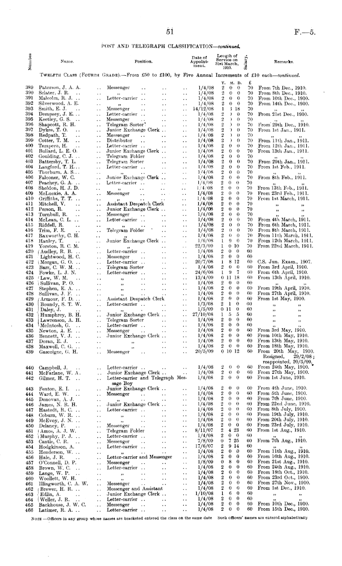POST AND TELEGRAPH CLASSIFICATION— continued. J Date of Leu?* of £ Name. Position. Appoint- * Remark*, s meat, aniiwaicn, - 2 1910. m Twelfth Class (Fourth Gradb). —From £.50 to £100, by Fivo Annual Increments of £10 each— continued. Y. M. D. £ 389 Paterson, J. A. A. .. Messenger .. .. .. 1/4/08 2 0 0 70 From 7th Dec, 1910. 390 Sclater, J. R. .. .. „ .. .. .. 1/4/08 2 0 0 70 From Bth Dec, 1910. 391 Malcolm, R. J. .. .. Letter-carrier .. .. .. 1/4/08 2 0 0 70 From 10th Dec, 1910. 392 Silverwood, A. E. .. „ .. .. .. 1/4/08 2 0 0 70 From 14th Deo., 1910. 393 Smith, E. J. .. . . Messenger .. .. .. 14/12/08 1 JlB 70 394 Dempeey, J. E. . . .. Letter-carrier .. .. .. 1/4/08 2 ) 0 70 From 21st Dec, 1910. 395 Keetley, G. S. .. .. Messenger .. .. .. 1/4/08 2 ) 0 70 396 Shapcott, R. H. .. Telegram Sorter" .. .. 1/4/08 2 ) 0 70 From' 29th Dec, 1910. 397 Dykes, T. 0. .. .. Junior Exchange Clerk .. .. 1/4/08 2 ) 0 70 From Ist Jan., 1911. 398 Redpath, T. .. .. Messenger .. .. .. 1/4/08 2 10 70 399 Cotter, T. M. .. .. Distributor .. .. .. 1/4/08 2 ) 0 70 From 11th Jan., 1911. 400 Tempero, H. .. .. Letter-carrier .. .. .. 1/4/08 2 0 0 70 From 12th Jan., 1911. 401 Bullard, L. E. O. .. Junior Exchange Clerk .. .. 1/4/08 2 0 0 70 From 13th Jan., 1911. 402 Goulding, C. J. .. .. Telegram Folder .. .. 1/4/08 2 0 0 70 403 Battersby, T. L. .. Telegram Sorter .. .. 1/4/08 2 0 0 70 From 29th Jan., 1911. 404 Langford, T. H... .. Letter-carrier .. .. .. 1/4/08 2 0 0 70 From Ist Feb., 1911. 405 Thorburn, A. 5... .. „ .. .. .. 1/4/08 2 0 0 70 406 Falconer, W. C. .. Junior Exchange Clerk .. .. 1/4/08 2 0 0 70 From Bth Feb., 1911. 407 Peachey, G. A. .. .. Letter-carrier .. .. .. 1/4/08 2 0 0 70 „ 408 Sheldon, H. J. D. .. „ .. .. .. 1/4/08 2 0 0 70 From 13th Feb., 1911. 409 McLuckie, A. A. .. Messenger .. .. .. 1/4/08 2 0 0 7(1 From 23rd Feb., 1911. 410 Griffiths, T. T. .. .. „ .. .. .. 1/4/08 2 0 0 70 From Ist March, 1911. 411 Mitchell, V. .. .. Assistant Despatch Clerk .. 1/4/08 2 0 0 70 412 Person, R. .. .. Junior Exchange Clerk .. .. 1/4/08 2 0 0 70 413 Turnbull, R. .. .. Messenger .. .. .. 1/4/08 2 0 0 70 414 McLean, C. L. .. .. Letter-carrier .. .. .. 1/4/08 2 0 0 70 From 4th March, 1911. 415 Riddel], R. .. .. „ .. .. .. 1/4/08 2 0 0 70 From 6th March, 1911. 416 Trim, F. E. .. .. Telegram Folder ' .. .. 1/4/08 2 0 0 70 From Bth March, 1911. 417 Raxworthy, C. H. .. „ .. .. 1/4/08 2 0 0 70 From 11th March, 1911. 418 Hanley, T. .. .. Junior Exohange Clerk .. . 1/6/08 1 9 0 70 From 12th March, 1911. 419 Yorston, R. C. M. .. „ .. .. 22/3/09 1 010 70 From 22nd March, 1911. 420 f Audley, R. B. .. .. Letter-carrier .. .. .. 1/4/08 20 0 80 421 Lightwood, H. C. . . Messenger .. .. .. 1/4/08 2 0 0 60 422 (Morgan, G. O. .. .. Letter-carrier .. .. .. 20/7/08 1 812 60 C.S. Jun. Exam., 1907. 423 Barr, C. W. M. .. .. Telegram Sorter .. .. 1/4/08 2 0 0 60 From 3rd April, 1910. 424 Fowke, L. J. N. .. Letter-carrier .. .. .. 24/6/08 1 9 7 80 From 6th April, 1910. 425 'Law, VV. M. .. .. „ .. .. .. 13/4/09 Oil 18 80 From 13th April, 1910. 426 i Sullivan, P. O. .. „ .. .. .. 1/4/08 2 0 0 80 427 Stephen, E. A. .. .. „ .. .. .. 1/4/08 2 0 0 60 From 19th April, 1 illo. 428 Sullivan, J. F. .. .. „ .. .. .. 1/4/08 2 0 0 60 From 27th April, 1910. 429 / Armour, F. D. .. .. Assistant Despatch Clerk .. 1/4/08 2 0 0 II) From Ist May, 1910. 430 Boundy, S. T. W. .. Letter-carrier .. .. .. 1/3/08 2 1 0 80 431 j Daley, J „ . .. .. 1/5/09 011 0 60 432 I Humphrey, B. H. .. Junior Exchange Clerk .. .. 27/10/08 1 5 5 60 „ „ 433 Lawrenson, A. H. .. Telegram Sorter .. .. 1/4/08 2 0 0 60 434 blclntosh, G. .. .. Letter-carrier .. .. .. 1/4/08 20 0 60 435 Newton, A. E. .. .. Messenger .. .. .. 1/4/08 2 0 0 6(1 From 3rd May, 1910. 436 Bennett, V. J. .. .. Junior Exchange Clerk .. .. 1/4/08 2 0 0 60 From 10th May, 1910. 437 Doran, E. J. .. .. „ .. • • 1/4/08 2 0 0 60 From 13th May, 1910. 438 Maxwell, f'.(!... .. „ .. .. 1/4/08 2 0 0 60 From 18th May, 1910. 439 Gascoigne, C. H. .. Messenger .. .. .. 20/5/09 010 12 60 From 20th May, 1910. Resigned, 29/2/08; reappointed, 20/5/09. 440 Campbell, J. .. .. Letter-carrier .. .. .. 1/4/08 2 0 0 60 From 24th May, 1910. * 441 McFarlane, W. A. .. Junior Exchange Clerk .. .. 1/4/08 2 0 0 60 From 27th May, 1910. 442 Gilmer, H. T. .. .. Letter-carrier and Telegraph Mes- 1/4/08 2 0 0 60 From Ist June, 1910. sage Boy 443 Fenton, E. I. .. .. Junior Exchange Clerk .. .. 1/4/08 2 0 0 60 From 4th June, 1910. 444 Ward, E. W. .. .. Messenger .. .. .. 1/4/08 2 0 0 60 From sth June, 1910. 445 Donovan, A. J. .. „ .. .. .. 1/4/08 2 0 0 60 From 7th June, 1910. 446 James, N. E. H. .. Junior Exchange Clerk .. .. 1/4/08 2 0 0 60 From 22nd June, 1910. 447 Hastedt, R. C. .. .. Letter-carrier .. .. .. 1/4/08 2 0 0 60 From Bth July, 1910. 448 Coburn, W. R. .. .. „ .. .. •• 1/4/08 2 0 0 60 From 19th July, 1910. 449 JlcEvoy J N .. .. . • 1/4/08 2 0 0 80 From 20th July, 1910. 450 Delaney, P. .. .. Messenger 1/4/08 2 0 0 60 From 23rd July, 1910. 451 I Amos, A. J. U. .. Telegram Folder .. .. 8/11/07 2 423 60 From Ist Aug., 1910. 452 I Murphy, P. J. .. .. Letter-carrier .. .. .. 1/4/08 2 0 0 mi 453 Cantle, C. R. .. .. Messenger .. .. .. 7/8/09 0 725 60 From 7th Aug., 1910. 454 Hodgkinson, A. .. Letter-carrier .. .. .. 17/6/07 2 914 60 455 Henderson, W. .. .. „ .. .. .. 1/4/08 2 0 0 60 From 11th Aug., 1910. 456 Hale, J. R. .. .. Letter-carrier and Messenger .. 1/4/08 2 0 0 60 From 16th Aug., 1910. 457 O'ConneU, D. P. .. Messenger .. .. .. 1/8/09 0 8 0 60 From 21st Aug., 1910. 458 Brown, W. C. .. .. Letter-carrier .. .. .. 1/4/08 20 0 60 From 24th Aug., 1910. 459 Lange W. P. .. „ .. ■ • • • 1/4/08 2 0 0 60 From 18th Oct., 1910. 460 Woollett, W. H. .. „ .. .. • ■ 1/4/08 2 0 0 60 From 23rd Oct., 1910. 461 Illingworth, C. A. W. .. Messenger .. .. .. 1/4/08 2 0 0 60 From 27th Nov., 1910. 462 (Brewer, H. R. .. .. Messenger and Assistant .. 1/4/08 20 0 60 From Ist Dec, 1910. 463 
