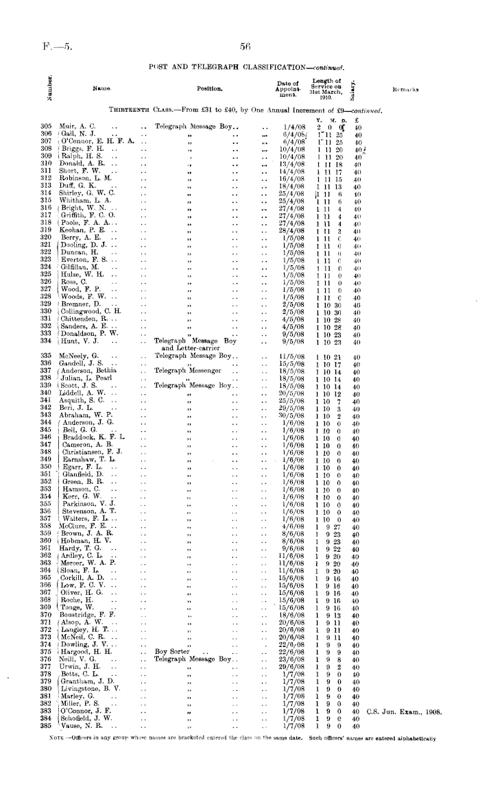 POST AND TELEGRAPH CLASSIFICATION— continued. j> Date of length ol j a Name . Position. Appoint- Juj: « Hiumvke. a ment. m 0 • | Thieteekth Class.—From £31 to £40, by One Annual Increment of £9— continued. Y. M. D. £ 224 i Baillie, N. A. .. .. Telegraph Message Boy .. .. 1/4/08 2 0 0 40 225 Wendelken, C. W. .. „ .. .. 1/4/08 2 0 0 40 226 I Woodsford. A. E. .. ~ .. .. 1/4/08J 20 0 40 227 (Musgrave, H. A. D. .. „ .. .. 1/4/08 2 0 0 40 228 I Stack, E. B. .. .. „ .. .. 1/4/08 2 0 0 40 229 Ryall, E. .. .. „ .. .. 1/4/08 2 0 0 40 230 I Beavon, T. G. .. .. „ .. .. 1/4/08 2 0 0 40 231 Spooner, E. J. .. .. „ .. .. 1/4/08 2 0 0 40 232 (Woolford, F. J. .. „ .. .. 1/4/08 2 0 0 40 233 Sharrock, L. J. .. „ .. .. 1/4/08 2 0 0 40 234 Hunt, C. S. .. .. „ .. .. 1/4/08 2 0 0 40 235 Briggs, D. .. „ .. .. 1/4/08 2 0 0 40 236 Willis, S. H. .. .. „ .. .. 1/4/08 2 0 0 40 237 f Evans, J. T. .. .. „ .. ... 1/4/08 2 0 0 40 238 Laird, L. A. .. .. ~ .. .. 1/4/08 2 0 0 40 239 (Thompson, A. E. .. „ .. .. 1/4/08 20 0 40 240 I Julian, G. H. .. .. „ .. .. 1/4/08 2 0 0 40 241 I Springer, R. 8... .. ~ .. .. 1/4/08 2 0 0 40 242 Melville, G. A. S. .. „ .. .. 1/4/08 2 0 0 40 243 I Foster, F. .. .. „ .. .. 1/4/08 2 0 0 40 244 iStechmann, R, S. .. „ .. .. 1/4/08 2 0 0 40 245 Dillicar, E. R. .. .. „ .. .. 1/4/08 2 0 0 40 246 Manton, J. M. .. .. „ .. .. 1/4/08 2 0 0 40 247 (Eves, E. E. .. .. „ .. .. 1/4/08 2 0 0 40 248 Hocking, W. H. .. „ .. .. 1/4/08 2 0 0 40 249 [ Newth, C. R. .. .. „ .. .. 1/4/08 20 0 40 250 Phin, R. M. .. .. P.O. Boy Messenger .. .. 1/4/08 2 0 0 40 251 Riddell, A. F. .. .. Telegraph Message Boy .. .. 1/4/08 2 0 0 40 252 Graham, V. A. .. .. „ .. .. 1/4/08 2 0 0 40 253 Huckstep, A. C. .. „ .. .. 1/4/08 2 0 0 40 254 Elliott, J. C. H. .. „ .. .. 1/4/08 2 0 0 40 255 (Benson, J. B. P. J. „ .. .. l/4/08fl 2 0 0 40 I Spragg, G. H. .. .. „ .. .. 1/4/08 2 0 0 40 257 Allen, A. P. .. „ .. .. 1/4/08 ; 2 0 0 40 258 i Learey, H. G. .. .. „ .. .. 1/4/08 2 0 0 40 259 Cates, C. .. .. „ .. .. 1/4/08 2 0 0 40 260 Sutherland, D. .. .. „ .. .. 1/4/08 2 0 0 40 261 O'Neill. J. W. .. .. „ .. .. 1/4/08 2 0 0 40 262 Shearer, F. J. .. .. „ .. .. 1/4/08 2 0 0 40 263 Molloy, B. ,T. .. .. „ .. .. 1/4/08 2 0 0 40 264 Ryan, W. .. .. „ .. .. 1/4/08 2 0 0 40 265 / Franks, A. L. .. .. „ .. .. 1/4/08 2 0 0 40 266 ' Haley, W. J. .. .. „ .. .. 1/4/08 2 0 0 40 267 \ McKechnie, It. W. .. „ .. .. 1/4/08 2 0 0 40 268 Raraage, F. M. B. .. „ .. .. 1/4/08 2 0 0 40 269 Roche, W. .. .. .. 1/4/08 2 0 0 40 270 Islip, E. E. .. .. „ .. .. 1/4/08 2 0 0 40 271 Smith, S. .. .. „ .. .. 1/4/08 2 0 0 40 272 Devaney, T. M. .. „ .. .. 1/4/08 2 0 0 40 273 O'Connor, S. J. .. .. „ .. .. 1/4/08 2 0 0 40 274 /Roche, M. J. J. .. „ .. .. 1/4/08 2 0 0 40 275 [Simpson, D. R. J. .. „ .. .. 1/4/08 2 0 0 40 276 (Alexander, J. D. R. .. „ .. .. 1/4/08 2 0 0 40 C.S. Jun. Exam., 1907. 277 J Aston, F. C. .. .. „ .. .. l/4/0e 2 0 0 40 278 ] Molloy, V. W. .. .. „ .. .. 1/4/08 2 0 0 40 279 ( Rudman, G. W. .. „ .. .. 1/4/08 2 0 0 40 280 (Biggs, N. N. .. .. „ .. .. 1/4/08 2 0 0 40 281 James, J. H. L. .. „ .. .. 1/4/08 2 0 0 40 282 J Moriarty, M. .. .. „ .. .. 1/4/08 2 0 0 40 283 Morrison, C. R... .. „ .. .. 1/4/08 2 0 0 40 284 IPearce, W. W. P. .. „ .. .. 1/4/08 20 0 40 285 Downes, P. 0. .. .. „ .. .. 1/4/08 2 0 0 40 286 Thompson, M. J. .. „ .. .. 1/4/08 2 0 0 40 287 Old, P. .. .. „ .. .. 1/4/08 2 0 0 40 288 Weld, H. .. .. ' „ .. .. 1/4/08 J 0 0 40 289 i Berney, G. R. B. B. „ .. .. 1/4/08 J 0 0 40 290 i Kemble. L. R. .. .. „ .. .. 1/4/08H 2 0 0 40 291 Griffin, J. F. .. „ .. .. l/4/08fc 2 0 0 40 292 Doyle, P. E. .. „ .. .. 1/4/08 2 0 0 40 293 Boyps, P. S. .. .. P.O. Boy Messenger .. .. l/3/08| 2 10 40 294 (Campbell, H. D. .. Telegraph Message Boy.. .. 1/4/08 2 0 0 40 295 ! Peterson, N. W. .. „ ' .. .. 1/4/08 20 0 40 296 i Thornton, H. S. .. „ .. .. 1/4/08 2 0 0 40 297 1 Wilson, N. E. .. .. „ .. .. 1/4/08 20 0 40 298 Cockcroft, J. W. .. „ .. .. 1/4/08 2 0 0 40 299 Wade, W. .. .. „ .. .. 1/4/081 2 0 0 40 300 Herring, A. E. .. .. „ ~. .. 1/4/08 2 0 0 40 301 (Dunn, P. A. .. .. „ .. .. 1/4/Oilj 2 0 0 40 302 I Ridgley, J. A. A. .. „ .. .. 1/4/08 2 0 0 40 303 Steele, J. W. .. .. „ .. .. 1/4/08 2 0 0 40 304 Arraer, K. .. .. „ .. .. 1/4/08 2 0 0 40 Note— Ofßoers in any group whoso namoe nre bracketed ci .ered the class on the same date. Suoh officers' names are entered aiplutbotically