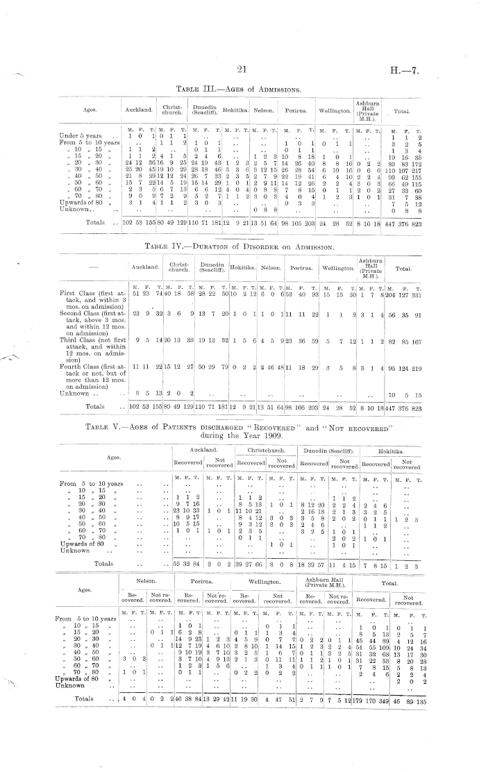 Ages. Auckland. Christchurcb. Recovered j rec^rea j Recovered| reo^ed Christchurcb. Recovered „„ Not . recovered Dunedin (Seacliff). Hokitika. Recovered Not recovered M. F. T. M. F. T. M. F. T. M. F. T. M. F. T. M. F. T. M. F. T. M. F. T. From 5 to 10 years „ 10 „ 15 „ „ 15 „ 20 „ „ 20 „ 30 „ „ 30 „ 40 „ „ 40 „ 50 „ „ 50 „ 60 „ „ 60 „ 70 „ „ 70 „ 80 „ Upwards of 80 Unknown 1 1 2 9 7 16 23 10 33 8 9 17 10 5 15 1 0 1 1 0 1 112 8 5 13 11 10 21 8 4 12 9 3 12 2 3 5 0 11 1 0 1 3 0 3 3 0 3 8 12 20 2 16 18 3 5 8 2 4 6 3 2 5 112 2 2 4 2 13 2 0 2 2 4 6 3 2 5 0 11 112 1 2 3 10 1 1 0 1 10 1 2 0 2 10 1 1 0 1 Totals 52 32 84 2 0 39 27 66 8 0 8 18 39 57 11 4 15 7 8 15 12 3 Nelson. Pori: •ua. Weill igton. Ashburn Hall (Private M.H.). To, ;al. Ages. Re- | Not recovered, j covered. Recovered. | Not recovered. Recovered. Not •ecovered. Re- '\ Not recovered, covered. Recovered. Not recovered. M. F. T. M. F. T. M. F. TM. F. T. M. F. T. kt. F. T. M. F. T. M. F. T. M. F. T. M. F. T. 'rom 5 to 10 years „ 10 „ 15 „ . 15 „ 20 „ „ 20 „ 30 „ „ 30 „ 40 „ „ 40 „ 50 „ „ 50 „ 60 „ „ 60 „ 70 „ „ 70 „ 80 „ ipwards of 80 „ Jnknown 3 0 3 0 1 1 0 11 10 1 6 2 8 14 9 23 12 7 19 9 10 19 3 7 10 12 3 0 11 12 3 4 6 10 3 7 10 4 9 13 15 6 Oil 4 5 9 2 8 10 3 2 5 2 1 3 Oil 13 4 0 7 7 1 14 15 16 7 0 11 11 13 4 0 2 2 0 2 2 12 3 Oil 112 0 1 1 Oil 2 2 4 3 2 5 1 0 1 1 0 1 10 1 8 5 13 45 44 89 54 55 109 31 32 63 31 22 53 7 8 15 2 4 6 0 1 1 2 5 7 4 12 16 10 24 34 13 17 30 8 20 28 5 8 13 2 2 4 2 0 2 10 1 0 2 2 Totals 4 0 4 0 2 2 46 38 84 13 29 42 11 19 30 4 47 51 2 7 9 7 5 1: 179 170 349 46 89 135