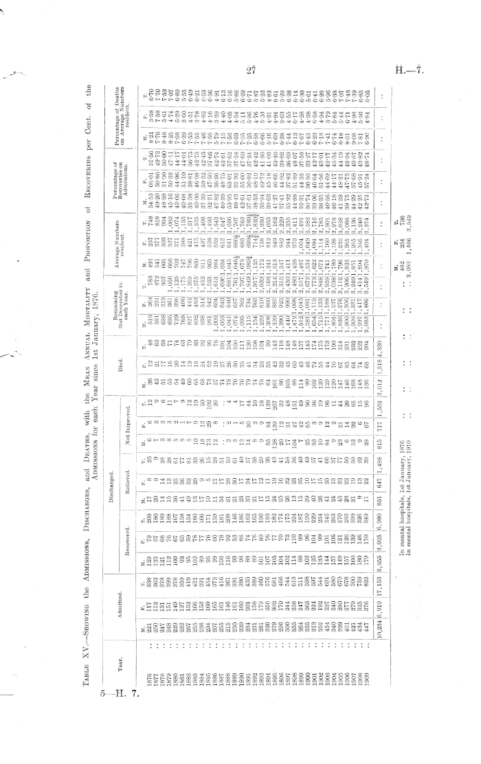 Table XV.—Showing the Admissions, Discharges, and Deaths, with the Mean Annual Mortality and Proportion of Recoveries per Cent. of the Admissions for each Year since 1st January, 1876.