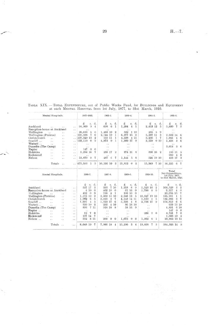 Table XIX.—Total Expenditure, out of Public Works Fund, for Buildings and Equipment at each Mental Hospital from 1st July, 1877, to 31st March, 1910.
