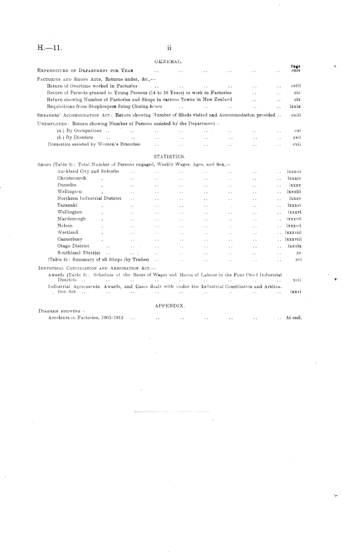 GENERAL. Expenditure of Department fob Yeab .. .. .. .. .. .. oxiv Factories and Shops Acts, Returns under, &c, — Return of Overtime worked in Factories .. .. .. .. .. .. cviii Return of Permits granted to Young Persons (14 to 16 Years) to work in Factories .. .. cix Return showing Number of Factories and Shops in various Towns in New Zealand .. .. cix Requisitions from Shopkeepers fixing Closing-hours .. .. .. .. .. lxxix Shearers' Accommodation Act : Return showing Number of Sheds visited and Accommodation provided .. cxiii Unemployed : Return showing Number of Persons assisted by the Department — (a.) By Occupations .. .. .. .. ... .. .. .. cxi (b.) By Districts .. .. .. .. .. .. .. .. cxii Domestics assisted by Women's Branches .. .. .. .. .. .. cxii STATISTICS. Shops (Table 3) : Total Number of Persons engaged, Weekly Wages, Ages, and Sex, — Auckland City and Suburbs .. .. .. .. ... .. .. lxxxiii Ohristchurch „ .. .. .. .. .. .. .. lxxxiv Dunedin „ .. .. .. .. .. .. .. Ixxxv Wellington „ .. .. .. .. .. .. .. lxxxiii Northern Industrial Distriot .. .. .. .. .. .. .. Ixxxv Taranaki „ .. .. ~ .. . .. .. lxxxvi Wellington „ .. .. .. .. .. .. .. lxxxvi Marlborough „ .. .. .. .. .. .. .. Ixxxvii Nelson „ .. .. .. .. .. .. .. Ixxxvii Westland „ .. .. .. .. .. .. .. Ixxxviii Canterbury „ .. .. .. .. .. .. .. Ixxxviii Otago District ... .. .. .. .. .. .. .. lxxxix Southland Distriot .. .. '» .. .. .. .. .. .. xc (Table 4): Summary of all Shops (by Trades) .. .. .. .. .. .. xci Industrial Conciliation and Arbitration Act, — Awards (Table 5) : Schedule of the Rates of Wages ;md Hours of Labour in the Four Chiff Industrial Districts .. .. .. .. .. .. .. .. .. xcii Industrial Agreements. Awards, and Cases dealt with under the Industrial Conciliation and Arbitra- , tion Act .. .. .. .. .. .. .. .. .. Ixxxi APPENDIX. Diagram showing - Accidents in Factories, 1903-1912 .. .. .. .. .. .. .. At end.