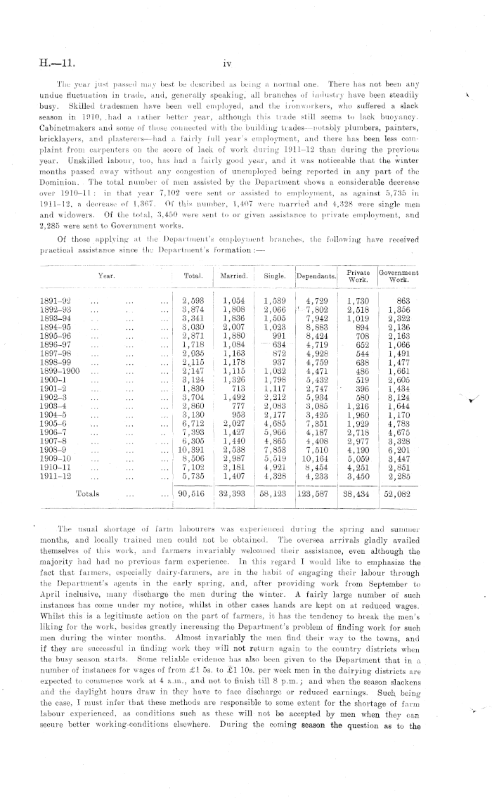 The year just passed may best be described as being a norrnal one. There has not been any undue fluctuation in trade, and, generally speaking, all branches of industry have been steadilybusy. Skilled tradesmen have been well employed, and the ironworkers, who suffered a slack season in 1010, .had a rather better year, although this trade still seems to lack buoyancy. Cabinetmakers and some of those connected with the building trades notably plumbers, painters, bricklayers, and plasterers—had a fairly full year's employment, and there has been less complaint from carpenters on the score of lack of work (luring 1911-12 than during the previous year. Unskilled labour, too, has had a fairly good year, and it was noticeable that the winter months passed away without any congestion of unemployed being reported in any part of the Dominion. The total number of men assisted by the Department shows a considerable decrease over 1910-11 : in that year 7,102 were sent or assisted to employment, as against 5,735 in 1911—12, a decrease of 1,367. Of this number, 1,407 were married ami 1,328 were single men and widowers. Of the total, 3,450 were sent to or given assistance to private employment, and 2,285 were sent to Government works. Of those applying at the Department's employment branches, the following have received practical assistance since the Department's formation : —