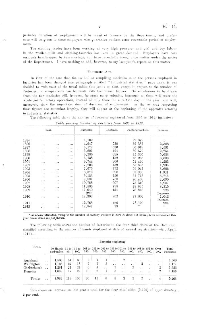 probable duration of employment will be aske„d of farmers by the Department, and preference will be given to those employers who guarantee workers some reasonable period of employment. The clothing trades have been working at very high pressure, and girl and boy labour in the woollen-mills and clothing-factories has been in great demand. Employers have been seriously handicapped by this shortage, and have repeatedly brought the matter under the notice of the Department. I have nothing to add, however, to my last year's report on this matter. Factories Act. In view of the fact that the method of compiling statistics as to the persons employed in factories has been changed (see paragraph entitled " Industrial statistics," page xxv), it was decided to omit most of the usual tables this year; so that, except in respect to the number of factories, no comparisons can be made with the former figures. The conclusions to be drawn from the new statistics will, however, be much more valuable, inasmuch as these will cover the whole year's factory ope-rations, instead of only those for a certain daj' of the year, and will, moreover, show the important item of duration of employment. As the remarks respecting these figures are somewhat lengthy, they will appear at the beginning of the appendix relating to industrial statistics. The following table shows the number of factories registered from 1895 to 1912, inclusive :