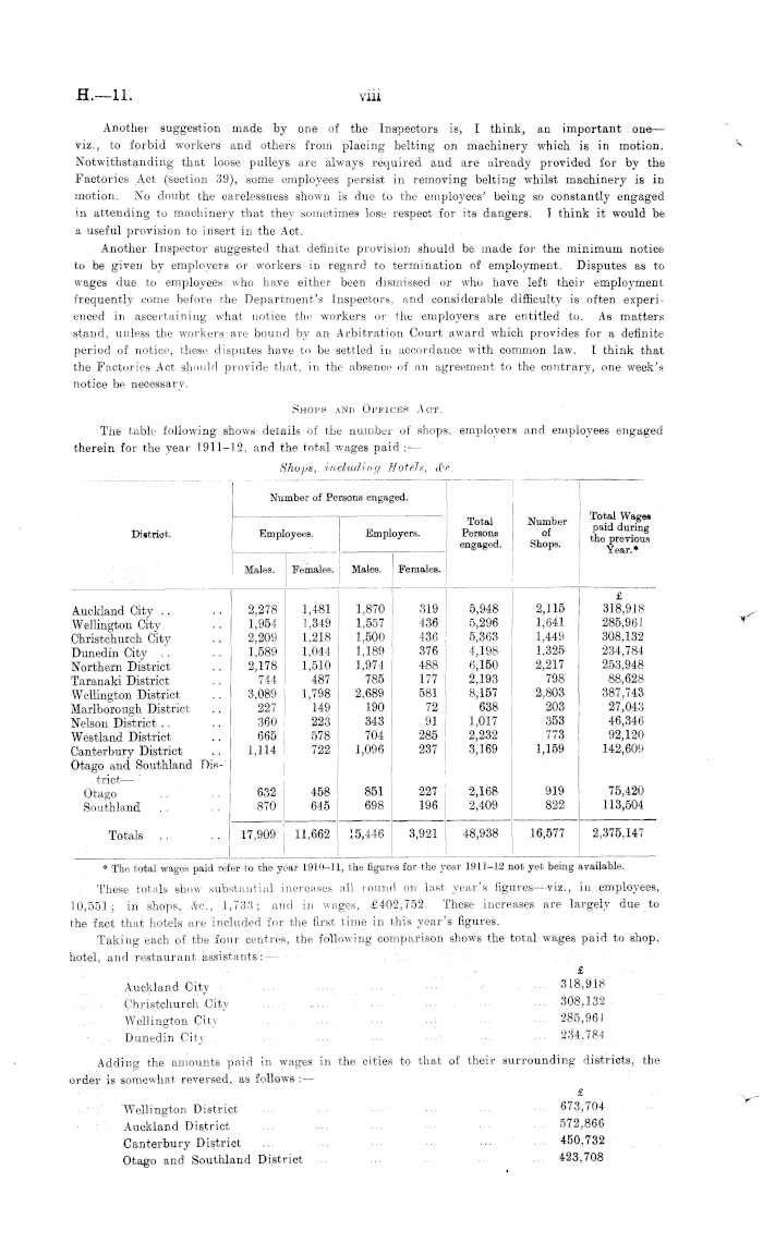 Another suggestion made by one of the Inspectors is, I think, an important . one — viz., to forbid workers and others from placing belting on machinery which is in motion. Notwithstanding that loose pulleys are always required and are already provided for by the Factories ,Act (section 39), some employees persist in removing belting whilst machinery is in motion. No doubt the carelessness shown is due to the employees' being so constantly engaged in attending to machinery that they sometimes lose respect for its dangers. I think it would be a useful provision to insert in the Act. Another Inspector suggested that definite provision should be made for the minimum notice to be given by employers or workers in regard to termination of employment. Disputes as to wages due to employees who have either been dismissed or who have left their employment frequently come before the Department's Inspectors, and considerable difficulty is often experienced in ascertaining what, notice the workers or the employers are entitled to. As matters stand, unless the workers are bound by an Arbitration Court award which provides for a definite period of notice, these disputes have to be settled in accordance with common law. I think that the Factories Act should provide that, in the absence of an agreement to the contrary, one week's notice be necessary. Shops and Offices Act. The table following shows details of the number of shops, employers and employees engaged therein for the year 1911-12, and the total wages paid : —