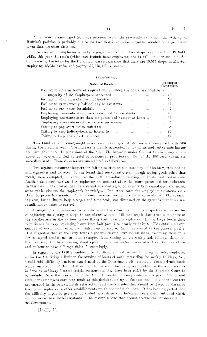 This order is unchanged from the previous year. As previously explained, the Wellington District's position is probably due to the fact that it contains a greater number of large inland towns than the other districts. The number of employees actually engaged at work in these shops was 15,782 in 1910-11, whilst this year the totals (which now include hotel employees) are 19,367 —an increase of 3,585. Summarizing the totals for the Dominion, the returns show that there are 16,577 shops, hotels, &c, employing 48,938 hands, and paying £2,375,147 in wages. Prosecutions. Nature of Breach. »£££ Failing to close in terms of requisitions by which the hours are fixed by a majority of the shopkeepers concerned ... ... ... ... 53 Failing to close on statutory half-holiday ... ... ... ... 39 Failing to grant weekly half-holiday to assistants ... ... ... 32 Failing to pay wages fortnightly ... ... ... ... ... 2 Employing assistants after hours prescribed for assistants ... ... 40 Employing assistants more than the prescribed number of hours... ... 36 Employing assistants overtime without permission ... ... ... 5 Failing to pay overtime to assistants ... ... ... ... 3 Failing to keep holiday-book in hotels, &c. ... ... ... ... 41 Failing to keep wages and time book ... ... ... ... ... 47 Two hundred and ninety-eight cases were taken against shopkeepers, compared with 200 during the previous year. The increase is mainly accounted for by hotels and restaurants having been brought under the provisions of the Act. The breaches under the last two headings in the above list were committed by hotel or restaurant proprietors. Out of the 298 cases taken, six were dismissed. These six cases are summarized as follows : — Two against restaurant-keepers for failing to close on the statutory half-holiday, they having sold cigarettes and tobacco. It was found that restaurants, even though selling goods other than meals, were exempted, in error, by the 1910 amendment relating to hotels and restaurants. Another dismissed case was for employing an assistant after the hours prescribed for assistants. In this case it was proved that the assistant was waiting to go away with his employer, and served some goods without the employer's knowledge. Two other cases for employing assistants more than the prescribed number of hours were dismissed owing to conflicting evidence. The remaining case, for failing to keep a wages and time book, was dismissed on the grounds that there was insufficient evidence to convict. A subject giving considerable trouble to the Department and to its Inspectors is the matter of enforcing the closing of shops in accordance with the different requisitions from a majority of the shopkeepers in the various trades fixing their own closing-hours. In the large towns these requisitions fix varying closing-hours from half past sto nearly midnight. This entails a large amount of work upon Inspectors, whilst considerable confusion is caused to the general public. It is suggested that in the large towns a general closing-hour for all shops, excepting those in a few exempted trades such as those exempted from closing on the weekly half-holiday, should be fixed at, say, 8 o'clock, leaving shopkeepers in any particular trades who desire to close at an earlier hour to have a " requisition " accordingly. In regard to the 1910 amendment to the Shops and Offices Act bringing all hotel employees under the Act, fixing a limit to the number of hours of work, providing for weekly holidays, &c, considerable difficulty has been experienced by the Department with respect to those private hotels which, on account of the fact that they do not cater for the general public in the same way as is done by ordinary licensed hotels, restaurants, (fee, have been ruled by the Supreme Court to be excluded from the provisions of the Act. A number of complaints on the part of hotel and restaurant employees have been made at this decision, owing to the fact that many of the workers are engaged in the private hotels referred to, and they consider they should be placed on the same footing as employees in other establishments which are under the Act. It has been suggested that the difficulty might be got over by including such private hotels as are above mentioned which employ more than three assistants. The matter is one that should receive the consideration of the Government.