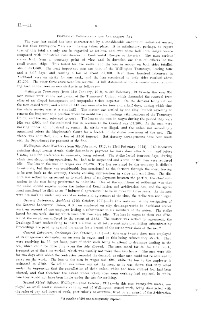 Industrial Conciliation and Arbitration Act. The year just ended has been characterized by a considerable amount of industrial unrest, no less than twenty-one "strikes" having taken place. It is satisfactory, perhaps, to report that of this total six only can be regarded as serious, and even these fade into insignificance compared with industrial disturbances in Continental Europe or America. The most serious strike both from a monetary point of view and in duration was that of officers of the small coastal ships. This lasted for five weeks, and the loss in money on both sides totalled about £24,000. The next important case was that of the Wellington Tramways, lasting four and a half days, and causing a loss of about £2,100. Over three hundred labourers in Auckland were on strike for one w-eek, and the loss occasioned to both sides reached about £1,200. The other three cases were less serious. A full statement of the circumstances surrounding each of the more serious strikes is as follows :— Wellington Tramwaxjs (from 31st January, 1912, to sth February, 1912). —In this case 358 men struck work at the instigation of the Tramways' Union, which demanded the removal from office of an alleged incompetent and unpopular ticket inspector. On the demand being refused the men ceased work, and a total of 413 men were idle for four and a half days, during which time the whole service was at a standstill. The matter was settled by the City Council agreeing to remove the inspector to a position where he would have no dealings with members of the Tramways Union, and the men returned to work. The loss to the men in wages during the period they were idle was £893, and the estimated loss in revenue to the Council was £1,200. As the men were working under an industrial agreement the strike was illegal, and the union was accordingly summoned before the Magistrate's Court for a breach of the strike provisions of the Act. The offence was admitted, and a fine of £100 imposed. Satisfactory arrangements have been made with the Department for payment of the fine. Wellington Meat Workers (from 9th February, 1912, to 23rd February, 1912).—160 labourers assisting slaughtermen struck, their demands re payment for work done after 5 p.m. and before 8 a.m., and for preference to unionists, being refused. The strike lasted fourteen days, during which time slaughtering operations, &c, had to be suspended and a total of 320 men were rendered idle. The loss to the men in wages was £2,326. The loss sustained by the company is difficult to estimate, but there was considerable loss occasioned to the farmers through the sheep having to be sent back to the country, thereby causing depreciation in value and condition. The dispute was settled by agreement as to conditions of employment between the parties, the chief concession to the men being preference to unionists. One of the conditions of settlement was that the union should register under the Industrial Conciliation and Arbitration Act, and the agreement mentioned be filed as an " industrial agreement " to be in force for three years. As the men were not working under any award or industrial agreement at the time, the strike was not illegal. General Labourers, Auckland (24th October, 1911).—In this instance, at the instigation of the General Labourers' Union, 310 men employed on city drainage-works in Auckland struck work on account of one employer letting a subcontract to six members of the union. The strike lasted for one week, during which time 330 men were idle. The loss in wages to them was £765, whilst the employers suffered to the extent of £433. The matter was settled by agreement, the Drainage Board undertaking to insert a clause in all future contracts prohibiting subcontracting Proceedings are pending against the union for a breach of the strike provisions of the Act.* General Labourers, Onehunga (7th October, 1911). —In this case twenty-three men employed at drainage-work demanded an increase in wages, and on this being refused they struck. They were receiving Is. 6d. per hour, part of their work being to attend to drainage leading to the sea, which could be done only when the tide allowed. The men asked for ss. for tidal work, irrespective of the time worked, which was usually not more than two hours. The men were idle for two days after which the contractor conceded the demand, as other men could not be obtained to carry on the work. The loss to the men in wages was £25, while the loss to the employer is estimated at £100. No action was taken against the men, as it was shown that they acted under the impression that the cancellation of their union, which had been applied for, had been effected, and that therefore the award under which they were working had expired, in which case they would not have been liable under the Act for striking. Coastal Ships' Officers, Wellington (2nd October, 1911).—In this case twenty-five mates, employed on small coastal steamers running out of Wellington, ceased work, being dissatisfied with the rates of pay and hours of work, particularly re overtime, fixed by an award of the Arbitration
