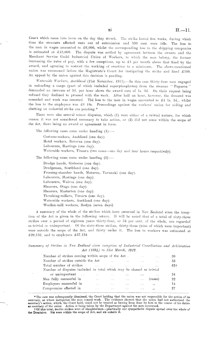Court which came into force on the day they struck. The strike lasted five weeks, during which time the steamers affected were out of commission and 550 men were idle. The loss to the men in wages amounted to £6,000, whilst the corresponding loss to the shipping companies is estimated at £18,000. The dispute was settled by agreement between the owners and the Merchant Service Guild Industrial Union of Workers, to which the men belong, the former increasing the rates of pay, with a few exceptions, up to £1 per month above that fixed by the award, and agreeing to restrict the working of overtime to a minimum. The above-mentioned union was summoned before the Magistrate's Court for instigating the strike and fined £100. An appeal by the union against this decision is pending. Waterside Workers, Auckland (21st November, 1911). —In this case thirty-four men engaged in unloading a cargo (part of which included superphosphates) from the steamer " Paparoa " demanded an increase of 3d. per hour above the award rate of Is. 3d. On their request being refused they declined to proceed with the work. After half an hour, however, the demand was conceded and work was resumed. The loss to the men in wages amounted to £1 Is. 3d., whilst the loss to the employers was £8 10s. Proceedings against the workers' union for aiding and abetting an unlawful strike are pending.* There were also several minor disputes, which (1) were either of a trivial nature, for which reason it was not considered necessary to take action, or (2) did not come within the scope of the Act, there being no award or agreement in force. The following cases come under heading (1) : — Costume-makers, Auckland (one day). Hotel workers, Rotorua (one day). Labourers, Hastings (one day). Waterside workers, Timaru (two cases —one day and four hours respectively). The following cases come under heading (2) : — Dredge hands, Gisborne (one day). Dredgemen, Southland (one day). Freezing-chamber hands, Moturoa, Taranaki (one day). Labourers, Hastings (one day). Labourers, Wairoa (one day). Shearers, Otago (one day). Shearers, Masterton (one day). Threshing-millers, Timaru (one day). Waterside workers, Auckland (one day). Woollen-mill workers, Roslyn (seven days). A summary of the whole of the strikes which have occurred in New Zealand since the inception of the Act is given in the following return. It will be noted that of a total of sixtyrthree strikes over a period of eighteen years thirty-four, or 54 per cent, of the whole, are regarded as trivial or unimportant. Of the sixty-three strikes, thirty-three (nine of which were important) were outside the scope of the Act, and thirty under it. The loss to workers was estimated at £29,132, and to employers £37,134. Summary of Strikes in New Zealand since inception of Industrial Conciliation and Arbitration Act (1894) to 31st March, 1912. Number of strikes coming within scope of the Act... ... ... 30 Number of strikes outside the Act ... ... ... ... 33 Total number of strikes ... ... ... ... ... 63f Number of disputes included in total which may be classed as trivial or unimportant ... ... ... ... ... ... 34 Men fully successful in ... ... ... ... (cases) 22 Employers successful in ... ... ... ... ~ 14 Compromise effected in ... ... ... ... ~ 27