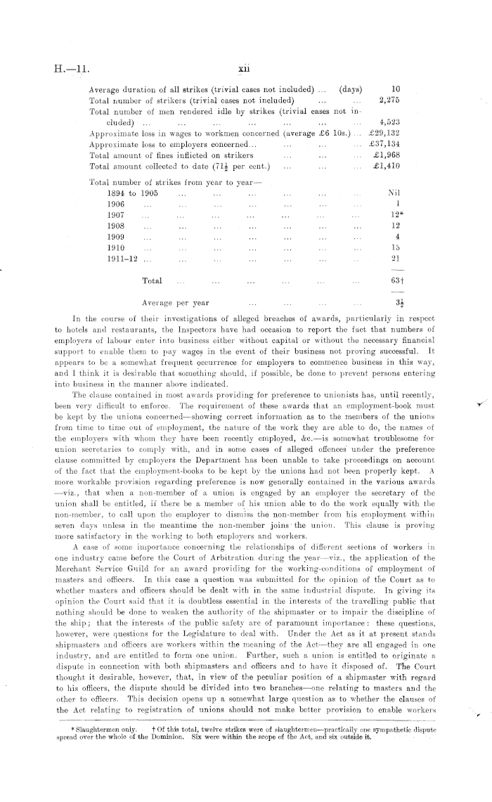 Average duration of all strikes (trivial cases not included) ... (days) 10 Total number of strikers (trivial cases not included) ... ... 2,275 Total number of men rendered idle by strikes (trivial cases not included) ... ... ... ... ... ... ... 4,523 Approximate loss in wages to workmen concerned (average £6 10s.) ... £29,132 Approximate loss to employers concerned... ... ... ... £37,134 Total amount of fines inflicted on strikers ... ... ... £1,968 Total amount collected to date per cent.) ... ... ... £1,410 Total number of strikes from year to year — 1894 to 1905 ... ... ... ... ... ... Nil 1906 ... ... ... ... ... ... ... 1 1907 ... 12* 1908 ... ... ... ... ... ... ... 12 1909 ... ... ... ... ... ... ... 4 1910 ... ... ... ... ... 13 1911-12 ... ... ... ... ... ... .. 21 Total ... ... ... ... ... ... 63+ Average per year ... ... ... ... 3J In the course of their investigations of alleged breaches of awards, particularly in respect to hotels and restaurants, the Inspectors have had occasion to report the fact that numbers of employers of labour enter into business either without capital or without the necessary financial support to enable them to pay wages in the event of their business not proving successful. It appears to be a somewhat frequent occurrence for employers to commence business in this way, and I think it is desirable that something should, if possible, be done to prevent persons entering into business in the manner above indicated. The clause contained in most awards providing for preference to unionists has, until recently, been very difficult to enforce. The requirement of these awards that an employment-book must be kept by the unions concerned —showing correct information as to the members of the unions from time to time out of employment, the nature of the work they are able to do, the names of the employers with whom they have been recently employed, &c. —is somewhat troublesome for union secretaries to comply with, and in some cases of alleged offences under the preference clause committed by employers the Department has been unable to take proceedings on account of the fact that the employment-books to be kept by the unions had not been properly kept. A more workable provision regarding preference is now generally contained in the various awards —viz., that when a non-member of a union is engaged by an employer the secretary of the union shall be entitled, if there be a member of his union able to do the work equally with the non-member, to call upon the employer to dismiss the non-member from his employment within seven days unless in the meantime the non-member joins the union. This clause is proving more satisfactory in the working to both employers and workers. A case of some importance concerning the relationships of different sections of workers in one industry came before the Court of Arbitration during the year —viz., the application of the Merchant Service Guild for an award providing for the working-conditions of employment of masters and officers. In this case a question was submitted for the opinion of the Court as to whether masters and officers should be dealt with in the same industrial dispute. In giving its opinion the Court said that it is doubtless essential in the interests of the travelling public that nothing should be done to weaken the authority of the shipmaster or to impair the discipline of the ship; that the interests of the public safety are of paramount importance : these questions, however, were questions for the Legislature to deal with. Under the Act as it at present stands shipmasters and officers are workers within the meaning of the Act —they are all engaged in one industry, and are entitled to form one union. Further, such a union is entitled to originate a dispute in connection with both shipmasters and officers and to have it disposed of. The Court thought it desirable, however, that, in view of the peculiar position of a shipmaster with regard to his officers, the dispute should be divided into two branches —one relating to masters and the other to officers. This decision opens up a somewhat large question as to whether the clauses of the Act relating to registration of unions should not make better provision to enable workers