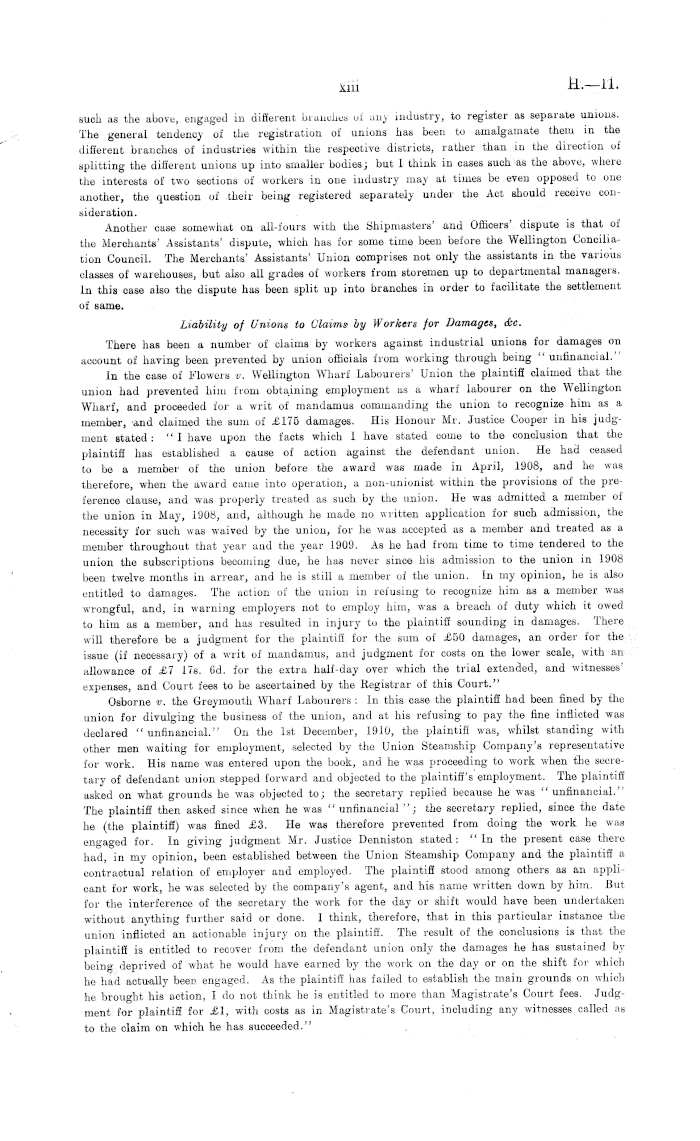such as the above, engaged in different branches of any industry, to register as separate unions. The general tendency of the registration of unions has been to amalgamate them in the different branches of industries within the respective districts, rather than in the direction of splitting the different unions up into smaller bodies; but I think in cases such as the above, where the interests of two sections of workers in one industry may at times be even opposed to one another, the question of their being registered separately under the Act should receive consideration. Another case somewhat on all-fours with the Shipmasters' and Officers' dispute is that of the Merchants' Assistants' dispute, which has for some time been before the Wellington Conciliation Council. The Merchants' Assistants' Union comprises not only the assistants in the various classes of warehouses, but also all grades of workers from storemen up to departmental managers. In this case also the dispute has been split up into branches in order to facilitate the settlement of same. Liability of Unions to Claims by Workers for Damages, &c. There has been a number of claims by workers against industrial unions for damages on account of having been prevented by union officials from working through being " unfinancial." In the case of Flowers v. Wellington Wharf Labourers' Union the plaintiff claimed that the union had prevented him from obtaining employment as a wharf labourer on the Wellington Wharf, and proceeded for a writ of mandamus commanding the union to recognize him as a member, and claimed the sum of £175 damages. His Honour Mr. Justice Cooper in his judgment stated: " I have upon the facts which I have stated come to the conclusion that the plaintiff has established a cause of action against the defendant union. He had ceased to be a member of the union before the award was made in April, 1908, and he was therefore, when the award came into operation, a non-unionist within the provisions of the preference clause, and was properly treated as such by the union. He was admitted a member of the union in May, 1908, and, although he made no written application for such admission, the necessity for such was waived by the union, for he was accepted as a member and treated as a member throughout that year and the year 1909. As he had from time to time tendered to the union the subscriptions becoming due, he has never since his admission to the union in 1908 been twelve months in arrear, and he is still a member of the union. In my opinion, he is also entitled to damages. The action of the union in refusing to recognize him as a member was wrongful, and, in warning employers not to employ him, was a breach of duty which it owed to him as a member, and has resulted in injury to the plaintiff sounding in damages. There will therefore be a judgment for the plaintiff for the sum of £50 damages, an order for the issue (if necessary) of a writ of mandamus, and judgment for costs on the lower scale, with an allowance of £7 17s. 6d. for the extra half-day over which the trial extended, and witnesses' expenses, and Court fees to be ascertained by the Registrar of this Court." Osborne v. the Greymouth Wharf Labourers : In this case the plaintiff had been fined by the union for divulging the business of the union, and at his refusing to pay the fine inflicted was declared "unfinancial." On the Ist December, 1910, the plaintiff was, whilst standing with other men waiting for employment, selected by the Union Steamship Company's representative for work. His name was entered upon the book, and he was proceeding to work when the secretary of defendant union stepped forward and objected to the plaintiff's employment. The plaintiff asked on what grounds he was objected to; the secretary replied because he was "unfinancial." The plaintiff then asked since when he was " unfinancial "; the secretary replied, since the date he (the plaintiff) was fined £3. He was therefore prevented from doing the work he was engaged for. In giving judgment Mr. Justice Denniston stated: "In the present case there had, in my opinion, been established between the Union Steamship Company and the plaintiff a contractual relation of employer and employed. The plaintiff stood among others as an applicant for work, he was selected by the company's agent, and his name written down by him. But for the interference of the secretary the work for the day or shift would have been undertaken without anything further said or done. I think, therefore, that in this particular instance the union inflicted an actionable injury on the plaintiff. The result of the conclusions is that the plaintiff is entitled to recover from the defendant union only the damages he has sustained by being deprived of what he would have earned by the work on the day or on the shift for which he had actually been engaged. As the plaintiff has failed to establish the main grounds on which he brought his action, Ido not think he is entitled to more than Magistrate's Court fees. Judgment for plaintiff for £1, with costs as in Magistrate's Court, including any witnesses called as to the claim on which he has succeeded."