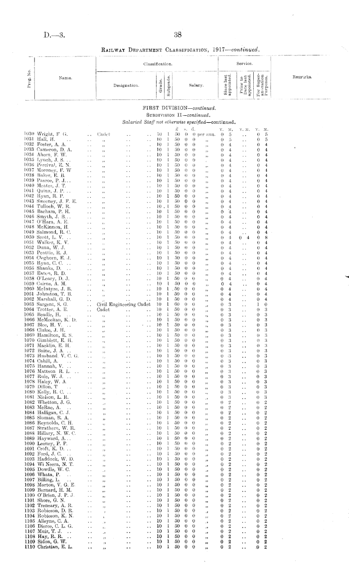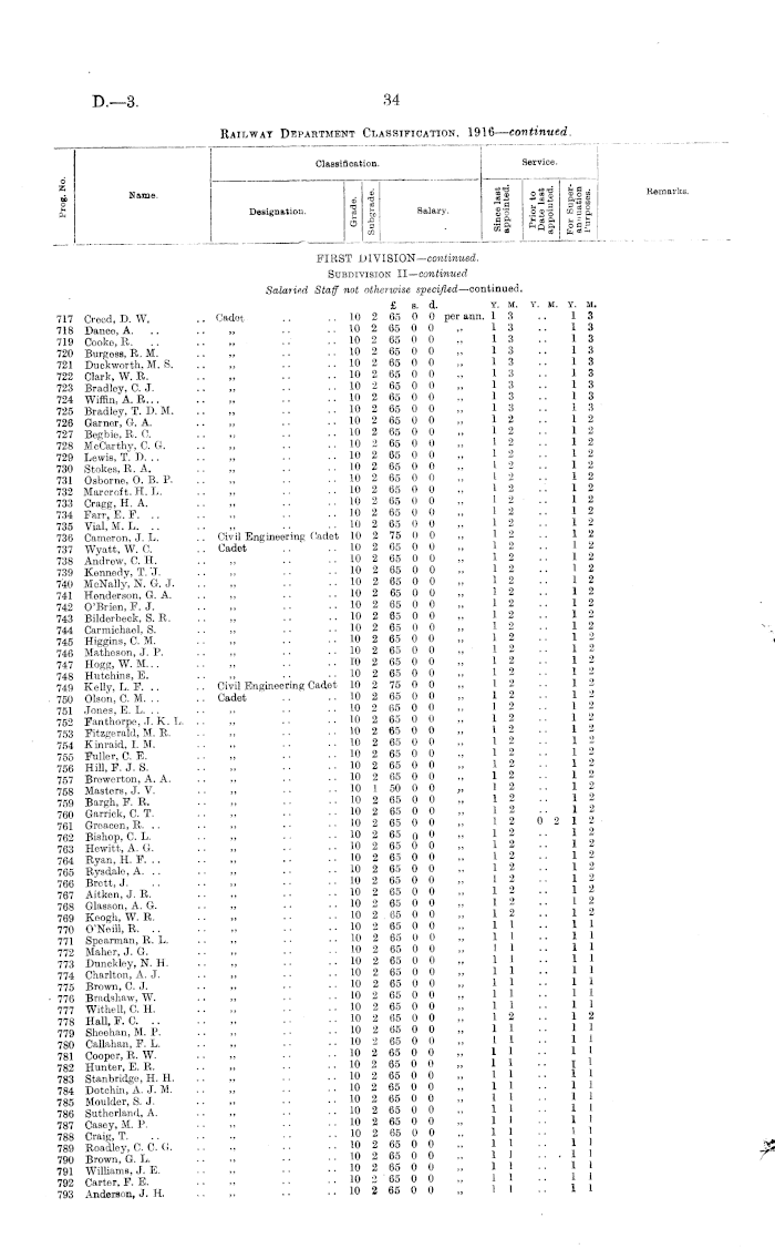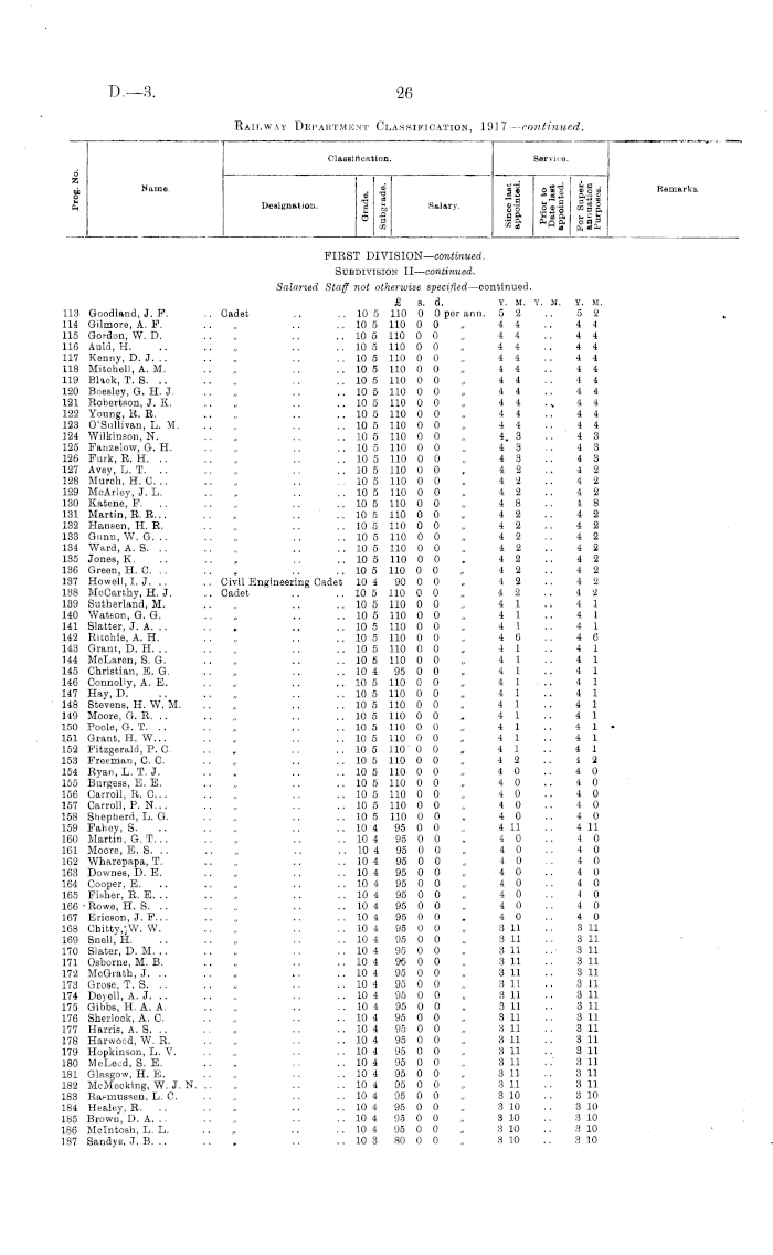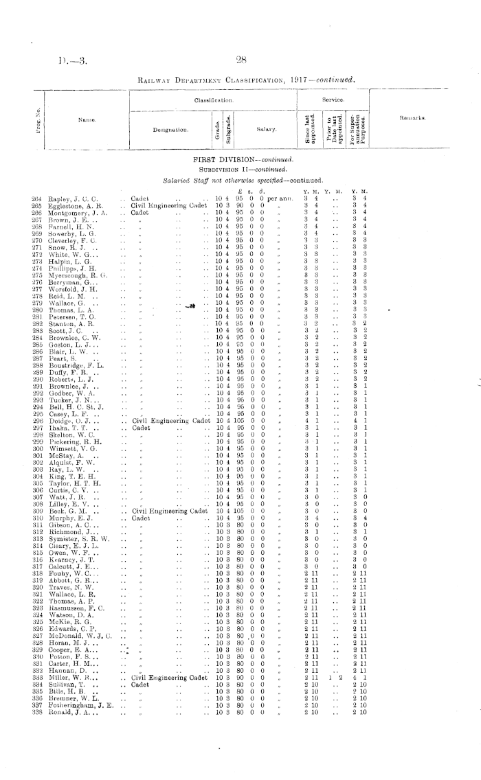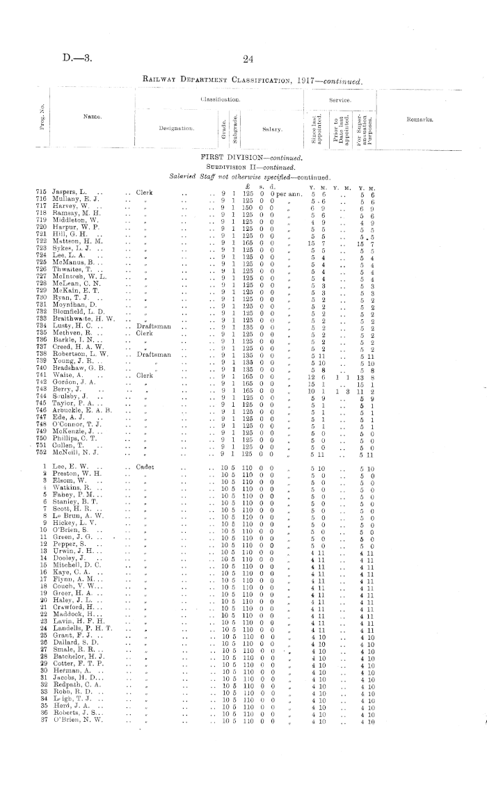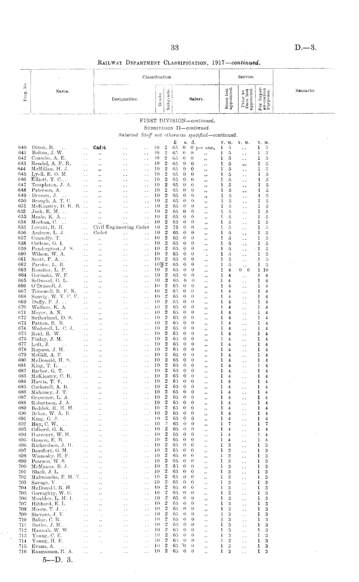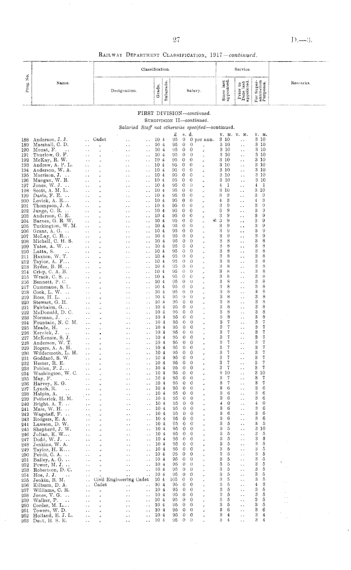 Classification. Service. d Z p Name. Designation. _ at - § CO Salary. |1 Sfg HI _ ° fc~.| B * O So .2 50 CO 3 ft ffi __* * q ft o b P ™ a w * Cq 8ft Remarks. FIRST DIVISION— emtimmd. Subdivision II— continued. Salaried Staff not otherwise specified —oontinued. £ s. d. Y. M. Y. M. 415 Wildermoth, N. J. .. Cadet .. ..103 80 0 Opernnn. 27 416 Brodie, P. .. .. „ .. .. 10 3 80 0 0 „ 2 4 417 Dender, F. A. .. „ .. .. 10 3 80 0 0 „ 2 4 418 Brunsell, C.J. „ .. .. 10 3 80 0 0 „ 2 4 419 Thompson, B. J. .. „ .. .. 10 3 80 0 0 „ 2 4 420 Mann, H. K. .. „ .. .. 10 3 80 0 0 „ 2 4 421 Slater, D. W. .. .. „ .. .. 10 3 80 0 0 „ 2 4 422 Walsh, H. W. .. , .. .. 10 3 80 0 0 „ 2 4 423 Andrew, L. W. .. „ .. .. 10 3 80 0 0 „ 2 4 424 Borne, S. B. .. .. „ .. .. 10 3 80 0 0 „ 2 4 425 Wall, D. D. .. .. „ .. .. 10 3 80 0 0 „ 2 4 426 Hills, B. K. .. .. „ .. .. 10 3 80 0 0 „ 2 4 427 Findlay, G. R. .. „ .. .. 10 3 80 0 0 „ 2 3 428 Simmers, G. A. K. . , Civil Engineering Cadet 10 3 90 0 0 „ 2 3 429 Good, J. L. .. .. Cadet .. .. 10 3 80 0 0 „ 2 3 430 Brown, W. D. .. „ .. .. 10 3 80 0 0 „ 2 3 431 McEachen, K. S .. .. 10 3 80 0 0 „ 2 11 432 Mayne, J. C. .. .. „ .. .. 10 3 80 0 0 „ 2 2 433 McGill, W. J... .. „ .. .. 10 3 80 0 0 „ 2 2 434 McCullougb, H, S. .. „ .. .. 10 3 80 0 0 „ 2 2 435 Muir, H. .. .. „ .. .. 10 3 80 0 0 „ 2 2 436 Hendren, J. C. .. „ .. .. 10 3 80 0 0 „ 2 2 437 Feeney, E. T. .. „ .. .. 10 3 80 0 0 „ 2 2 438 Brass, G. H. .. .. „ .. 10 3 80 0 0 „ 2 2 439 Lynch, W. G. .. .. „ .. .. 10 3 80 0 0 „ 2 2 440 Meehan, H .. .. „ ... .. 10 3 80 0 0 „ 2 2 441 Donaldson, J. J. A. .. „ ,. .. 10 3 80 0 0 „ 2 2 442 Renai, W. E. .. .. „ .. .. 10 3 80 0 0 „ 2 1 443 Taylor, L. A. .. .. „ .. .. 10 3 80 0 0 „ 2 1 444 Carline, G. T... ., „ .. .. 10 3 80 0 0 „ 2 1 445 Duncan, J. .. .. „ .. .. 10 3 80 0 0 „ 2 1 446 Wilde, D. .. .. „ .. .. 10 3 80 0 0 „ 2 1 447 Harold, T. W. .. „ .. .. 10 3 80 0 0 „ 2 1 448 Cashion, J. J. .. .. „ .. .. 10 3 80 0 0 „ 2 1 449 Bryden, P. B... .. Civil Engineering Cadet 10 3 90 0 0 „ 2 1 450 Brown, J. R. M. H. .. Cadet .. .. 10 3 80 0 0 „ 2 1 451 Martin, J. A. .. .. „ .. .. 10 3 80 0 0 „ 2 1 452 Harbidge, R. R. .. „ .. .. 10 3 80 0 0 „ 2 1 453 Tregurtha, K. W. .. „ .. .. 10 3 80 0 0 „ 2 1 454 Grey, A. .. .. „ .. .. 10 3 80 0 0 „ 2 1 455 Ansford, C. E. C. .. „ .. .. 10 3 80 0 0 „ 2 1 456 Peters, G. H. .. .. „ .. .. 10 2 65 0 0 „ 2 1 457 Gasson, P. W. .. „ .. .. 10 3 80 0 0 „ 2 1 458 Shaw, A. .. .. „ .. .. 10 3 80 0 0 „ 2 1 459 Gaw, E. V. .. .. „ .. .. 10 3 80 0 0 „ 2 1 460 Stevens, H. G. .. Civil Engineering Cadet 10 3 90 0 0 „ 2 1 461 Dunn, S. M. J. .. Cadet .. .. 10 3 80 0 0 „ 2 1 462 Williams, O. .. .. „ .. .. 10 3 80 0 0 „ 2 1 463 Angus, W. M... .. Civil Engineering Cadet 10 3 90 0 0 , 2 1 464 Trott, V. U. .. .. Cadet .. .. 10 3 80 0 0 „ 2 1 465 Robson, W. C .. „ .. .. 10 3 80 0 0 „ 2 1 466 Dow, J. .. .. Civil Engineering Cadet 10 3 90 0 0 „ 2 1 467 Grimwood, R. L. .. Cadet .. .. 10 3 80 0 0 „ 2 1 468 Murisou, A. H. .. Civil Engineering Cadet 10 3 90 0 0 „ 2 1 469 Rowland, L. L. .. Cadet .. .. 10 3 80 0 0 „ 2 0 470 Jaokson, T. S. .. „ .. .. 10 3 80 0 0 "„ 2 0 471 Black, N.J... .. „ .. .. 10 3 80 0 0 „ 2 0 472 Walsh, B. A... .. „ .. .. 10 3 80 0 0 „ 2 0 473 Carnachan, W. R. .. Civil Engineering Cadet 10 3 90 0 0 „ 2 0 474 Kealy, M. .. .. Cadet .. .. 10 3 80 0 0 „ 2 0 475 Boswell, G. R. .. „ .. .. 10 3 80 0 0 „ 2 0 476 Barnard, O. V. .. „ .. .. 10 2 65 0 0 „ 3 8 477 Lister, H. R. .. .. , .. .. 10 2 65 0 0 „ 3 8 478 Hyland, J.J... .. , .. .. 10 2 65 0 0 „. 3 6 479 Coulson, H. .. .. „ .. .. 10 2 65 0 0 „ 2 2 480 Colbert, P. O. .. .. „ .. .. 10 2 65 0 0 „ 2 1 481 Breen, A. J. .. .. „ . .. .. 10 2 65 0 0 . 2 0 482 Kensington, N. D. C. . . „ .. .. 10 2 66 0 II „ 2 0 483 Litherland, W. J. .. Civil Engineering Cadet 1.0 2 75 0 0 „ 2 0 484 Ward, C. T. A. . . Cadet . . .. 10 2 65 0 0 ,. 2 0 485 Blake, J. G. .. .. „ .. .. 10 2 65 0 0 „ 1 11 486 Macown, D. N. .. „ . . .. 10 2 65 0 0 „ 111 487 Stowart, J. .. „ . . .. 10 2 65 0 0 „ 111 488 Borlase, J. L. . . „ .. .. 10 2 65 0 0 „ 111 489 O'Connor, H. V. ,, .. .. 10 2 65 0 0 , 11)23 Y. If. 2 7 2 4 2 4 2 4 2 4 2 4 2 4 2 4 2 4 2 4 2 4 2 4 2 3 2 3 2 3 2 3 2 11 2 2 2 2 2 2 2 2 2 2 2 2 2 2 2 2 2 2 2 2 2 1 2 1 2 1 2 1 2 1 2 1 2 1 2 1 2 1 2 1 2 1 2 1 2 1 2 1 2 1 2 1 2 1 2 1 2 1 2 1 2 1 2 1 2 1 2 1 2 1 2 1 2 1 2 0 2 0 2 0 2 0 2 0 2 0 2 0 3 8 3 8 3 6 2 2 2 1 2 0 2 0 2 0 2 0 1 11 1 11 1 11 1 11 3 1
