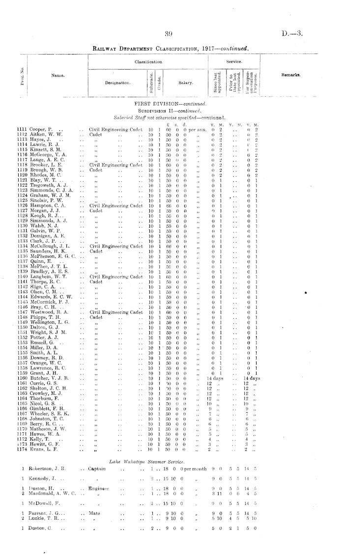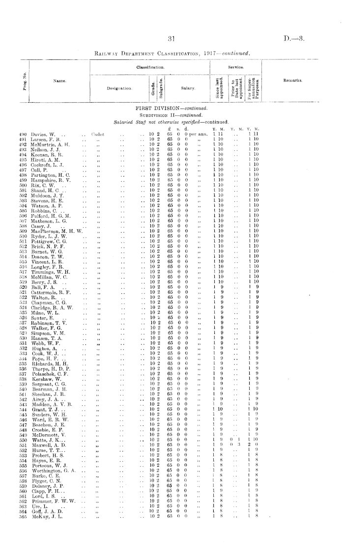 MEMBERS OF THE RAILWAY DEPARTMENT. LIST SETTING OUT IN ORDER OF CLASSIFICATION THE NAME, STATUS, AND PAY OF EACH MEMBER AND PROBATIONER, AND THE NUMBER OF YEARS HE HAS BEEN IN THE SERVICE OF THE DEPARTMENT ON 1st APRIL, 1917., Appendix to the Journals of the House of Representatives, 1917 Session I, D-03