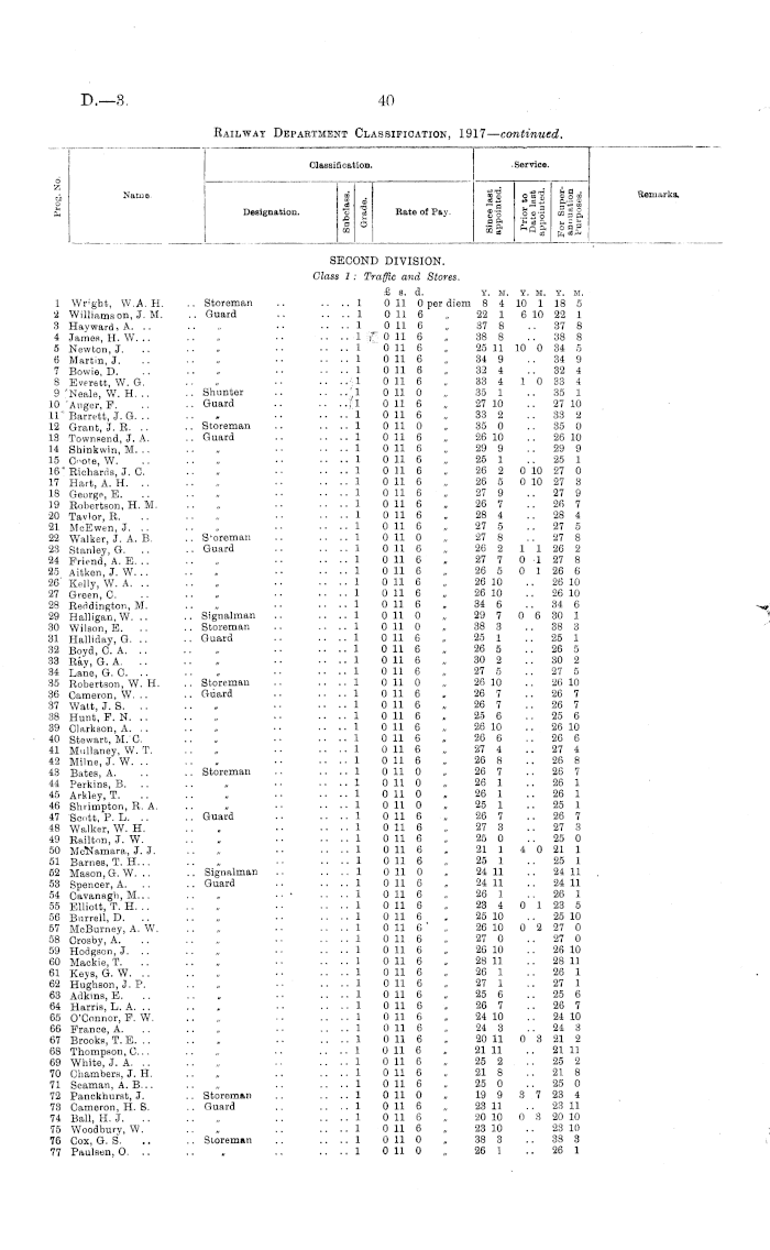 Classification. Service. Classification. d i 6 S3 j, Name. o h ,S . is"? o«1 S3 § » Bemarke. Designation. & « Salary. §| g«| oq § f i s is sa| hi I :-. IB Cβ 3 FIRST mviSlON-continued, Subdivision II— continued. .02 Tasker, J. M. .. i03 O'Connor, T. A. 1.04 White, W. F. .. L05 Carnachan, J. L06 Jarman, W. H. L07 MoOomish, J. D. 108 Moon, 0. J. .. L09 Virtue, C. H. L10 Reay, J. W. Ill Holland, D. F. L12 Coomber, A. E. 113 Marshall, W. A, 114 Press, C. W. .. 115 Hunt, F. B. .. Hβ Kearin, M. P, .. L17 Beauohamp, E. P. .18 Gifiord, B. 0, .. L19 Bennett, W. F. L20 Marsh, G. 121 Longton, A. N. 122 Mahony, D. .. 123 Moore, R. H. T. L24 Lennon, C. J. .. .28 Lowry, J. W. .. .26 Miller, W. P. .. .27 Radford, W. ,T. B, .28 Davies, C. J. .. .29 Tomkies, B, A. .30 MoKnight, J. .. L31 Olarkson, W. .. 132 Bowman, J. .. 133 O'Keefe, B. J, H. .34 Currie, J. L86 DeClifford, 0. L. .30 Olson, H. T . .. 137 Herdman, T. P. .38 White, J. .39 Beere, G. B. .. L40 Vernazoni, F. .. .41 Jull, J. W. .. L4y Smith, J. .43 Berrill, E. VV. .. .44 Roulston, N. .45 Hannagan, C. J. F. .46 Frost, G. S. .47 Robb, W. V. .. L48 Winton, J. S... .49 Stone, J. .50 Lowe, H. H. .51 Hiskens, D. C. .52 Trevella, 3. .. .53 Cox, W. .54 Hampton, B. .. .55 Hill, R. .50 Vance, M. L57 Brown, G. L, .. .58 McNeil, A. .59 Greatbatch, E. .(50 Low, D. .01 Berry, 0. G. G. 02 Keenan, P. St. J. .63 Parkin, H. .04 Shiels, J. A. .. .05 McKay, J. .60 -Jolly, L. C. .67 Gilchrist, F. W. .08 Auger, A. .09 Tuohy, T. H. .. 70 Chandler, T. F. .71 Moller, A. W... L72 Paterson, H. L. 173 Haydon, R. A. SalarieA Staff not otherwise specified —oontinued. £ s. d. y. M. Y, u. y. m. .. Stationmaster ..83 260 0 0 per ann. 20 10 .. 20 10 .. Clerk .. .. 8 3 260 0 0 „ 20 9 .. 20 9 .. Stationmaster .. 8 3 260 0 0 „ 20 9 .. 20 9 .. 8 3 260 0 0 „ 20 9 20 9 . Clerk .. .. 8 3 260 0 0 „ 20 9 .. 20 9 .. 8 3 260 0 0 „ 20 7 20 7 .. Stationmastor .. 8 3 260 0 0 „ 20 6 .. 20 0 .. Olerk .. .. 8 8 260 0 0 „ 20 6 .. 20 6 .. 8 3 260 0 0 „ 16 0 14 4 16 4 .. Stationmaster ..83 260 00 „ 16 0 16 0 .. Clerk .. .. 8 3 260 0 0 „ 16 0 .. 16 0 .. Stationmaster ..83 260 0 0 „ 15 9 8 10 15 9 .. Clerk .. .. 8 3 260 0 0 „ 15 7 0 6 16 1 .. Stationmaster .. 8 3 260 0 0 „ 15 7 0 5 16 0 .. Clerk .. .. 8 3 260 0 0 „ 15 1 0 11 10 (I .. 8 3 260 0 0 , 15 0 0 10 15 9 .. Stationmaster ..8 3 260 0 0 , 14 11 0 8 15 2 .. Clerk .. .. 8 3 260 0 0 „ 14 9 0 10 15 7 .. 8 3 260 0 0 „ 14 8 1 2 15 10 .. 8 3 260 0 0 „ 20 0 20 0 .. 8 3 260 0 0 „ 20 5 20 5 .. 8 3 260 0 0 „ 14 5 1 2 15 7 ..83 260 00 „ 20 3 20 8 .. S 3 200 0 0 „ 20 0 20 0 .. 8 3 200 0 0 „ 19 8 .. 19 8 .. Coaching Foreman ..8 3 260 0 0 „ 20 10 4 5 81 i .. 8 3 260 0 0 „ 81 10 31 10 .. Klectric-lines Inspector 8 8 260 0 0 „ 15 5 0 2 Lβ 8 Maximum for present posi tion, £260 per annum, .. Coaching Foreman .. 8 3 260 0 0 „ 21 10 .. 21 10 ..8 3 260 0 0 „ 33 0 1 8 34 8 .. Goods Foreman ..8 3 260 0 0 „ 32 11 .. 32 11 .. Coaching Foreman ..83 260 0 0 „ 36 10 .. 36 10 .. Goods Foreman .. 8 3 260 0 0 „ 34 10 .. 34 10 .. Coaching Foreman .. 8 3 260 0 0 „ 30 0 .. 30 6 .. 8 3 260 0 0 „ 29 1 .. 29 1 .. 8 3 260 0 0 „ 8 4 20 8 10 11 .. Goods Foreman .. 8 3 260 0 0 „ 8 4 S 10 14 2 .. 8 8 260 0 0 27 10 .. 27 10 .. 8 3 260 0 0 32 2 .. 32 2 .. Ticket Inspector ..83 260 0 0 . 36 3 .. 36 8 .. Uoaohing Foreman .. 8 8 2G0 0 0 „ 31 10 .. 81 10 .. Ticket Inspeotor .. 8 3 260 0 0 „ 30 0 0 6 31 0 .. 8 8 260 0 0 26 4 8 I 34 6 .. 8 8 260 0 0 29 7 0 6 30 1 .. Coaching Foreman ..83 260 00 „ 28 2 28 2 .. Tioket Inspeotor .. 8 3 260 0 0 „ 28 6 .. 28 6 .. Coaching Foreman .. 3 8 260 0 0 „ 33 11 .. 33 11 .. Ticket Inspector .. 8 3 260 0 0 „ 30 5 30 5 .. Coaching Foreman .. 8 8 260 0 0 „ 27 4 27 4 .. Goods Foreman .. 8 8 260 0 0 „ 27 6 27 6 .. Assist. Loco. Foreman.. s 3 260 0 0 „ 40 0 .. 40 0 Ditto. .. Goods Foreman .. 8 8 260 0 0 „ 26 4 .. 26 4 .. Coaohing Foreman .. 8 3 260 0 0 „ 31 9 .. 31 9 .. Tickot Inspector ..83 260 0 0 „ 34 2 .. 34 2 .. Olerk .. ..88 260 00 , 20 2 20 2 .. K 3 260 0 0 „ 20 1 .. 20 I .. 8 3 260 0 0 „ 20 1 .. 20 1 .. Stationmastei: .. 8 8 260 0 0 „ 27 <J 0 8 28 0 .. Clerk .. .. 8 3 260 0 0 „ 35 4 .. 35 4 .. Draftsman .. .. 8 3 260 0 0 „ 15 0 5 11 20 11 .. Staff Officer (Railway fi 3 260 0 0 „ 4 0 4. f> 8 5 Battalion) .. Goods Foreman .. 8 3 260 0 0 „ 2G 7 .. 26 7 ..8 3 260 0 0 „ 26 7 26 7 .. Shop Foreman .. 8 3 260 0 0 „ 26 1 11 10 26 1 Ditto. .. Stationmaater .. 8 3 '260 0 0 „ 20 1 .. 20 1 .. Clerk .. .. 8 3 260 0 0 „ 20 1 .. 20 1 . . Goods Foreman .. 8 3 260 0 0 „ 28 5 .. 28 5 .. Clerk .. .. 8 3 200 0 0 „ 20 0 .. 20 0 .. 8 3 260 0 0 „ 20 0 20 0 .. 8 3 260 0 0 „ 19 11 19 11 .. Goods Foreman ..83 260 0 0 , 26 7 .. 26 7 .. Workshop Foreman .. 8 8 260 0 0 „ 32 6 .. 32 6 Ditto,