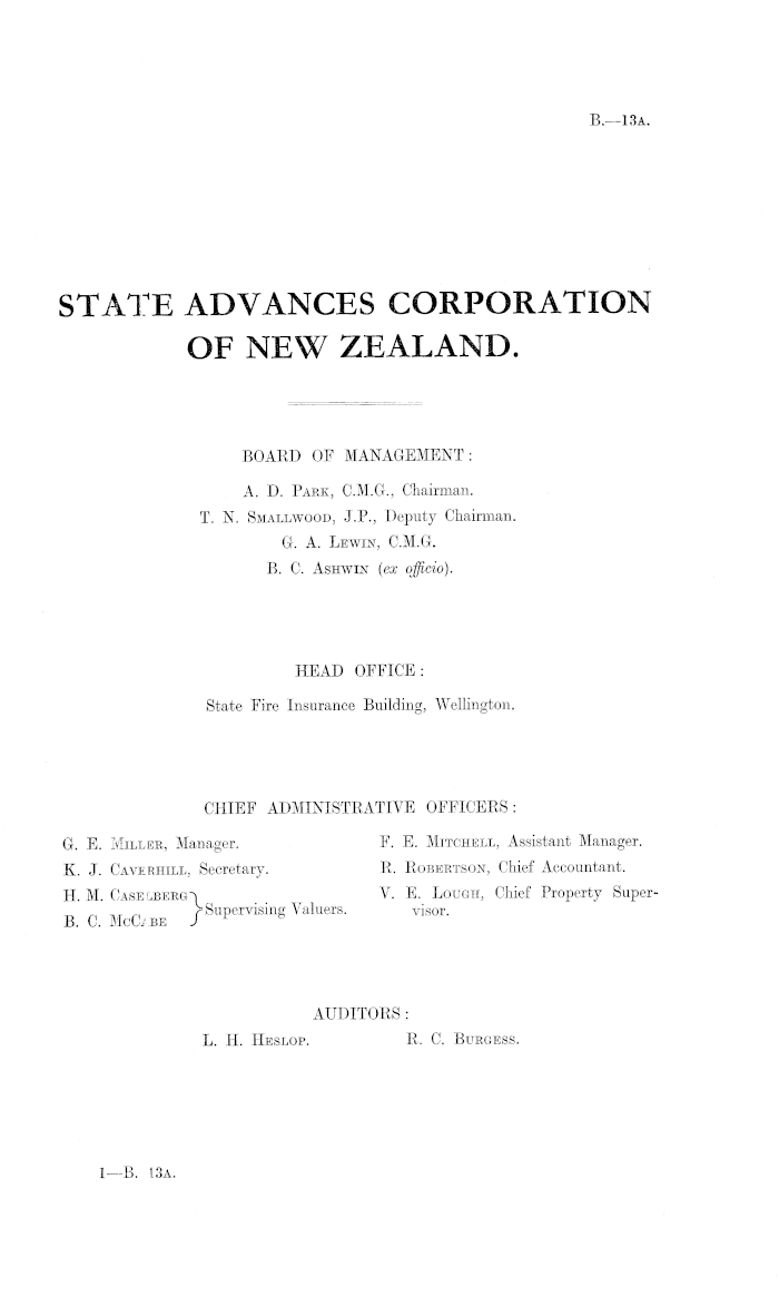 BOARD OF MANAGEMENT: A. D. Park, C.M.G., Chairman. T. N. Smallwood, J.P., Deputy Chairman. G. A. Lewin, C.M.G. B. C. Ashwin (ex officio). HEAD OFFICE: State Fire Insurance Building, Wellington. CHIEF ADMINISTRATIVE OFFICERS: G. E. Miller, Manager. F. E. Mitchell, Assistant Manager. K. J. Caverhill, Secretary. R. Robertson, Chief Accountant. H. M. V. E. Lough, Chief Property Super B. C. McCkBE Vataers ' AUDITORS : L. H. Heslop. R. C. Burgess.