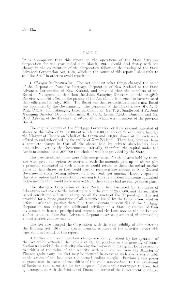 PART I. It is appropriate that this report on the operations of the State Advances Corporation for the year ended 31st March, 1937, should deal firstly with the change in the constitution of the Corporation following the passing of the State Advances Corporation Act, 1936, which in the course of this report I shall refer to as " the Act " in order to avoid repetition. 1. Changes in Constitution. —The Act amongst other things changed the name of the Corporation from the Mortgage Corporation of New Zealand to the State Advances Corporation of New Zealand, and provided that the members of the Board of Management other than the Joint Managing Directors and the ex officio Director who held office on the passing of the Act should be deemed to have vacated their offices on Ist July, 1936. The Board was then reconstituted, and a new Board was appointed by the Government. The personnel of the Board is now Mr. A. D. Park, C.M.G., Joint Managing Director, Chairman, Mr. T. N. Smallwood, J.P., Joint Managing Director, Deputy Chairman, Mr. 0. A. Lewin, C.M.G., Dunedin, and Mr. B. C. Asliwin, of the Treasury, ex officio, all of whom were members of the previous Board. The original capital of the Mortgage Corporation of New Zealand consisted of shares to the value of £1,000,000 of which 500,000 shares of £l each were held by the Minister of Finance on behalf of the Crown and 500,000 shares of £l each were offered to and subscribed by the public of New Zealand. There has, however, been a complete change in that all the shares held by private shareholders have been taken over by the Government. Actually, therefore, the capital under the Act is maintained at £1,000,000 the whole of which is provided by the State. The private shareholders were fully compensated for the shares held by them, and were given the option to receive in cash the amounts paid up on shares plus a premium calculated at such a rate as would return to them the actual market value of their shares, or they could elect to receive a like amount in New Zealand Government stock bearing interest at 4 per cent, per annum. Broadly speaking this latter option had the effect of preserving to the shareholders an income equivalent to the income they would have received from their shares had no change taken place. The Mortgage Corporation of New Zealand had borrowed by the issue of debentures and stock to the investing public the sum of £500,000, and the securities issued constituted a floating charge on all the assets of the Corporation. The Act provided for a State guarantee of all securities issued by the Corporation, whether before or after the passing thereof, so that investors in securities of the Mortgage Corporation now enjoy the additional privilege of a State guarantee of their investment both as to principal and interest, and the issue now on the market and all further issues of the State Advances Corporation are so guaranteed, thus providing a most attractive investment. The Act also charged the Corporation with the responsibility of administering the Housing Act, 1919, but special mention is made of the activities under this legislation in Part II of this report. A further and most important change was brought about by the operation of the Act which extended the powers of the Corporation in the granting of loans. Section 30 provided the authority whereby the Corporation may grant loans exceeding two-thirds of the value of the security with a guarantee from the Minister of Finance against any loss that may be incurred in so far as such loss is attributable to the excess of the loan over the normal lending margin. Previously this power to grant loans in excess of two-thirds of the value was confined to the investment of funds on rural securities for the purpose of discharging mortgages thereon, bat by arrangement with the Minister of Finance in terms of the Government guarantee