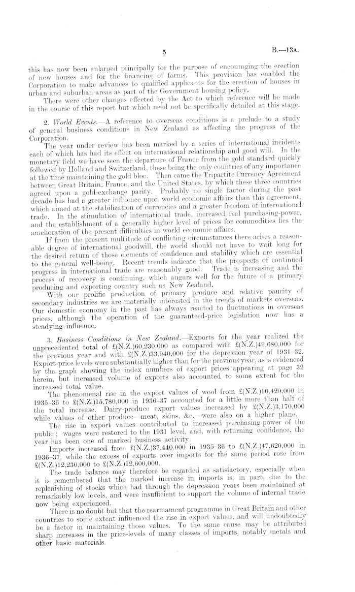 this has now been enlarged principally for the purpose of encouraging the erection of new houses and for "the financing of farms. This provision has enabled the Corporation to make advances to qualified applicants for the erection ot houses m urban and suburban areas as part of the Government housing policy. ■ There were other changes effected by the Act to which reference will be made in the course of this report but which need not be specifically detailed at this stage. 2. World Events.—A- reference to overseas conditions is a prelude to a study of general business conditions in New Zealand as affecting the progress of the C ° ? The year under review has been marked by a series of international incidents each of which has had its effect on international relationship and good will In the monetary field we have seen the departure of France from the gold standard quickly followed by Holland and Switzerland, these being the only countries of any importance at the time maintaining the gold bloc. Then came the Tripartite Currency Agreemen between Great Britain, France, and the United States, by which these three countries agreed upon a gold-exchange parity. Probably no single factor during the past decade has had a greater influence upon world economic affairs than this agreement, which aimed at the stabilization of currencies and a greater freedom of international trade In the stimulation of international trade, increased real purchasing-power, and the establishment of a generally higher level of prices for commodities lies the amelioration of the present difficulties in world economic affairs. If from the present multitude of conflicting circumstances there arises a reasonable degree of international goodwill, the world should not have to wait long tor the desired return of those elements of confidence and stability which are essential to the general well-being. Kecent trends indicate that the prospects of continued progress in international trade are reasonably good. Trade is increasing and the process of recovery is continuing, which augurs well for the future of a primary producing and exporting country such as New Zealand. With our prolific production of primary produce and relative paucity ot secondary industries we are materially interested in the trends of markets overseas. Our domestic economy in the past has always reacted to fluctuations m overseas prices, although the operation of the guaranteed-pnce legislation now has a steadying influence. 3 Business Conditions in New Zealand. —-Exports for the year realized the unprecedented total of £(N.Z.)60,230,000 as compared with £(N.Z.)49,680 000 for the previous year and with £(N.Z.)33,940,000 for the depression year of 1931-32. Export-price levels were substantially higher than for the previous year, as is evidenced by the graph showing the index numbers of export prices appearing at page 32 herein, but increased volume of exports also accounted to some extent tor the The phenomenal rise in the export values of wool from £(N.Z.)10,420, 000 in 1 to £(N Z Ho 780,000 in 1936-37 accounted for a little more than halt ot the total increase. export values increased by £(N Z.)3,170,000 while values of other produce--meat, skins, &c.—were also on a higher plane. The rise in export values contributed to increased purchasmg-power ot the public ; wages were restored to the 1931 level, and, with returning confidence, the year has been one of marked business activity. . Imports increased from £(N.Z.)37,440,000 m 1935-36 to £(N.Z.)47 620,000 m 1936-37, while the excess of exports over imports for the same period rose from £(N.Z.)12,230,000 to £(N.Z.)12,600,000. . The trade balance may therefore be regarded as satisfactory, especially when it is remembered that the marked increase in imports is, m part, due to the replenishing of stocks which had through the depression years been maintained at remarkably low levels, and were insufficient to support the volume of internal trade now being experienced. . . , There is no doubt but that the rearmament programme m Great Britain and other countries to some extent influenced the rise in export values, and will undoubted y be a factor in maintaining those values. To the same cause may be attributed sharp increases in the price-levels of many classes of imports, notably metals and other basic materials.