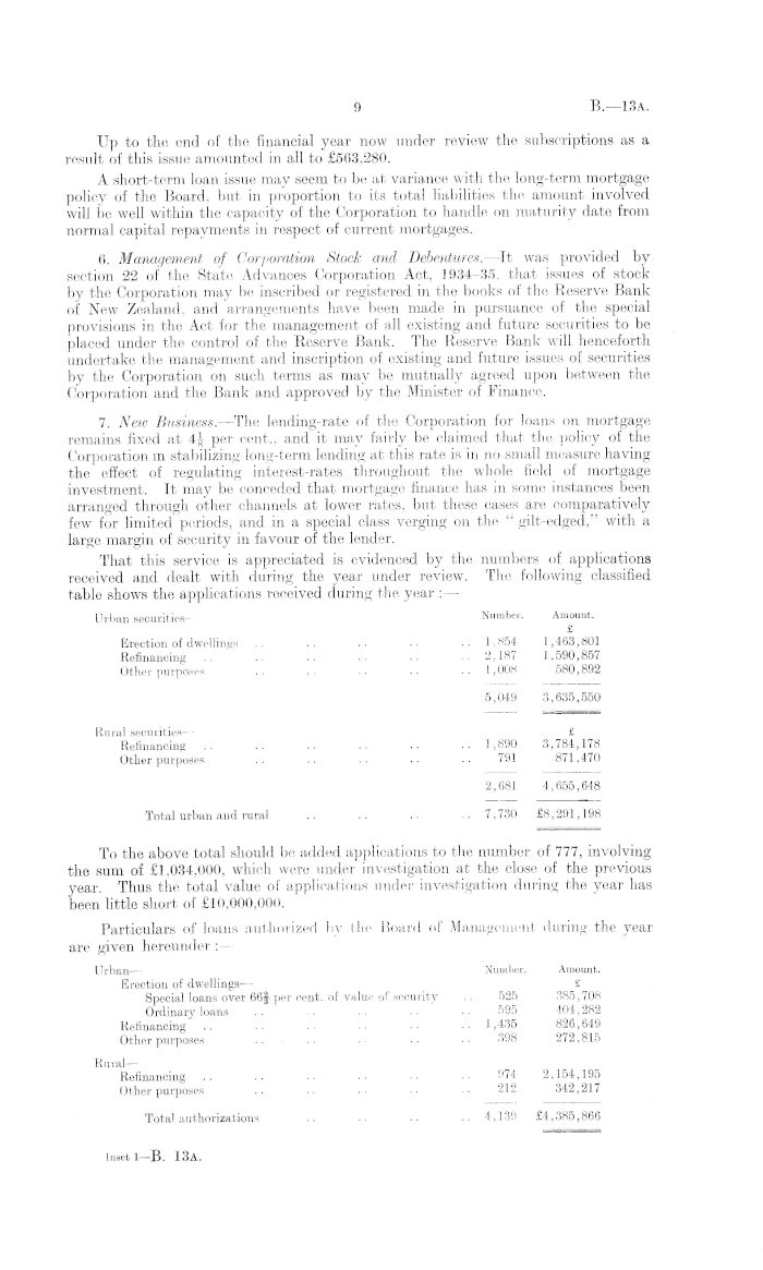 Up to the end of the financial year now under review the subscriptions as a result of this issue amounted in all to £563,280. A short-term loan issue may seem to be at variance with the long-term mortgage policy of the Board, but in proportion to its total liabilities the amount involved will be well within the capacity of the Corporation to handle on maturity date from normal capital repayments in respect of current mortgages. 6. Management of Corporation Stock and Debentures. —It was provided by section 22 of the State Advances Corporation Act, ] 934-35, that issues of stock by the Corporation may be inscribed or registered in the books of the Reserve Bank of New Zealand, and arrangements have been made in pursuance of the special provisions in the Act for the management of all existing and future securities to be placed under the control of the Reserve Bank. The Reserve Bank will henceforth undertake the management and inscription of existing and future issues of securities by the Corporation on such terms as may be mutually agreed upon between the Corporation and the Bank and approved by the Minister of Finance. 7. Neiv Business. —The lending-rate of the Corporation for loans on mortgage remains fixed at per cent., and it may fairly be claimed that the policy of the Corporation m stabilizing long-term lending at this rate is m no small measure having the effect of regulating interest-rates throughout the whole field of mortgage investment. It may be conceded that mortgage finance has in some instances been arranged through other channels at lower rates, but these cases are comparatively few for limited periods, and in a special class verging on the " gilt-edged," with a large margin of security in favour of the lender. That this service is appreciated is evidenced by the numbers of applications received and dealt with during the year under review. The following classified table shows the applications received during the year :— Urban securities— Number. Amount. £ Erection of dwellings .. .. .. .. .. 1,854 1,463,801 Refinancing .. .. •• •• •• •• 2,187 1,590,857 Other purposes .. .. •• •• •• 1,008 580,892 5,049 3,635,550 Rural securities — £ Refinancing .. •• •• ■■ 1,890 3,784,178 Other purposes .. .. •• •• •• 791 871,470 2,681 4,655,648 Total urban and rural .. .. .. ..7,730 £8,291,198 To the above total should be added applications to the number of 777, involving the sum of £1,034,000, which were under investigation at the close of the previous year. Thus the total value of applications under investigation during the year has been little short of £10,000,000. Particulars of loans authorized by the Board of Management during the year are given hereunder : — Urban- — Number. Amount. Erection of dwellings— £ Special loans over 66| per cent, of value of security . . 525 385,708 Ordinary loans .. .. .. . ■ • • 595 404,282 Refinancing .. .. • • ■ ■ ■ ■ .. 1, 435 826,649 Other purposes ■■ 398 272,815 Hural Refinancing .. .. •• 974 2,154,195 Other purposes .. .. •• •• 212 342,217 Total authorizations .. 4,139 £4,385,866
