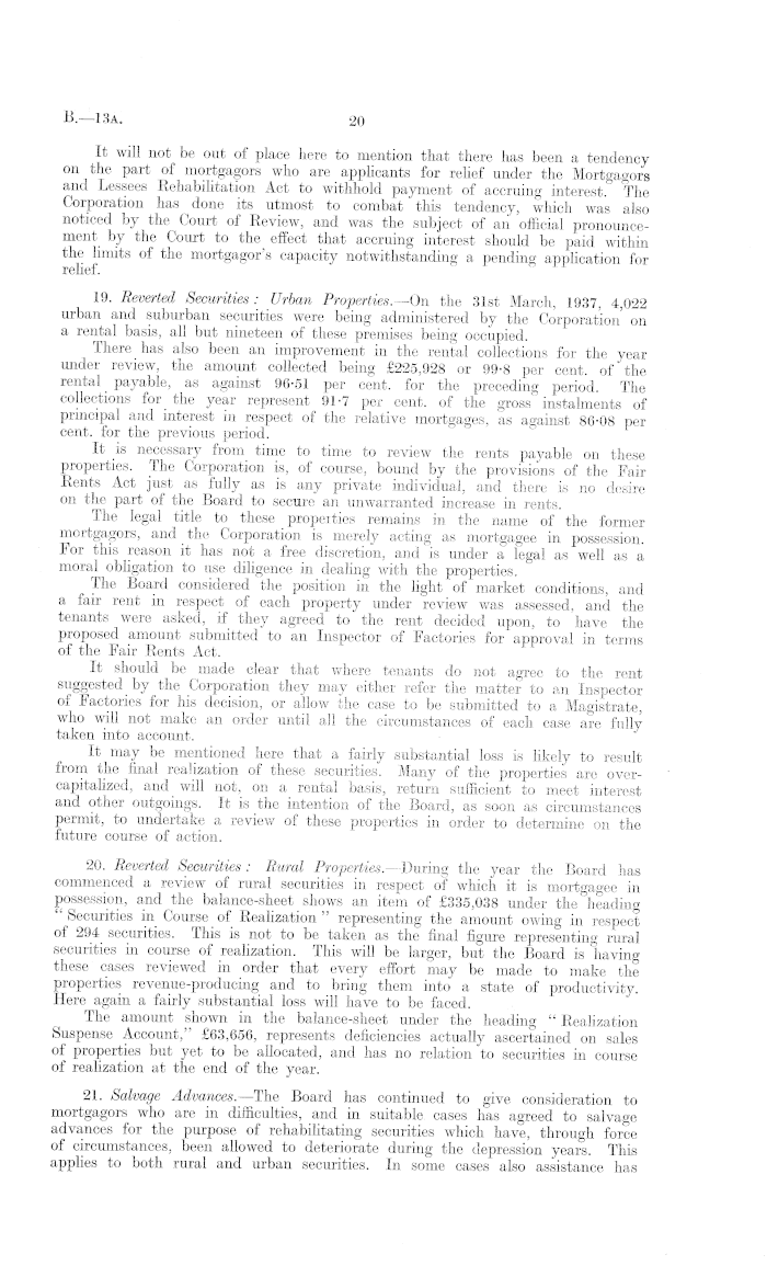 It will not be out of place here to mention that there has been a tendency on the part of mortgagors who are applicants for relief under the Mortgagors and Lessees Rehabilitation Act to withhold payment of accruing interest. The Corporation has done its utmost to combat this tendency, which was also noticed by the Court of Review, and was the subject of an official pronouncement by the Court to the effect that accruing interest should be paid within the limits of the mortgagor's capacity notwithstanding a pending application for relief. 19. Reverted Securities: Urban Properties.—On the 31st March, 1937, 4,022 urban and suburban securities were being administered by the Corporation on a rental basis, all but nineteen of these premises being occupied. There has also been an improvement in the rental collections for the year under review, the amount collected being £225,928 or 99-8 per cent, of the rental payable, as against 96*51 per cent, for the preceding period. The collections for_ the year represent 91-7 per cent, of the gross instalments of principal and interest in respect of the relative mortgages, as against 86-08 per cent, for the previous period. It is necessary from time to time to review the rents payable on these properties. The Corporation is, of course, bound by the provisions of the Fair Rents Act just as fully as is any private individual, and there is no desire on the part of the Board to secure an unwarranted increase in rents. The legal title to these properties remains in the name of the former mortgagors, and the Corporation is merely acting as mortgagee in possession. For this reason it has not a free discretion, and is under a legal as well as a moral obligation to use diligence in dealing with the properties. The Board considered the position in the light of market conditions, and a fair rent in respect of each property under review was assessed, and the tenants were asked, if they agreed to the rent decided upon, to have the proposed amount submitted to an Inspector of Factories for approval in terms of the Fair Rents Act. It should be made clear that where tenants do not agree to the rent suggested by the Corporation they may either refer the matter to an Inspector of Factories for his decision, or allow the case to be submitted to a Magistrate, who will not make an order until all the circumstances of each case are fully taken into account. It may be mentioned here that a fairly substantial loss is likely to result from the final realization of these securities. Many of the properties are overcapitalized, and will not, on a rental basis, return sufficient to meet interest and other outgoings. It is the intention of the Board, as soon as circumstances permit, to undertake a review of these properties in order to determine on the future course of action. 20. Reverted Securities: Rural Properties.- During the year the Board has commenced a review of rural securities in respect of which it is mortgagee in possession, and the balance-sheet shows an item of £335,038 under the "heading " Securities in Course of Realization " representing the amount owing in respect of 294 securities. This is not to be taken as the final figure representing rural securities in course of realization. This will be larger, but the Board is having these cases reviewed in order that every effort may be made to make the properties revenue-producing and to bring them into a state of productivity. Here again a fairly substantial loss will have to be faced. The amount shown in the balance-sheet under the heading "Realization Suspense Account," £63,656, represents deficiencies actually ascertained on sales of properties but yet to be allocated, and has no relation to securities in course of realization at the end of the year. 21. Salvage Advances. The Board has continued to give consideration to mortgagors who are in difficulties, and in suitable cases has agreed to salvage advances for the purpose of rehabilitating securities which have, through force of circumstances, been allowed to deteriorate during the depression years. This applies to both rural and urban securities. In some cases also assistance has