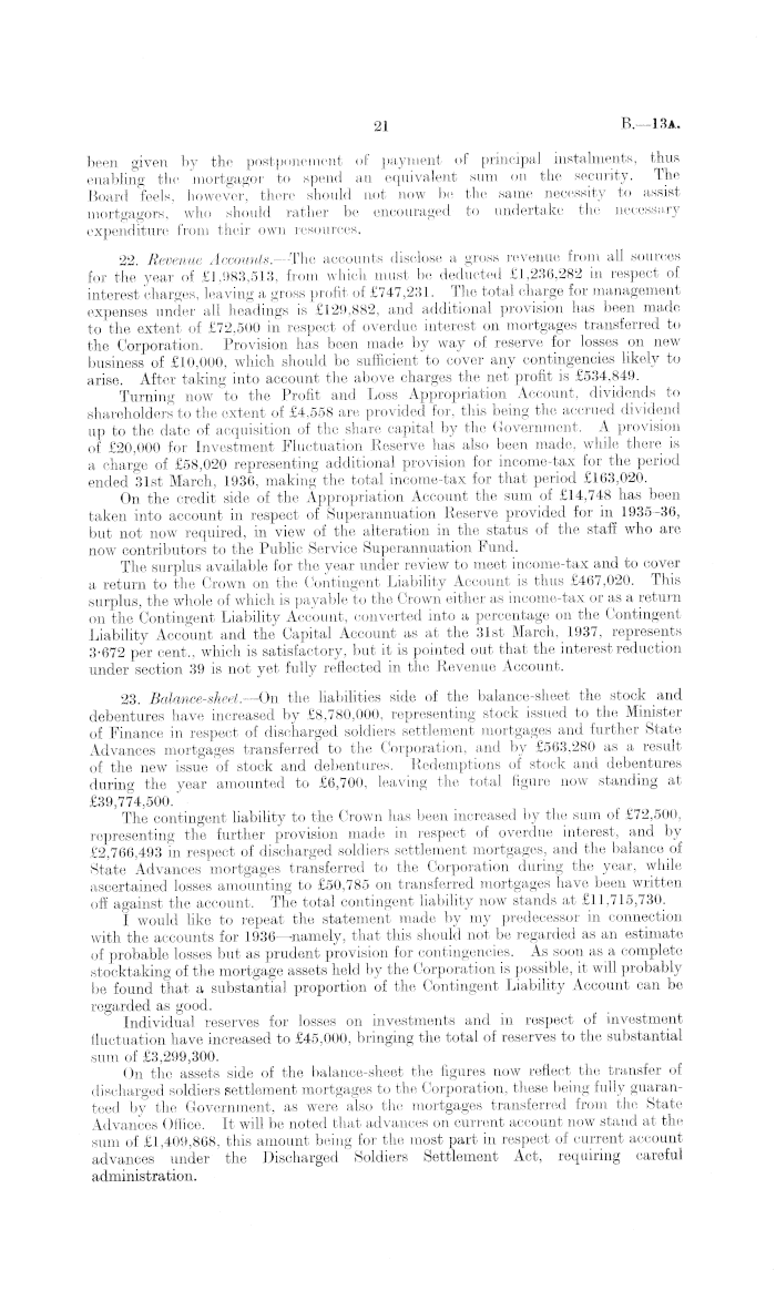 been given by the postponement of payment of principal instalments, thus enabling the mortgagor to spend an equivalent sum on the security. The Board feels, however, there should not now be the same necessity to assist mortgagors, who should rather be encouraged to undertake the necessary expenditure from their own resources. 22. Revenue Accounts. —The accounts disclose a gross revenue from all sources for the year of £1,983,513, from which must be deducted £1,236,282 in respect of interest charges, leaving a gross profit of £747,231. The total charge for management expenses under all headings is £129,882, and additional provision has been made to the extent of £72,500 in respect of overdue interest on mortgages transferred to the Corporation. Provision has been made by way of reserve for losses on new business of £10,000, which should be sufficient'to cover any contingencies likely to arise. After taking into account the above charges the net profit is £534,849. Turning now to the Profit and Loss Appropriation Account, dividends to shareholders to the extent of £4,558 are provided for, this, being the accrued dividend up to the date of acquisition of the share capital by the Government. A provision of £20,000 for Investment Fluctuation Reserve has also been made, while there is a charge of £58,020 representing additional provision for income-tax for the period ended 31st March, 1936, making the total income-tax for that period £163,020. On the credit side of the Appropriation Account the sum of £14,748 has been taken into account in respect of Superannuation Reserve provided for in 1935—36, but not now required, in view of the alteration in the status of the staff who are now contributors to the Public Service Superannuation Fund. The surplus available for the year under review to meet income-tax and to cover a return to the Crown on the Contingent Liability Account is thus £467,020. This surplus, the whole of which is payable to the Crown either as income-tax or as a return on the Contingent Liability Account, converted into a percentage on the Contingent Liability Account and the Capital Account as at the 31st March, 1937, represents 3-672 per cent., which is satisfactory, but it is pointed out that the interest reduction under section 39 is not yet fully reflected in the Revenue Account. 23. Balance-sheet.—-On the liabilities side of the balance-sheet the stock and debentures have increased by £8,780,000, representing stock issued to the Minister of Finance in respect of discharged soldiers settlement mortgages and further State Advances mortgages transferred to the Corporation, and by £563,280 as a result of the new issue of stock and debentures. Redemptions of stock and debentures during the year amounted to £6,700, leaving the total figure now standing at £39,774,500.' The contingent liability to the Crown has been increased by the sum of £72,500, representing the further provision made in respect of overdue interest, and by £2,766,493 in respect of discharged soldiers settlement mortgages, and the balance of State Advances mortgages transferred to the Corporation during the year, while ascertained losses amounting to £50,785 on transferred mortgages have been written off against the account. The total contingent liability now stands at £11,715,730. I would like to repeat the statement made by my predecessor in connection with the accounts for 1936—namely, that this should not be regarded as an estimate of probable losses but as prudent provision for contingencies. As soon as_a complete stocktaking of the mortgage assets held by the Corporation is possible, it will probably be found that a substantial proportion of the Contingent Liability Account can be regarded as good. Individual reserves for losses on investments and in respect of investment fluctuation have increased to £45,000, bringing the total of reserves to the substantial sum of £3,299,300. On the assets side of the balance-sheet the figures now reflect the transfer of discharged soldiers settlement mortgages to the Corporation, these being fully guaranteed by the Government, as were also the mortgages transferred from the State Advances Office. It will be noted that advances on current account now stand at the sum of £1,409,868, this amount being for the most part in respect of current account advances under the Discharged Soldiers Settlement Act, requiring careful administration.
