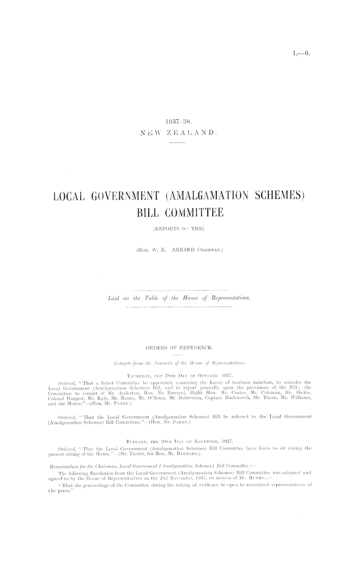 Extracts from the Journals of the House of Representatives. Thursday, the 28th Day of October, 1937. Ordered, " That a Select Committee be appointed, consisting (by leave) of fourteen members, to consider the Local Government (Amalgamation Schemes) Bill, and to report generally upon the provisions of the Bill; the Committee to consist of Mr. Anderton, Hon. Mr Barnard, Right Hon. Mr. Coates, Mr. Coleman, Mr. Dickie, Colonel Hargest, Mr. Kyle, Mr. Munro, Mr. O'Brien, Mr. Robertson, Captain Rushworth, Mr. Thorn, Mr. Williams, and the Mover." —(Hon.-Mr. Parry.) Ordered, " That the Local Government (Amalgamation Schemes) Bill be referred to the Local Government (Amalgamation Schemes) Bill Committee." —(Hon. Mr. Parry.) Tuesday, the 30th Day of November, 1937. Ordered, "That the Local Government (Amalgamation Schemes) Bill Committee have leave to sit during the present sitting of the House."—(Mr. Thorn, for Hon. Mr. Barnard.) Memorandum for the Chairman, Local Government ( Amalgamation Schemes) Bill Committee :— The following Resolution from the Local Government (Amalgamation Schemes) Bill Committee was adopted and agreed to by the House of Representatives on the 2nd November, 1937, on motion of Mr. Munro, — " That the proceedings of the Committee during the taking of evidence be open to accredited representatives of the press."