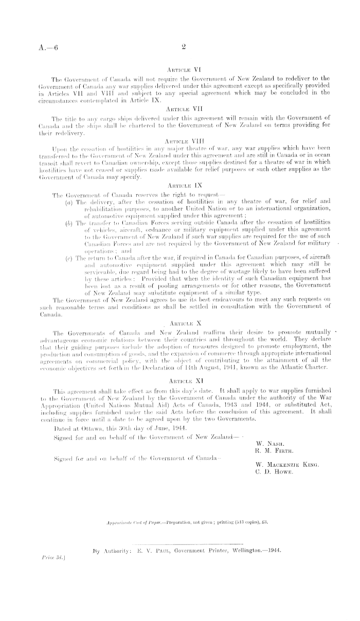 CANADIAN-NEW ZEALAND MUTUAL AID AGREEMENT BETWEEN THE GOVERNMENTS OF CANADA AND NEW ZEALAND ON THE PRINCIPLES APPLYING TO THE PROVISION BY CANADA OF CANADIAN WAR SUPPLIES TO NEW ZEALAND UNDER THE WAR APPROPRIATION (UNITED NATIONS MUTUAL AID) ACTS OF CANADA, 1943 AND 1944, SIGNED AT OTTAWA, 30th JUNE, 1944, Appendix to the Journals of the House of Representatives, 1944 Session I, A-06