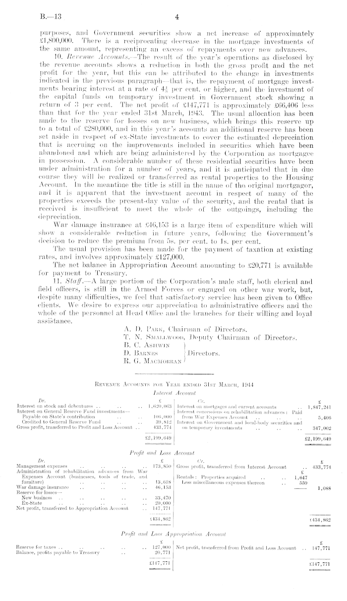 purposes, and Government securities show a net increase of approximately £1,800,000. There is a reciprocating decrease in the mortgage investments of the same amount, representing an excess of repayments over new advances. 10. Revenue Accounts.—The result of the year's operations as disclosed by the revenue accounts shows a reduction in both the gross profit and the net profit for the year, but this can bo attributed to the change in investments indicated in the previous paragraph—that is, the repayment of mortgage investments bearing interest at a rate of 4-J- per cent, or higher, and the investment of the capital funds on temporary investment in Government stock showing a return of 3 per cent. The net profit of £147,771 is approximately £66,406 less than that for the year ended 31st March, 1943. The usual allocation has been made to the reserve for losses on new business, which brings this reserve up to a total of £280,000, and in this year's accounts an additional reserve has been set aside in respect of ex-State investments to cover the estimated depreciation that is accruing on the improvements included in securities which have been abandoned and which are being administered by the Corporation as mortgagee in possession. A considerable number of these residential securities have been under administration for a number of years, and it is anticipated that in due course they will be realized or transferred as rental properties to the Housing Account. In the meantime the title is still in the name of the original mortgagor, and it is apparent that the investment account in respect of many of the properties exceeds the present-day value of the security, and the rental that is received is insufficient to meet the whole of the outgoings, including the depreciation. War damage insurance at £46,153 is a large item of expenditure which will show a considerable reduction in future years, following the Government's decision to reduce the premium from ss. per cent, to Is. per cent. The usual provision has been made for the payment of taxation at existing rates, and involves approximately £127,000. The net balance in Appropriation Account amounting to £20,771 is available for payment to Treasury. 11. Staff. —A large portion of the Corporation's male staff, both clerical and field officers, is still in the Armed Forces or engaged on other war work, but, despite many difficulties, we feel that satisfactory service has been given to Office clients. We desire to express our appreciation to administrative officers and the whole of the personnel at Head Office and the branches for their willing and loyal assistance. A. I). Park, Chairman of Directors. T. N. Smallwood, Deputy Chairman of Directors. B. C. Ashwin | D. Barnes Directors. B. G. Macmoiuian >
