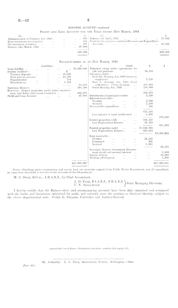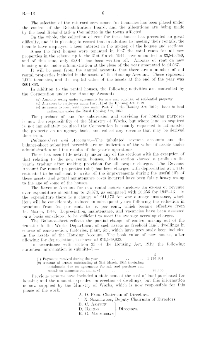 The selection of the returned servicemen for tenancies has been placed, under the control of the Rehabilitation Board, and the allocations are being made by the local Rehabilitation Committee in the towns affected. On the whole, the collection of rent for these houses has presented 110 great difficulty, and it is pleasing to record that in addition to meeting their rentals, the tenants have displayed a keen interest in the upkeep of the houses and sections. Since the first houses were tenanted in 1937 the total rents for all new properties in the scheme up to the 31st March, 1944, have amounted to £3,845,340, and of this sum, only £2,014 has been written off. Arrears of rent on new housing units under administration at the close of the year amounted to £4,567. It will be seen from the annual accounts that there are a number of old rental properties included in the assets of the Housing Account. These represent 1,002 tenancies, and the capital value of the assets at the end of the year was £601,863. In addition to the rental houses, the following activities are controlled by the Corporation under the Housing Account: — (a) Amounts owing under agreements for sale and purchase of residential property. (b) Advances to employers under Part 111 of the Housing Act, 1919. (c) Advances to local authorities under Part V of the Housing Act, 1919 ; loans to local authorities under the Rural Housing Act, 1939. The purchase of land for subdivision and servicing for housing purposes is now the responsibility of the Ministry of Works, but where land so acquired is not immediately required the Corporation is usually requested to administer the property on an agency basis, and collect any revenue that may be derived therefrom. Balance-sheet and Accounts—The tabulated revenue accounts and the balance-sheet submitted herewith are an indication of the value of assets under administration and the results of the year's operations. There has been little activity under any of the sections with the exception of that relating to the new rental houses. Each section showed a profit on the year's trading after making provision for all proper charges. The Revenue Account for rented properties (old) has been charged with depreciation at a rate estimated to be sufficient to write off the improvements during the useful life of these assets, and actual maintenance costs incurred have been fairly heavy owing to the age of some of the houses. The Revenue Account for new rental houses discloses an excess of revenue over expenditure amounting to £8,873, as compared with £6,256 for 1942-43. In the expenditure there is a charge of £41,173 for war damage insurance, which item will be considerably reduced in subsequent years following the reduction in premium from ss. per cent, to Is. per cent., which became effective from Ist March, 1944. Depreciation, maintenance, and vacancies have been assessed on a basis considered to be sufficient to meet the average accruing charges. The Balance-sheet reflects the partial change of control arising out of the transfer to the Works Department of such assets as freehold land, dwellings in course of construction, factories, plant, &c., which have previously been included in the assets of the Housing Account. The book value of new houses, after allowing for depreciation, is shown at £19,969,923. In accordance with section 35 of the Housing Act, 1919, the following statistical information is submitted:— £ (1) Payments received during the year .. .. .. 1,176,801 (2) Amount of arrears outstanding at 31st March, 1944 (including instalments due 011 agreements for sale and purchase and rentals on tenancies old and new) .. .. .. 26,783 Previous reports have included a statement of the cost of land purchased for housing and the amount expended on erection of dwellings, but this information is now supplied by the Ministry of Works, which is now responsible for this phase of the work. A. D. Park, Chairman of Directors. T. N. Smallwood, Deputy Chairman of Directors. B. C. Ashwin D. Barnes J- Directors. R. G. MacmorranJ