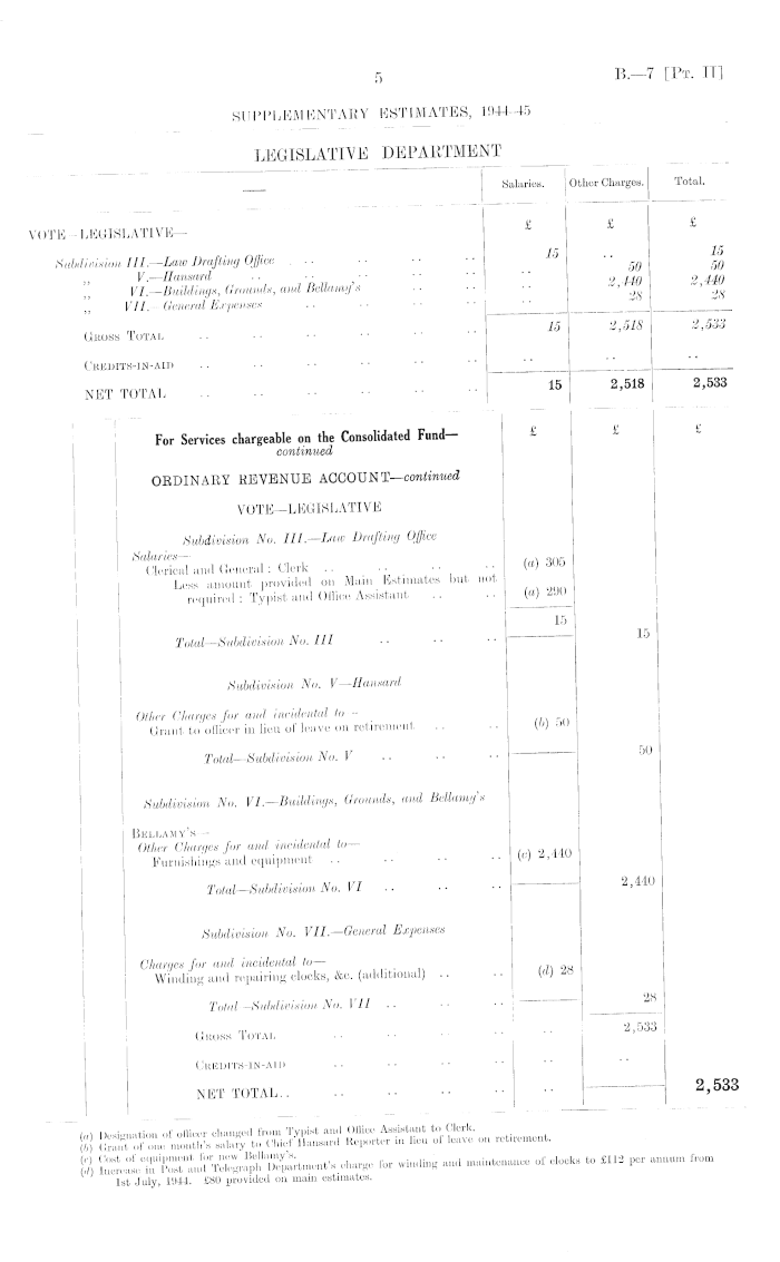 Salaries. Othor Charges. Total. £ £ £ VOTE—LEGISLATIVE— IK 15 Subdivision III—Law Drafting Office ... •• •• " 50 50 ,, V. — Hansard ■ ■ ' ■ , - ' '" 2 440 2 44() VI.—Buildings, Grounds, and Bellamy s ■■ ■■ ■■ > ' VII. — General Expenses . • • • ■ • ■ • J , .. ~ ' 15 2,518 2,533 GROSS Total Ceedits-in-aid .. •• ■• •■ •■ " '_'_ 15 2,518 2,533 NET TOTAL p p £ For Services chargeable on the Consolidated Fund— continued OEDINAEY REVENUE ACCOUNT— continued VOTE—LEGISLATIVE Subdivision No. Ill—Law Drafting Office Salaries — ,, oak Clerical and General : Clerk . . ... • • • • W Mo Less amount provided on Main Estimates but not required : Typist and Office Assistant .. • • W £M 15 Total—Subdivision No. HI • • • • Subdivision No. V—Hansard Other Charges for and incidental to— Grant to officer in lieu of leave on retirement .. ■ • {") JU Total — Subdivision No. V .■ •■ Subdivision No. VI.—Buildings, Grounds, and Bellamy's Bellamy's— Other Charges for and incidental to— Furnishings and equipment .. •• •• ■ • W '* Total—Subdivision No. VI .'. •• •• ~ i 2 > 44:0 ft Subdivision No. VII—General Expenses Charges for and incidental to— Winding and repairing clocks, &c. (additional) .. • • W Total — Subdivision No. VII .. • • ■ • m .... 2,533 Gross Total Credits-in-aid NET TOTAL - •• 2,533
