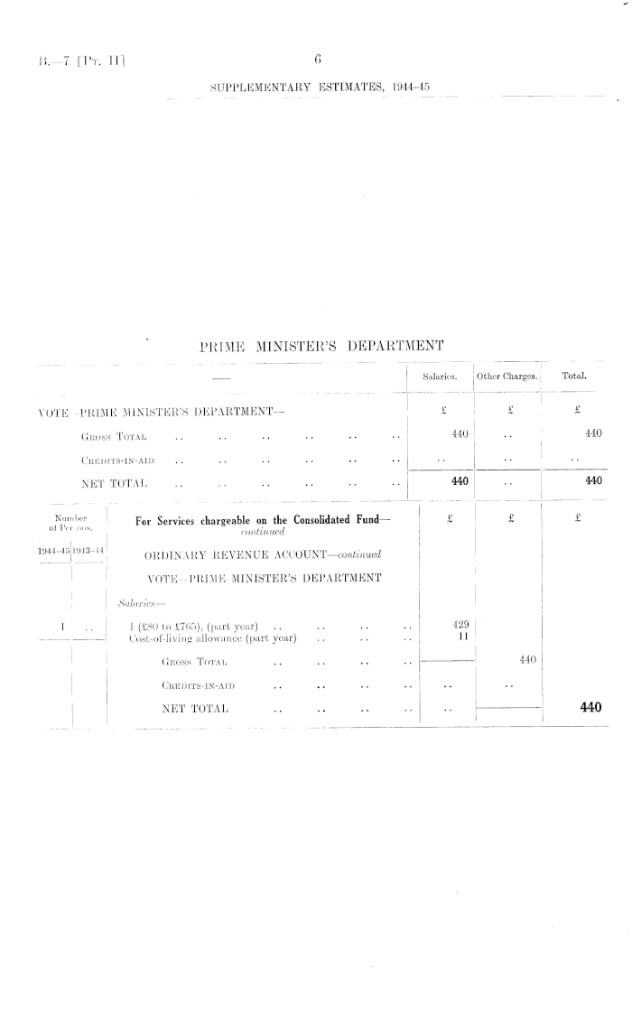 Salaries. Other Charges. Total. VOTE—PRIME MINISTER'S DEPARTMENT— £ £ £ Gross Total 4*0 .. 410 Ceedits-in-aid NET TOTAL 440 .. 440 Number p or Services chargeable on the Consolidated Fund— £ £ £ 01 Pers6ns - continued 1944-451943-44 ORDINARY REVENUE ACCOUNT— continued VOTE-PRIM E MINISTER'S DEPARTMENT Salaries — 1 1 (£80 to £765), (part year) .. .. .. .. 429 ' Cost-of-living allowance (part year) .. .. .. 11 Gross Total .. .. .. .. ■ 440 Credits-in-aid NET TOTAL 440