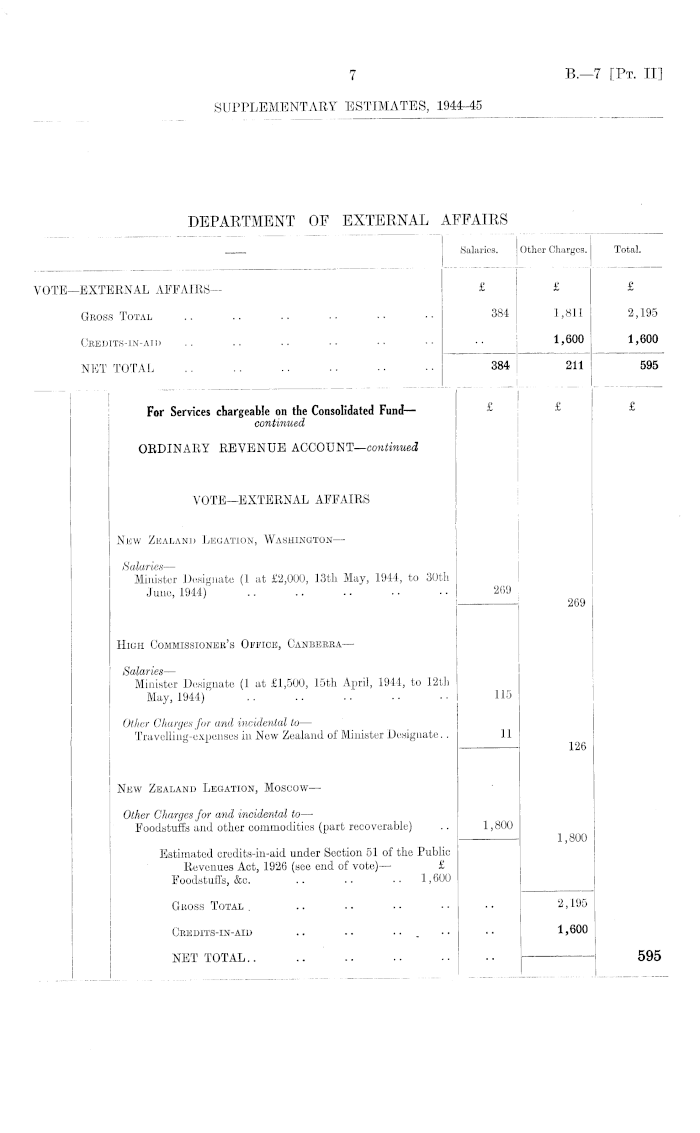 Salaries. Other Charges. Total. VOTE—EXTERNAL AFFAIRS— £ £ £ Gross Total 384 1,811 2,195 Credits-in-aid •• 1.600 1,600 NET TOTAL 384 211 595 For Services chargeable on the Consolidated Fund* — £ £ £ continued ORDINARY REVENUE ACCOUNT— continued VOTE—EXTERNAL AFFAIRS New Zealand Legation, Washington— Minister Designate (1 at £2,000, 13th May, 1944, to 30th June, 1944) 269 269 High Commissioner's Office, Canberra — Minister Designate (1 at £1,500, 15th April, 1944, to 12th May, 1944) 115 Other Charges for and incidental to — Travelling-expenses in New Zealand of Minister Designate. . 11 New Zealand Legation, Moscow — Other Charges for and incidental to — Foodstuff's and other commodities (part recoverable) .. 1,800 1,800 Estimated credits-in-aid under Section 51 of the Public Revenues Act, 1926 (see end of vote) — £ Foodstuffs, &c. .. .. •• 1,600 Gross Total. .. .. •• •• •• 2,195 Credits-in-aid .. .. ... •• •• 1,600 NET TOTAL 595