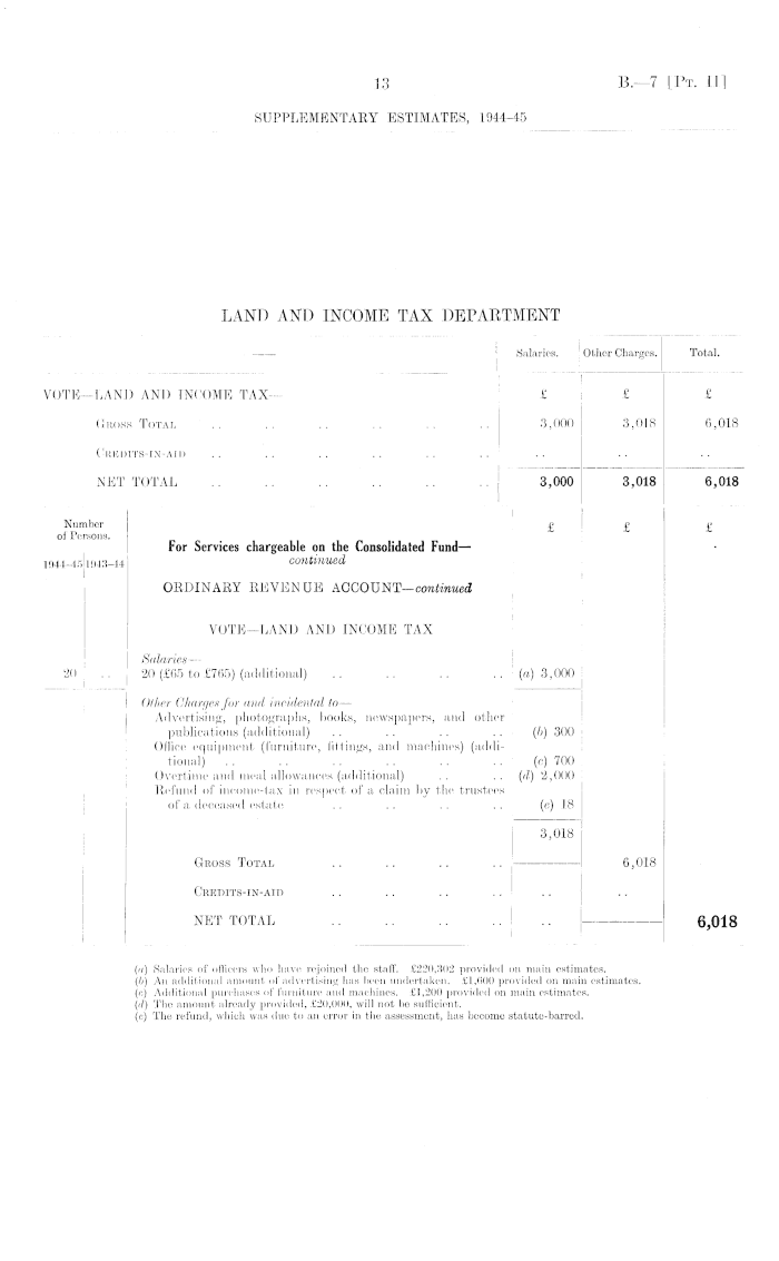 —* . Salaries. Other Charges. Total. VOTE—LAND AND INCOME TAX— £ £ £ Gross Total ' ... .. .. .. .. .. 3,000 3,018 6,018 Credits-in-aid NET TOTAL .. 3,000 3,018 6,018 Number £ £ £ of Persons. For Services chargeable on the Consolidated Fund — 1944-45|l943-44 continued OEDINAEY REVENUE AGGOVJUT—continued VOTE—LAND AND INCOME TAX Salaries — 20 .. 20 (£65 to £765) (additional) .. .. .. .. (a) 3,000 Other Charges for and incidental to — Advertising, photographs, books, newspapers, and other [ publications (additional) .. .. .. .. < (b) 300 Office equipment (furniture, fittings, and machines) (additional) .. . . .. . . . . .. (c) 700 Overtime and meal allowances (additional) .. ..(d) 2,000 Refund of income-tax in respect of a claim by the trustees of a deceased estate .. . . .. .. (e) 18 3,018 Gross Total .. .. .. .. — 6,018 Cbbdits-in-aid .. .. .. NET TOTAL 6,018