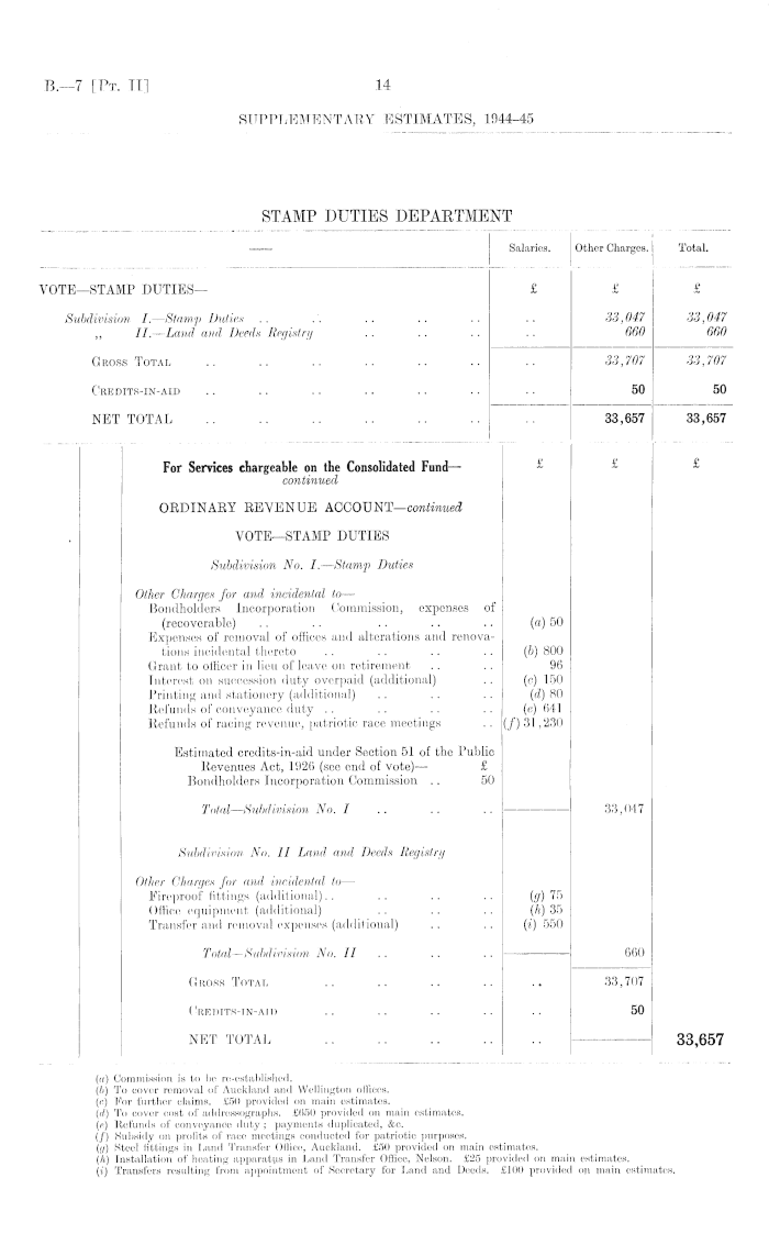 (a) Commission is to bo re-established. (b) To cover removal of Auckland and Wellington offices. (c) For further claims. £50 provided on main estimates. (d) To cover cost of addressographs. £650 provided on main estimates. (e) Refunds of conveyance duty; payments duplicated, &o. (/) Subsidy on profits of race meetings conducted for patriotic purposes. ((/) Steel fittings in Land Transfer Office, Auckland. £50 provided on main estimates. (h) Installation of heating apparatus in Land Transfer Office, Nelson. £25 provided on main estimates. (i) Transfers resulting from appointment of Secretary for Land and Deeds. £100 provided on main estimates.