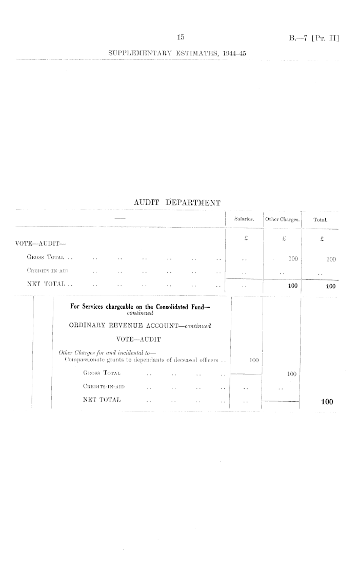 Salaries. Other Charges. Total. £ £ £ VOTE—AUDITGROSS Total .. .. .. .. .. .. .. ,, 100 100 Ceedits-in-aid NET TOTAL ~ 100 For Services chargeable on the Consolidated Fund— continued OEDINARY EEVENUE ACCOUNT— continued VOTE—AUDIT Other Charges for and incidental to — Compassionate grants to dependants of deceased officers . . 100 Gross Total .. .. .. .. : 100 Credits-in-aid NET TOTAL 10 0