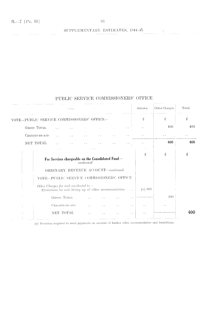 Salaries. Other Charges. Total. VOTE—PUBLIC SERVICE COMMISSIONERS' OFFICE— £ £ £ Gross Total .. .. ■ • ■ • • • • ■ • 400 400 Credits-in-aid NET TOTAL .. .. .. • • • • • • • • 400 400 £ £ £ For Services chargeable on the Consolidated Fund —■ continued ORDINARY REVENUE ACCOUNT—continued VOTE—PUBLIC SERVICE COMMISSIONERS' OFFICE Other Charges for and incidental to — Alterations to and fitting up of office accommodation .. (a) 400 Gross Total .. .. .. • • 400 Credits-in-aid j NET TOTAL .. •• — 400 (a) Provision required to meet payments on account of further office accommodation and furnishings.