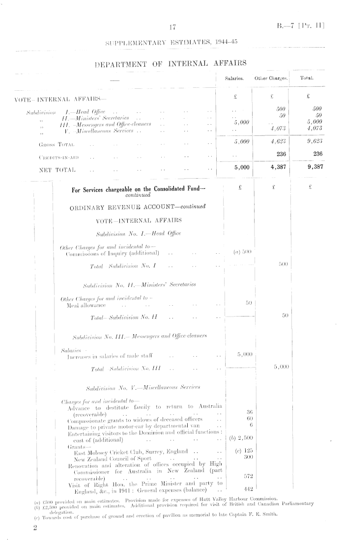 j Salaries. Other Charges. J Total. VOTE—INTERNAL AFFAIRS— £ £ £ Subdivision I ■ —Head Office .. . • • ■ • • • • • • II.—Ministers' Secretaries .. .. ■ ■■ ■ ■ ■>" III—Messengers and Office-cleaners .. .. •• ' ' A/yyi V. —Miscellaneous Services .. ■■ ■■ ■■ <1,0/<5 GROSS TOTAI 9,623 Credits-IN-AID •• > •• 236 236 NET TOTAL .. •• 5,000 4,387 9,387 For Services chargeable on the Consolidated Fund — £ 1 1 continued ORDINARY REVENUE ACCOUNT —continued VOTE—INTERNAL AFFAIRS ! Subdivision No. I. —Head Office Other Charges for and incidental to — J Commissions of Inquiry (additional) .. • • • ■ (a) 500 Total —Subdivision No, I ■ ■ ■ ■ ■ ■ Subdivision No. 11 .—Ministers' Secretaries Other Charges for and incidental to — Meal allowance .. • • • • • ■ ■ • i Total —Subdivision No. II ■ ■ • ■ • • ®0 Subdivision No. III.—Messengers and Office-cleaners Salaries — Increases in salaries of male staff .. • • • • J > OUU Total —Subdivision No. Ill ■■ ■■ • • j 5,000 Subdivision No. V. —Miscellaneous Services Charges for and incidental to — Advance to destitute family to return to Australia (recoverable) .. • • •• • • 36 Compassionate grants to widows of deceased officers . . WJ Damage to private motor-car by departmental van .. 6 Entertaining visitors to the Dominion and official functions . cost of (additional) .. • ■ • • ■ ■ (b) 2,500Grants — East Molesey Cricket Club, Surrey, England .. .. (c) iio New Zealand Council of Sport .. • • ■ 300 Renovation and alteration of offices occupied by High Commissioner for Australia in New Zealand (part recoverable) . • • • • • • • • • Visit of Right Hon. the Prime Minister and party to j England, &c., in 1941 : General expenses (balance) .. 442