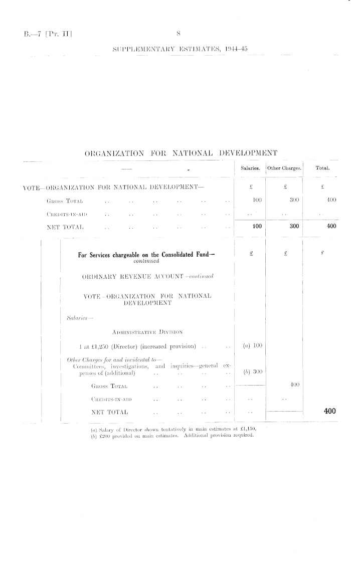 (a) Salary of Director shown tentatively in main estimates at £1,150. (b) £200 provided on main estimates. Additional provision required.