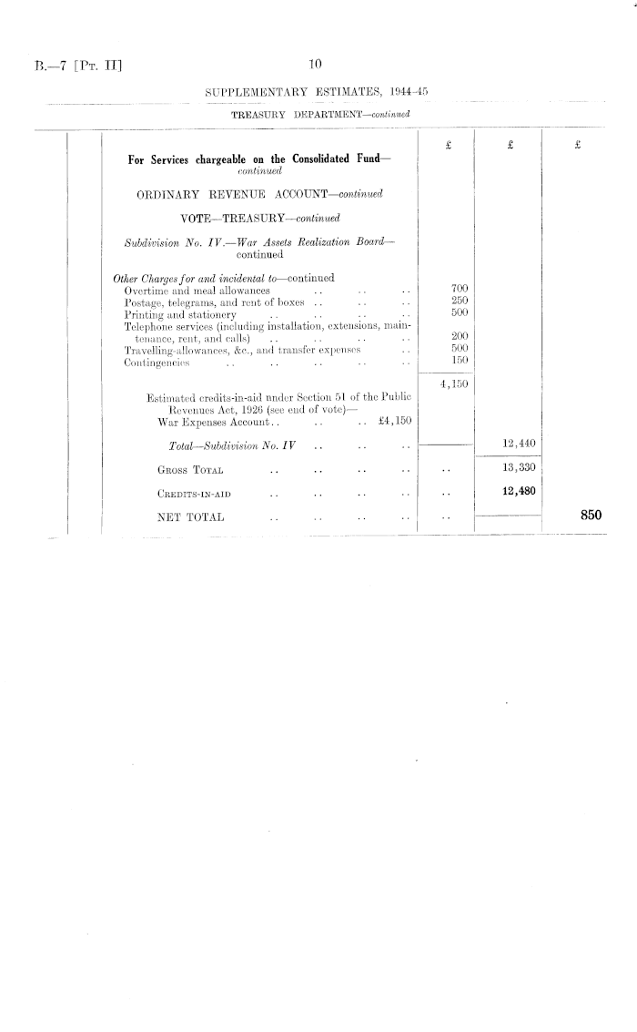 £ £ £ For Services chargeable on the Consolidated Fund — continued ORDINARY REVENUE ACCOUNT —continued VOTE —TREASURY —continued Subdivision No. IV. —War Assets Realization Board —- continued Other Charges for and incidental to—continued Overtime and meal allowances .. .. • • 700 Postage, telegrams, and rent of boxes .. .. ■ • 250 Printing and stationery .. .. ■ • • ■ 500 Telephone services (including installation, extensions, maintenance, rent, and calls) .. .. . ■ • • 200 Travelling-allowances, &c., and transfer expenses .. 500 Contingencies .. .. ■ ■ • • ■ ■ 150 4,150 Estimated credits-in-aid nnder Section 51 of the Public Revenues Act, 1926 (see end of vote) — War Expenses Account.. .. . • £4,150 Total —Subdivision No. IV .. . • •• 12,440 GROSS Total .. .. ■• • • • • 13 > 330 Credits-in-aid .. .. •• •• 12,480 NET TOTAL 850