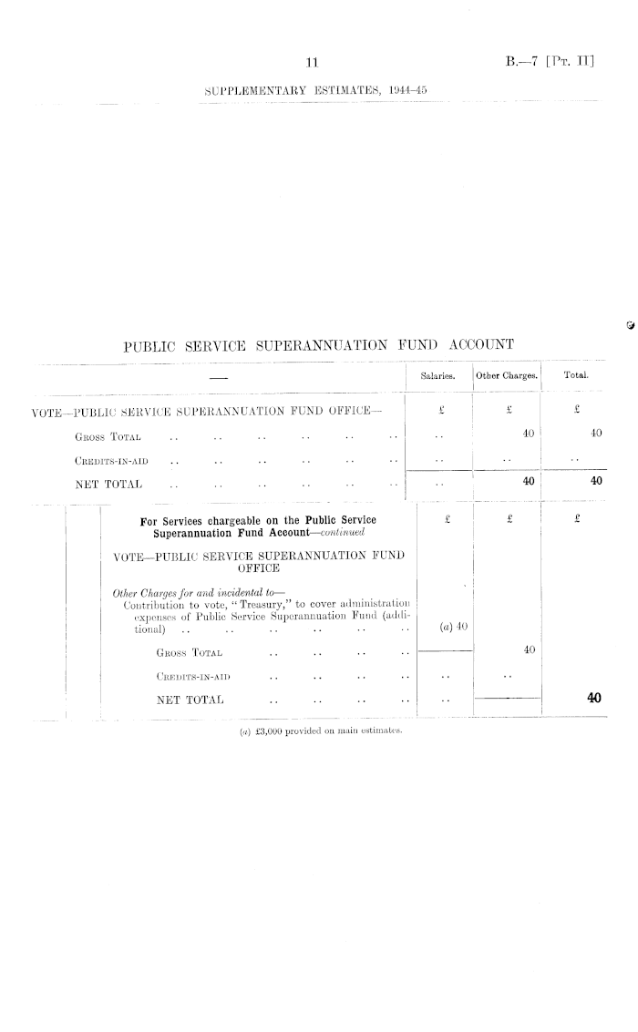 Salaries. Other Charges. Total. VOTE—PUBLIC SERVICE SUPERANNUATION FUND OFFICE— £ £ £ Gboss Total • • 40 40 Credits-in-aid NET TOTAL .. .. • • 40 40 For Services chargeable on the Public Service £ £ £ Superannuation Fund Account — continued VOTE—PUBLIC SERVICE SUPERANNUATION FUND OFFICE Other Charges for and incidental to — Contribution to vote, " Treasury," to cover administration expenses of Public Service Superannuation Fund (additional) .. .. .. • • •• • ■ («) 40 Gross Total .. .. '. • • • 40 Ceedits-in-aid NET TOTAL •. • • 40 (a) £3,000 provided on main estimates.
