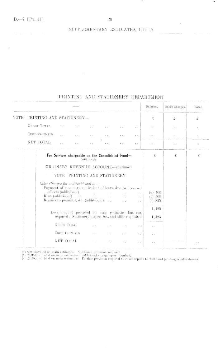 Salaries. Other Charges, Total. VOTE—PRINTING AND STATIONERY— £ £ £ Gross Total .. .. Credjts-in-aid NET TOTAL .. .. .. ' .. .. ~7 For Services chargeable on the Consolidated Fund— £ £ £ continued ORDINARY REVENUE ACCOUNT— continued VOTE—PRINTING AND STATIONERY Other Charges for and incidental to — Payment of monetary equivalent of leave due to deceased officers (additional) .. . . .. .. {a) 100 Rent (additional) . . .. .. . . . . (b) 500 Repairs to premises, &c. (additional) .. . . . . (c) 825 1,425 Less amount provided on main estimates but not required : Stationery, paper, &c, and office requisites 1,425 Gross Total Crudits-in-aid NET TOTAL .. .. .. .. ..